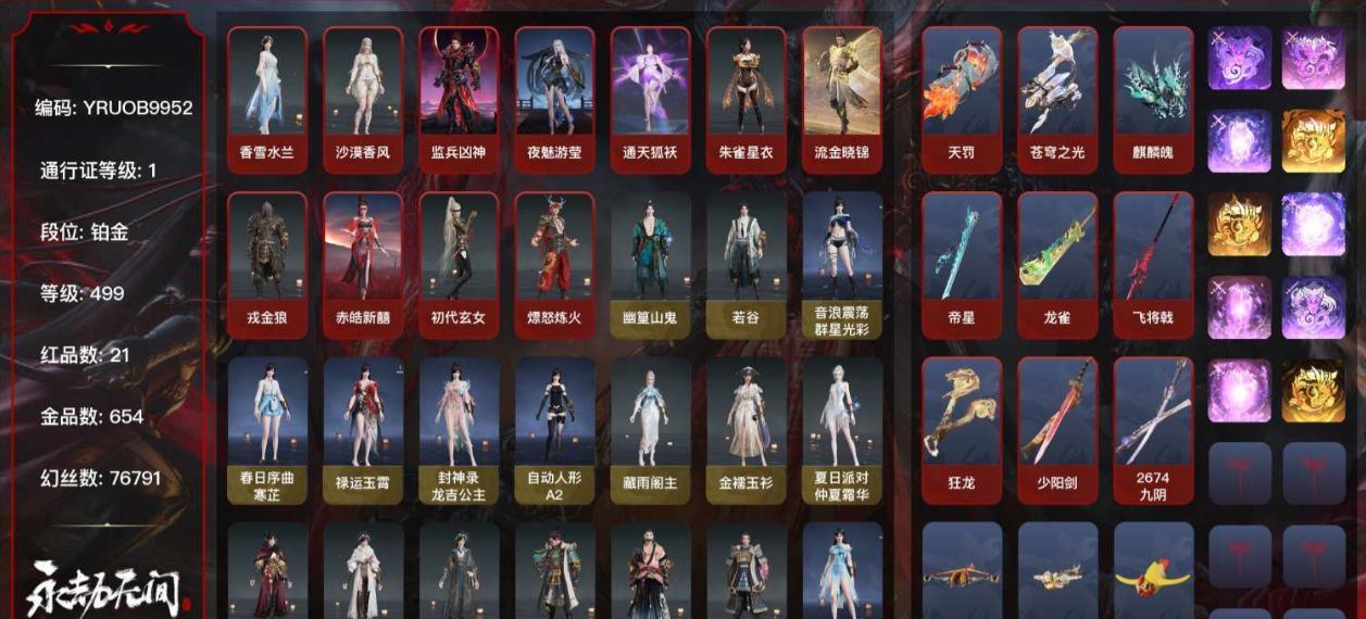 【账号佳】 【网易】【手机】21红654金, 技能奥义1, 总收藏值397643, 幻丝76791, 等级499, 三排铂金1, 通行证未升级Lv.1, 双马尾女双马尾男, 21红色神品: 赤皓新囍/初代玄女/朱雀星衣/戎金狼/熛怒炼火/香雪水兰/沙漠香风/监兵凶神/夜魅游莹/通天狐袄/流金晓锦/麒麟魄/少阳剑/2674九阴/帝星/龙雀/飞将戟/狂龙/天罚/苍穹之光/墨离, 【技能奥义】 雪霜姿宁红夜: 赤皓新囍/初代玄女/山川润/倒反阴阳炽羽/夜华朝/相柳/紫金玉女/耀世魂花/2B/碧水青天/九阴圣女/红川仙子/簪缨发/云霞发/双马尾女沈妙: 朱雀星衣/絮云衣/悠竹萌客/腓腓/咏春/奥村春NOIR/涂鸦少女/千丝发/百灵发/娇憨发/NOIR发型/双马尾女天海: 白熊/若水尊者/自在发/双马尾男殷紫萍: 福寿仙/鹅黄纱梦/萍之缘/沐昭/瑶光沐月/紫芙发/暖绒发/双马尾女特木尔: 戎金狼/多闻天王/路奇迷踪/唐三/龙虎斗/海神发/双马尾男季沧海: 熛怒炼火/染烟/不良人李星云/康复之星/杰洛特/鹧鸪天/江海沧澜/瑞火麟/椰风夕照/孽炎祸斗/游四海/腾烟发/江海发/炮炼发/白狼发/不如吾发/双马尾男胡桃: 山吹茶/小可/晨风/御宅罗梦/清雅少女/春桃笑/主祭者/贵胄少女/阴阳姬/樱舞发/月丹发/木棉发/月下香发/双马尾女妖刀姬: 神罚之光/朔夜游方/赤影妖刀姬崔三娘: 汐泪/暗沼摩罗/巨鲸客/文鳐/赤雾烟霞/怒浪/弄潮发/鲸海发/冷傲发/双马尾女岳山: 尼尔/铁面/金戈止/过江龙/弘毅袍/汉光/觅封侯发/玄鳞发/双马尾男无尘: 司天命/雨宫莲JOKER/申公豹/喜乐祥羽/幽篁山鬼/若谷/竹律发/JOKER发型顾清寒: 香雪水兰/龙吉公主/禄运玉霄/寒芷/群星光彩/A2/仲夏霜华/藏雨阁主/金襦玉衫/赤丹朱湛/寒英素雪/玄青郁离/灵儿发/冰凌发/霜天发/绯霜发/红鸾星发/双马尾女武田信中: 苍雷丸/花之倾奇/麟鹿大铠/阎摩发/忠嘉发/双马尾男迦南: 沙漠香风/胡旋女/蕾雅/不知火舞/凛冬/观山海青鸟/浣烟纱/惊云羽/青鸾发/女忍发/双马尾女胡为: 监兵凶神/行空裘/福瑞天泽/蛤蟆头领/悟空/秋神蓐收/不败擂主/英雄袍/斑斓衣/天刑发/双马尾男季莹莹: 夜魅游莹/冬无归/炽火照夜/盛夏白阳/持国天王/冬神玄冥/冥泉发/流萤发/幽焰发/双马尾女玉玲珑: 通天狐袄/妲己/春不敛/广目天王/黄昏巫主/笼烟芍药发/古溪发/惊雀发/双马尾女哈迪: 天工奥妙/夜绸袍/秀逸发/双马尾男魏轻: 玉脍/寿竹云春/念奴娇/獬豸/极夜发/豪杰发/双马尾女刘炼: 流金晓锦/姜子牙/金财聚辉/仙风发/双马尾男张起灵: 赤焰战灵/山漠狞影/逐影发/双马尾男席拉: 蚀日之辉/雪铃绮歌/暧冬茶馨/日月明/蜜语发/双马尾女蓝梦: 如梦令/蓝兔/灵心/彩云衣/晓梦发/沉醉发/随性发/双马尾女万钧: 双马尾男拳刃: 麒麟魄/天狐/无相印/毛乎乎/诡刃八岐/醒狮长剑: 少阳剑/不良人龙泉剑/亢龙/侠骨清光引/含光承影/壶中日月/湖女之剑/监星尺/福禄双至/紫金宝剑/赤霄/长虹剑/降龙木/隐锋/2674超越型太刀: 2674九阴/切影/天劫/数珠丸/暝视/残阳/毅魂守/金玉一文字/雷赐/鬼切/黑绳横刀: 帝星/尽春锋/烛泪/白鹿阔刀: 龙雀/听涛_/塑梦钥匙/山君怒/纯白约定/赤影妖刀/雷王锯/青石猊/龙蟠斩马刀: 飞将戟/千钧羽/断月影/朱明/潮/麒麟牙枪: 仙彩/委蛇矛/建木/映红锋/灵木角/金神钺/镇山河/长虹棍: 倒马棍/学宫之杖/戒律杖/打狗棒/糖果棍匕首: 三更令/仙舞/判官笔/桡尺刀/猎刃/破劫千刃/马首刀/鹤唳扇: 耀夜流华/腾云歌/蜜蜂小狗/逍遥/铁羽/青峰叠扇双截棍: 狂龙/九霄寒/咯咯/嘶风/夔牛槌/月瞳/精武/衔谷/镇魔杵双刀: 无救/登山镐/破重云/空寒/胧夜狐影/蛋仔派对咸鱼/西摩格镰/诡月链魂双戟: 不归/光影裁决/水衡/衔月飞刀: 不良人华阳针/玄铜飞军/翠影连弩: 千机弩/惊火弦/穿云燕/镇海/雨歇鸟铳: 引冰落/戏祥云/沉默审判/猎犸铳/玉飞梭/石中火/萤火/金蝎/雨幕火炮: 天罚/兔华笼/嘉果花/竹露雳/貔貅吞宝/钻山/雪国礼炮五眼铳: 苍穹之光/丹鹤/凝冰魄/心魔/星追月/梦魇/炉中火/虎踞/赤霞/鹦鹉螺弓箭: 乌木弓/仙毫/日辉/腥红之月/诛神/雅矢/青花/风驰弓一窝蜂: 莲心剑雨喷火筒: 炎魔,各种道具详情看截图、低价出售找回包 赔、截图展示段位不代 表实际段位,如赛季更新等不可抗拒因素发生变化、时限道具不保证所剩时间、标题未写送点劵默认不送【卖号买号首选亿梦】