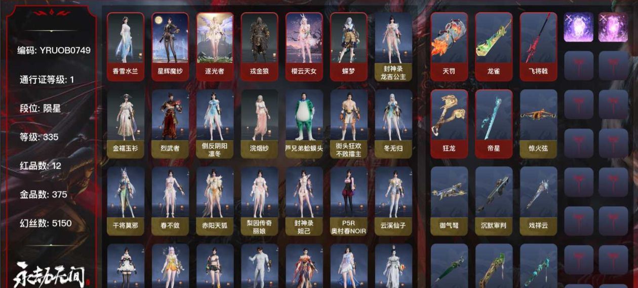 【账号佳】 【网易】【手机】12红375金, 技能奥义2, 总收藏值231291, 幻丝5150, 等级335, 三排陨星4, 通行证未升级Lv.1, 双马尾女双马尾男, 12红色神品: 星辉魔纱/戎金狼/樱云天女/蝶梦/香雪水兰/逐光者/帝星/龙雀/飞将戟/狂龙/天罚/墨离, 【技能奥义】 凶虎/剪纸彩刀宁红夜: 碧水青天/霜天红叶/九阴圣女/双马尾女沈妙: 星辉魔纱/云溪仙子/涂鸦少女/奥村春NOIR/楚韵九歌山鬼/悠竹萌客/娇憨发/NOIR发型/双马尾女天海: 白熊/觉明尊者/九骊之君/八宝龙王/双马尾男殷紫萍: 福寿仙/鹅黄纱梦/天禄瑞光/降香发/暖绒发/双马尾女特木尔: 戎金狼/唐三/追猎/银狼裘/海神发/双马尾男季沧海: 不良人李星云/康复之星/巨阙/杰洛特/鹧鸪天/江海沧澜/醉山川/江海发/白狼发/含锋发/不如吾发/双马尾男胡桃: 樱云天女/蝶梦/小可/星空投影/贵胄少女/清雅少女/阴阳姬/双马尾女妖刀姬: 樱雨刀舞崔三娘: 汐泪/阿娜希塔/暗沼摩罗/赤雾烟霞/冷傲发/双马尾女岳山: 尼尔/铁面/破荆者/过江龙/玄鳞发/双马尾男无尘: 雨宫莲JOKER/申公豹/柳生/黄庭道/灵鹿巫者/JOKER发型/双马尾男顾清寒: 香雪水兰/龙吉公主/金襦玉衫/红鸾星发/双马尾女武田信中: 烈武者/双马尾男迦南: 凛冬/浣烟纱/夕鹰发/双马尾女胡为: 蛤蟆头领/不败擂主/桀骜发/双马尾男季莹莹: 干将莫邪/冬无归/妙音发/缱绻发/幽焰发/双马尾女玉玲珑: 丽娘/赤阳天狐/春不敛/妲己/笼烟芍药发/惊雀发/双马尾女哈迪: 卷王/双马尾男魏轻: 獬豸/念奴娇/极夜天曦/玄冥发/豪杰发/双马尾女刘炼: 姜子牙/金财聚辉/仙风发/虹发/双马尾男张起灵: 云间影/赤焰战灵/山漠狞影/双马尾男席拉: 逐光者/暧冬茶馨/天虹咏/璀璨发/双马尾女蓝梦: 如梦令/蓝兔/沉醉发/蓝发/双马尾女万钧: 【挑染】雷霆客发/双马尾男李寻欢: 双马尾男拳刃: 天狐/毛乎乎/诡刃八岐长剑: 不良人龙泉剑/亢龙/冰魄剑/壶中日月/月光与黑暗/永乐/琴心/紫金宝剑/长虹剑/2674原型太刀: 切影/数珠丸/残阳横刀: 帝星/尽春锋/无韵/白鹿阔刀: 龙雀/破天/赤云之刃/青石猊斩马刀: 飞将戟/三尖两刃刀/千钧羽/璃光星辉环月/麒麟牙枪: 建木/灵木角/镇山河/长虹棍: 孤灯行/幽冥吟/输液架匕首: 仙舞/战栗/桡尺刀/马首刀扇: 耀夜流华/青峰叠扇双截棍: 狂龙/九霄寒/傲骨/嘶风/夔牛槌/精武双刀: 天之刑/怨憎/空寒/蛋仔派对咸鱼/诡月双戟: 曜金紫珀/衔月万仞轮: 穷奇飞刀: 不良人华阳针/玄铜飞军/翠影连弩: 御气弩/惊火弦鸟铳: 戏祥云/沉默审判/石中火/萤火/雨幕火炮: 天罚/貔貅吞宝/造景/钻山五眼铳: 丹鹤/凝冰魄/心魔/鹦鹉螺弓箭: 乌木弓/月虹弦角/腥红之月/诛神/豹胎易筋弓一窝蜂: 莲心剑雨喷火筒: 炎魔,各种道具详情看截图、低价出售找回包 赔、截图展示段位不代 表实际段位,如赛季更新等不可抗拒因素发生变化、时限道具不保证所剩时间、标题未写送点劵默认不送【卖号买号首选亿梦】