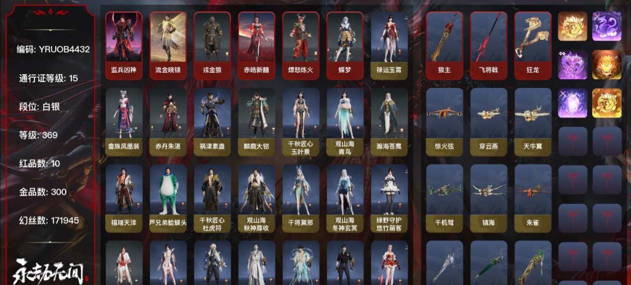 【账号佳】 【网易】【手机】10红300金, 技能奥义1, 总收藏值195614, 幻丝171945, 等级369, 三排白银1, 通行证未升级Lv.15, 10红色神品: 赤皓新囍/戎金狼/熛怒炼火/蝶梦/监兵凶神/流金晓锦/狼主/飞将戟/狂龙/墨离,【技能奥义】 凶虎宁红夜: 赤皓新囍/山川润/碧水青天/九阴圣女沈妙: 紫衣仙子/悠竹萌客/腓腓/娇憨发天海: 九骊之君/八宝龙王殷紫萍: 风雨谐/萍之缘/瑶光沐月特木尔: 戎金狼/银狼裘/红蓝狂想/追猎/苍狼宗主发季沧海: 熛怒炼火/不良人李星云/巨阙/鹧鸪天/江海沧澜/江海发/熛怒发/烈火发/含锋发胡桃: 蝶梦/春桃笑/贵胄少女/清雅少女崔三娘: 怒浪/冷傲发岳山: 杨戬/金戈止/破荆者/过江龙无尘: 黄庭道/申公豹/柳生/JOKER发型顾清寒: 禄运玉霄/凤凰装/赤丹朱湛/绯霜发武田信中: 祸津素盏/麟鹿大铠迦南: 玉叶景/观山海青鸟/瀚海苍鹰/青鸾发/琳琅发胡为: 监兵凶神/杜虎符/福瑞天泽/蛤蟆头领/秋神蓐收/天刑发/疏狂发季莹莹: 干将莫邪/冬神玄冥/宵烛发/缱绻发/冥泉发/幽焰发玉玲珑: 妲己/笼烟芍药发哈迪: 云中君/秀逸发魏轻: 玄冥发/豪杰发刘炼: 流金晓锦/姜子牙/仙风发张起灵: 云间影/山漠狞影席拉: 雪铃绮歌/蜜语发蓝梦: 如梦令/牵云霞发/沉醉发拳刃: 天狐/无相印/毛乎乎长剑: 亢龙/含光承影/壶中日月/福禄双至/2674原型太刀: 切影/念珠丸/数珠丸/毅魂守阔刀: 狼主/听涛_/恶障/破天/青石猊/龙蟠斩马刀: 飞将戟枪: 击苍穹/建木/灵木角/金神钺/长虹棍: 倒马棍/冰辉/学宫之杖/打狗棒/糖果棍匕首: 仙舞/判官笔/桡尺刀/马首刀扇: 叶底花/耀夜流华/腾云歌/青峰叠扇双截棍: 狂龙/嘶风/夔牛槌/镇魔杵/除岁双刀: 怨憎/破重云/祸忌/空寒/美食家/蛋仔派对咸鱼双戟: 光影裁决/水衡/螭龙飞刀: 翠影连弩: 千机弩/天牛翼/惊火弦/朱雀/穿云燕/镇海鸟铳: 戏祥云/石中火/萤火/雨幕火炮: 兔华笼/嘉果花/造景/钻山/雪国礼炮/龙啸五眼铳: 丹鹤/凝冰魄/虎踞/鹦鹉螺弓箭: 乌木弓/月虹弦角/腥红之月/豹胎易筋弓,各种道具详情看截图、低价出售找回包 赔、截图展示段位不代 表实际段位,如赛季更新等不可抗拒因素发生变化、时限道具不保证所剩时间、标题未写送点劵默认不送【卖号买号首选亿梦】