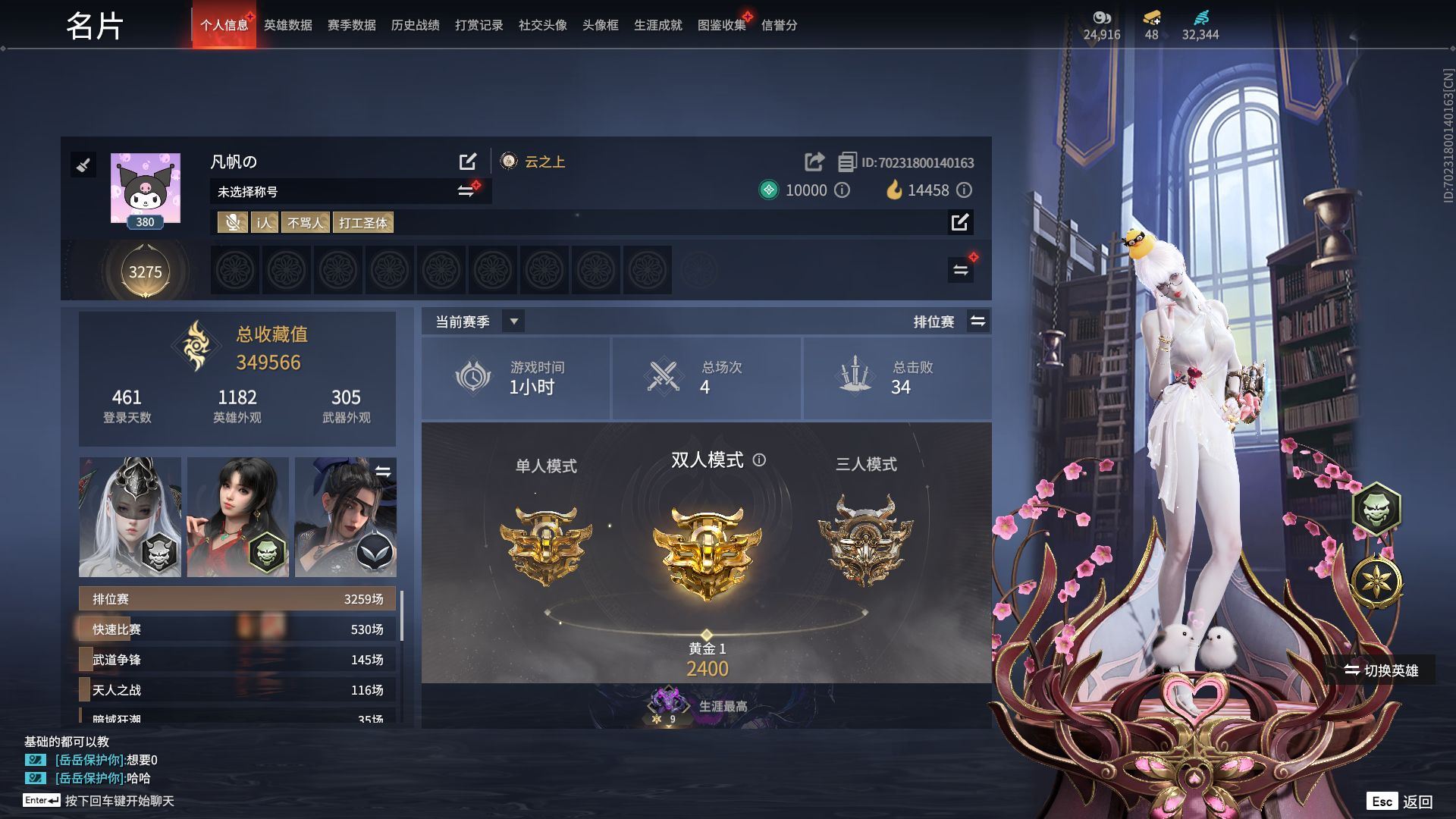 【账号佳】 r51298 网易邮箱,22红751金, 技能奥义3, 总收藏值421689, 幻丝285454, 等级496, 三排黄金1, 通行证未升级Lv.15, 双马尾女双马尾男, 22红色神品: 赤皓新囍/初代玄女/星辉魔纱/戎金狼/熛怒炼火/蝶梦/泣珠龙纱/香雪水兰/绝代风华/通天狐袄/逐光者/寒梅傲雪/少阳剑/太玄之刃/帝星/龙雀/悍虎斩/飞将戟/如意金箍棒/断昼吟/苍穹之光/墨离, 【总收藏值】 421689 【游戏等级】 496 【游戏段位】 单排白银1, 双排陨星2, 三排黄金1 【通行证等级】 通行证未升级Lv.15 【技能奥义】 珥冰/揽九天/荆魂 宁红夜: 赤皓新囍/初代玄女/耀世魂花/夜华朝/红川仙子/紫金玉女/碧水青天/九阴圣女/昆仑圣女/泠川发/簪缨发/云霞发/双马尾女 沈妙: 星辉魔纱/秋藏桂/绮云衫/云溪仙子/咏春/奥村春NOIR/悠竹萌客/娇憨发/韶光发/NOIR发型/双马尾女【2月25号可换绑】,各种道具详情看截图、低价出售找回包 赔、截图展示段位不代 表实际段位,如赛季更新等不可抗拒因素发生变化、时限道具不保证所剩时间、标题未写送点劵默认不送【卖号买号首选亿梦】