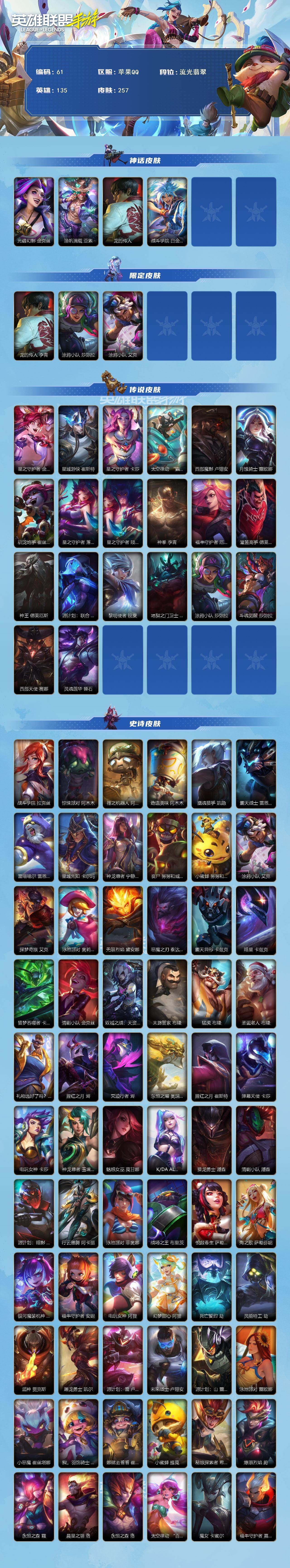 【账号佳】 113英雄 249皮肤 流光翡翠段位 123等级【神话皮肤】:斗魂耀世 德莱文,灰烬骑士 派克,龙的传人 李青,摄魂使者 薇恩,暮星追影 卡莎【限定皮肤】:闭月之颜 貂蝉 卡特琳娜,穿星魔锋 赵信,创星之灵 璐璐,地底世界 崔斯特,关羽 云长 泰达米尔,虎痴之拳 蔚,龙的传人 李青,掠星魔刃 卡萨丁,烈焰美人 薇恩,吕布 奉先 嘉文四世,美猴王 孙悟空,神龙烈焰 金克丝,水晶玫瑰 永恩,水晶玫瑰 蔚,水晶玫瑰 娑娜,山海绘卷 烬,山海绘卷 诺提勒斯,御星魔矢 艾希,养蜂人 辛吉德,斩星魔剑 易,赵云 子龙 赵信,张辽 文远 盖伦【传说皮肤】:暗星女王 拉克丝,斗魂无双 亚索,地狱之门卫士 加里奥,光明哨兵 薇恩,灌篮高手 德莱厄斯,剪胜裁春 格温,灵魂莲华 锤石,神王 德莱厄斯,太空律动 “猫猫”布里和里茨 布里茨,跳跳倩影 厄运小姐,未来战士 凯特琳,星之守护者 金克丝,星域游侠 崔斯特,西部魔影 卢锡安,驯龙炮手 崔丝塔娜,西部天使 艾希,西部天使 赛娜,源计划:净化 薇恩,深海奇域 厄运小姐,战斗学院 伊泽瑞尔,最终BOSS 维迦【史诗皮肤】:暗星 卡兹克,奥术大师 吉格斯,暗星 韦鲁斯,霸天异形 卡兹克,霸天龙神 奥瑞利安·索尔,冰川巨兽 墨菲特,白色死神 韦鲁斯,霸天战车 厄加特,穿星魔锋 赵信,创星之灵 璐璐,晨星之翎 洛,持胡萝卜的雪人 易,苍穹之光 布兰德,地狱火 阿木木,斗魂无双 赵信,弹幕天使 卡莎,电玩女神 卡莎,斗魂无双 尼菈,电玩女神 阿狸,电玩女神 娑娜,地下拳王 李青,电玩上校 库奇,电玩女神 厄运小姐,斗魂无双 德莱文,电玩勇者 锐雯,斗魂无双 艾瑞莉娅,地狱火 加里奥,盗梦暗影 锤石,恶魔之刃 泰达米尔,福牛守护者 菲奥娜【赛季皮肤】:s1光耀之刃,s2光耀之芒,s3光耀之灵,s4光耀之心,s5绯金魅影,s6绯金丽刃,s7绯金战斧,s8绯金鮫灵,s9王牌舰长,s10王牌上将,s11王牌司令,S19冠翎征服者【其他皮肤】:暗黑武士 雷恩加尔,暗黑女武神 黛安娜,暗影 易,冰霜烈焰 安妮,冰霜亚龙 希瓦娜,冰霜之刃 艾瑞莉娅,闭月之颜 貂蝉 卡特琳娜,冰川勇者 伊泽瑞尔,苍穹之光 薇恩,冲击之刃 劫,刺客信条 凯南,超级英雄 凯南,超武乾坤:电弧 凯南,创世魔神 内瑟斯,苍穹之光 韦鲁斯,冲浪高手 辛吉德,斗战胜佛 孙悟空,地底世界 崔斯特,单身贵族 内瑟斯,德莱德莱 德莱文,抵抗军玫瑰 卡特琳娜,鳄霸 雷克顿,绯金魅影 伊芙琳,绯金丽刃 菲奥娜,绯金战斧 德莱文,飞车暴走族 古拉加斯,绯金鲛灵 娜美,风执事 加里奥,光耀之心 奥莉安娜,光耀之刃 泰达米尔【截图或标题展示段位不代表实际段位,赛季更新等不可抗拒因素发生变化、时限道具不保证所剩时间、标题未写送点卷默认不送】