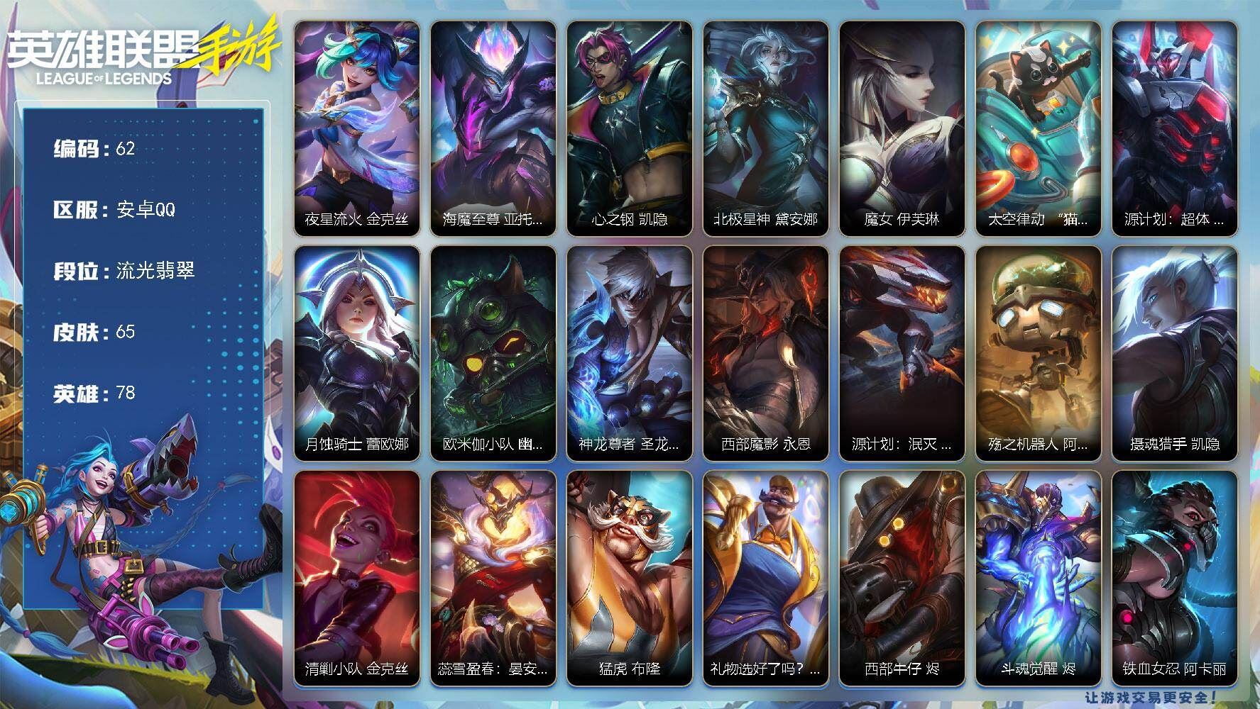 【账号佳】 【可二次实名】可二次安卓QQ 78英雄-65皮肤【神话皮肤】:夜星流火 金克丝【传说皮肤】:海魔至尊 亚托克斯,心之钢 凯隐,北极星神 黛安娜,魔女 伊芙琳,太空律动 “猫猫”布里和里茨 布里茨,源计划:超体 莫德凯撒,月蚀骑士 蕾欧娜,欧米伽小队 幽灵特工 提莫,神龙尊者 圣龙 李青,西部魔影 永恩,源计划:泯灭 雷克顿【史诗皮肤】:殇之机器人 阿木木,摄魂猎手 凯隐,清剿小队 金克丝,蕊雪盈春:晏安 赫卡里姆,猛虎 布隆,礼物选好了吗? 布隆,西部牛仔 烬,斗魂觉醒 烬,铁血女忍 阿卡丽,歌手?不!是主唱! 萨勒芬妮,源计划:阴 劫,星域审判官 卡蜜尔,奈落之炎 凯南,星之守护者 厄运小姐,暗星 墨菲特,欧米伽小队 鬼影蛙人 菲兹,泳池派对 吉格斯,玉剑传说 武剑仙 锐雯,欧米伽小队 天雷爆破手 维迦,玉剑传说 无影 泰隆,星域巫灵 薇古丝,各种道具详情看截图、低价出售找回包 赔、截图展示段位不代 表实际段位,如赛季更新等不可抗拒因素发生变化、时限道具不保证所剩时间、标题未写送点劵默认不送【卖号买号首选亿梦】
