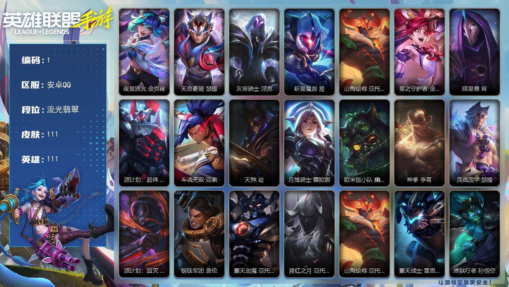 【账号佳】 【可二次实名】可二次安卓QQ 111英雄-111皮肤【神话皮肤】:夜星流火 金克丝,天命豪赌 瑟提,灰烬骑士 派克【限定皮肤】:斩星魔剑 易,山海绘卷 亚托克斯【传说皮肤】:星之守护者 金克丝,暗星尊 烬,源计划:超体 莫德凯撒,斗魂无双 亚索,天煞 劫,月蚀骑士 蕾欧娜,欧米伽小队 幽灵特工 提莫,神拳 李青,灵魂莲华 瑟提,源计划:毁灭 派克【史诗皮肤】:钢铁军团 盖伦,霸天剑魔 亚托克斯,腥红之月 亚托克斯,山海绘卷 亚托克斯,霸天战士 雷恩加尔,地狱行者 孙悟空,星之守护者 奥莉安娜,腥红之月 黛安娜,双城之战:天资 金克丝,猛虎 布隆,礼物选好了吗? 布隆,腥红之月 烬,灰烬领主 奥瑞利安·索尔,东恒之曜 奥瑞利安·索尔,魅惑女巫 莫甘娜,玉剑传说 苍鸾 莫甘娜,K/DA ALL OUT 伊芙琳,猎龙勇士 潘森,未来战士 菲奥娜,战场之王 布里茨,古神 莫德凯撒,源计划:阴 劫,我,羽饰骑士 崔丝塔娜,灵魂莲华 提莫,驯龙女巫 璐璐,雷霆丹心 卡蜜尔,暗星 嘉文四世,福牛守护者 嘉文四世,地下拳王 李青,梦境绅探 凯南,太空律动 “狗头” 内瑟斯,灵魂莲华 永恩,斩星魔剑 易,魅惑女巫 迦娜,灵魂收割者 德莱文,暗星 墨菲特,黑夜使者 弗拉基米尔,天启骑士 杰斯,星之守护者COS 厄加特,猎龙勇士 奥拉夫,鳄霸 雷克顿,欧米伽小队 天雷爆破手 维迦,冰糖葫芦 维迦,星之吞噬者 费德提克,梦游仙境 莉莉娅【赛季皮肤】:s6绯金丽刃,s7绯金战斧,s12龙冕先锋,s14龙冕神策,s15龙冕异士,s16冠翎飞行员,s17冠翎御风使,S19冠翎征服者,各种道具详情看截图、低价出售找回包 赔、截图展示段位不代 表实际段位,如赛季更新等不可抗拒因素发生变化、时限道具不保证所剩时间、标题未写送点劵默认不送【卖号买号首选亿梦】