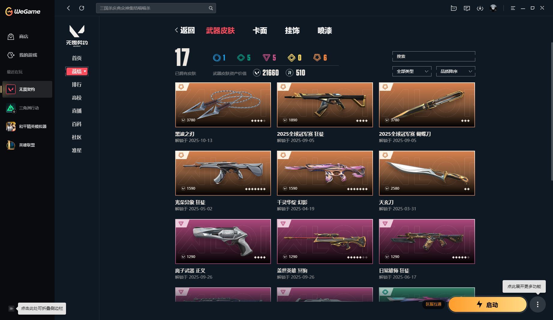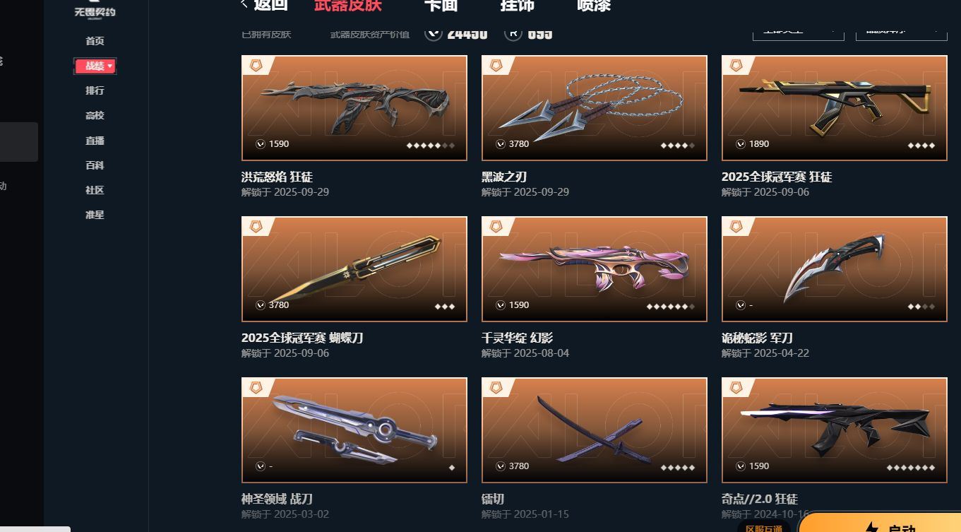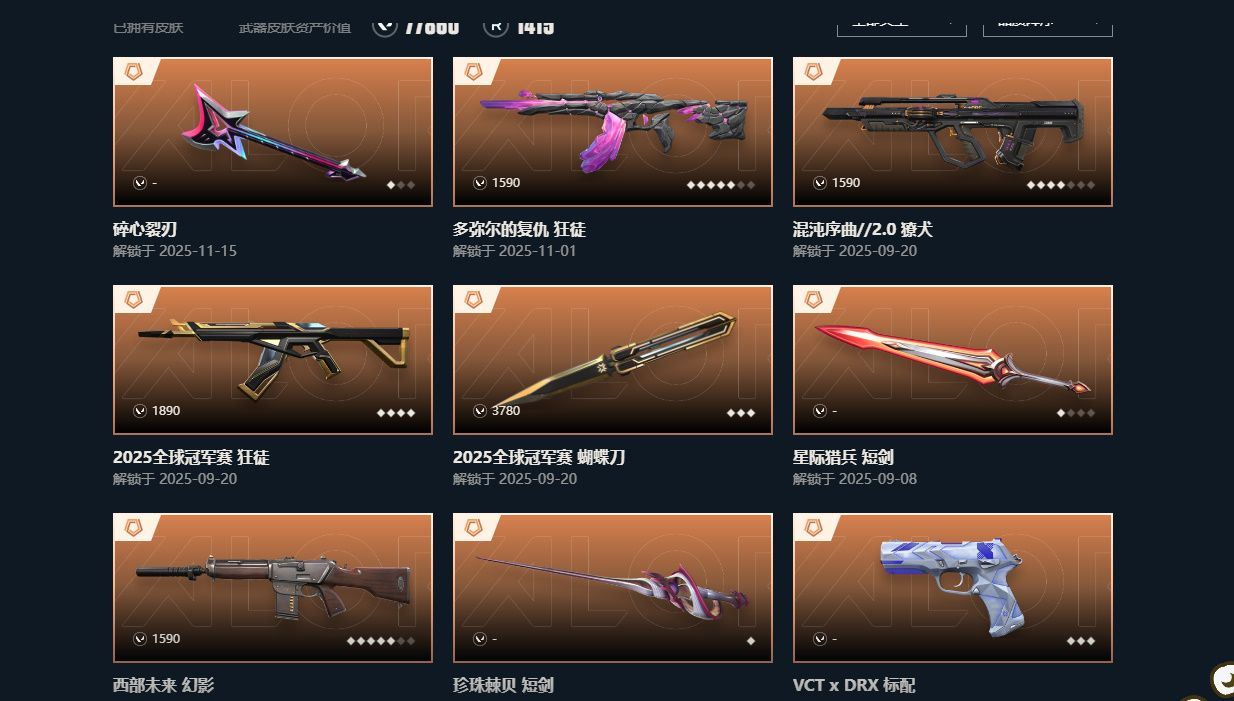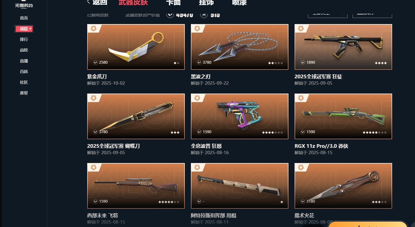 【账号佳】 【可二次实名】【kf3396】qq区71640库存1765r点】黑波之刃,VCT 2025 爪刀,镭切,鬼丸国纲,2021全球冠军赛 爪刀,未来开拓者,显卡爪刀,落英飞旋,天御刀,影刃,剥皮小刀,2021全球冠军赛 狂徒,显卡狂徒,多弥尔的复仇 狂徒,全息波普//2.0 狂徒,西部未来套装,EDG 标配,混沌序曲 狂徒,归零者 狂徒,苍龙大狙,离子狂徒,威龙狂徒,掠影套,天界套,堕天狂徒,盖亚ak,