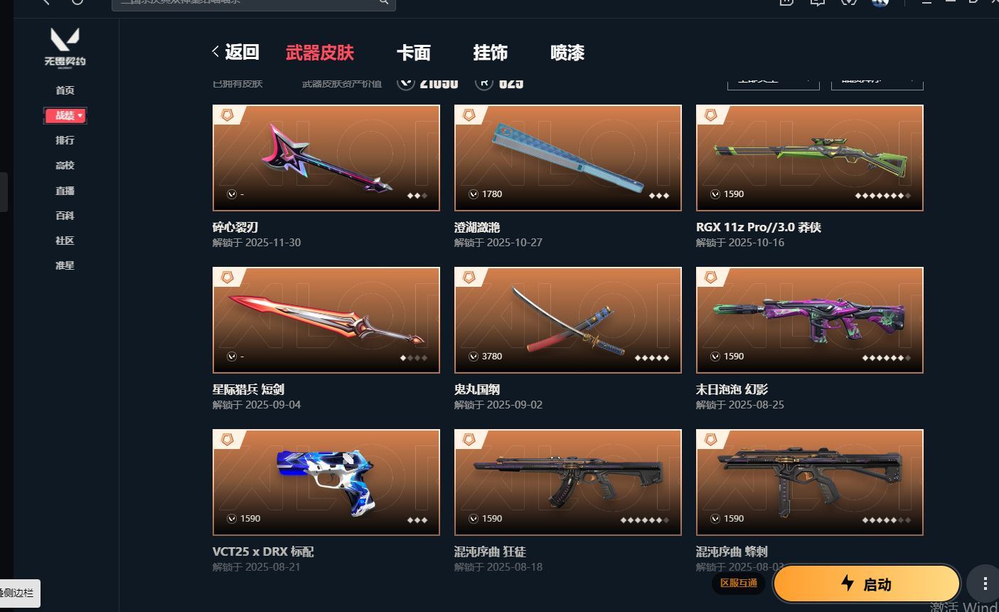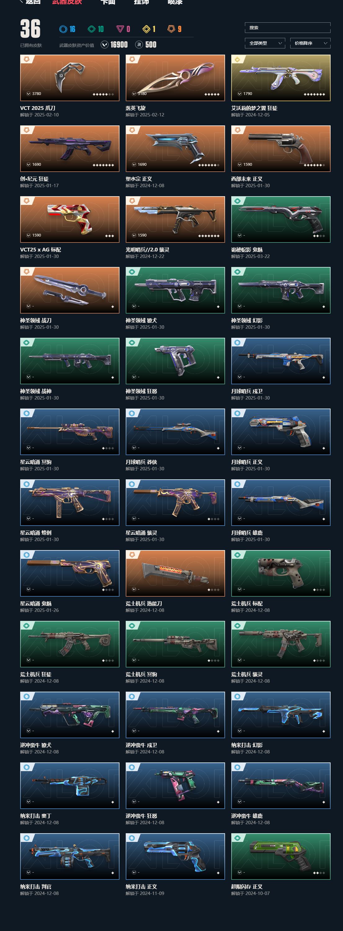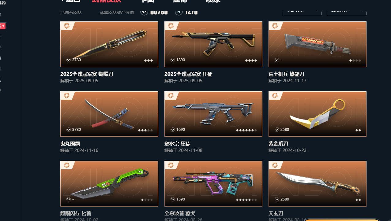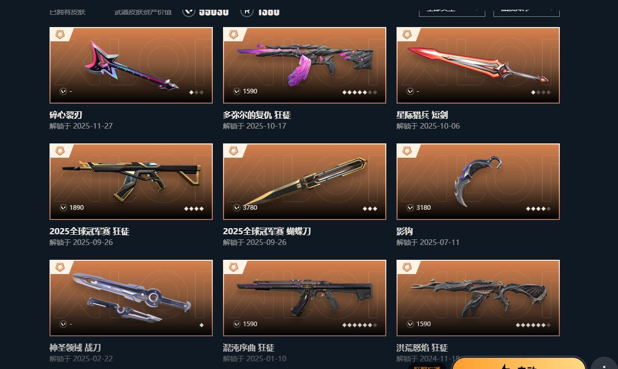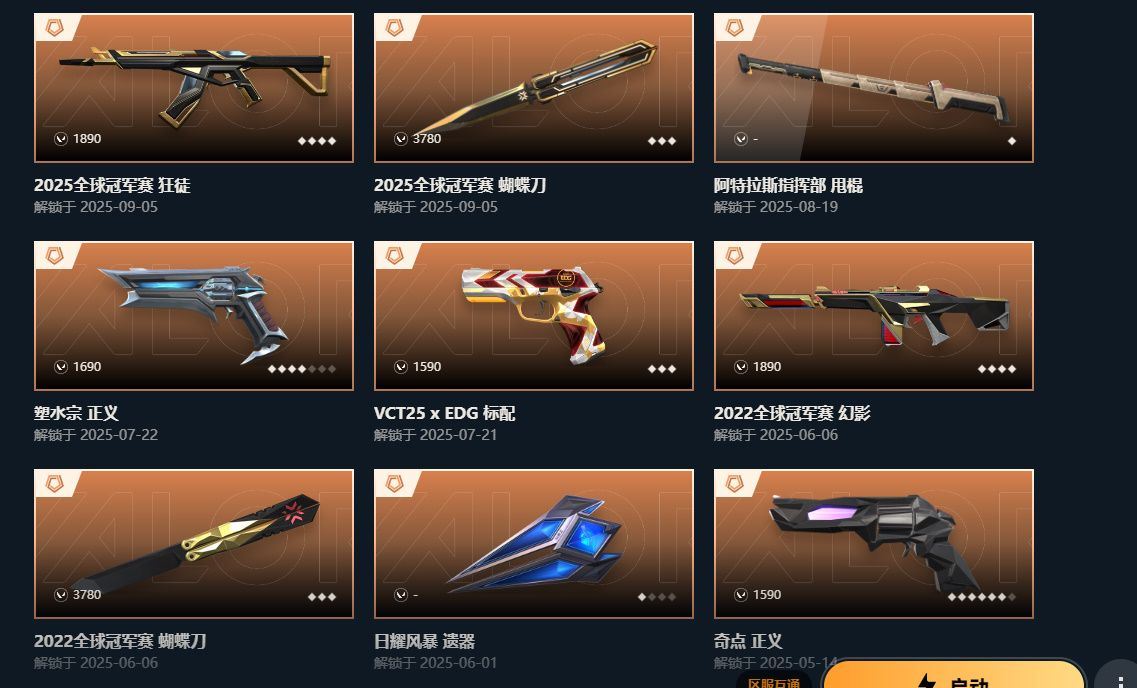 【账号佳】 【可包人脸】【kf3382】无畏16900库存,VCT 2025 爪刀,落英飞旋,艾沃莉的梦之翼 狂徒,创·纪元 狂徒,塑水宗 正义,西部未来 正义,VCT25 x AG 标配,光明哨兵//2.0 骇灵,神圣领域 战刀