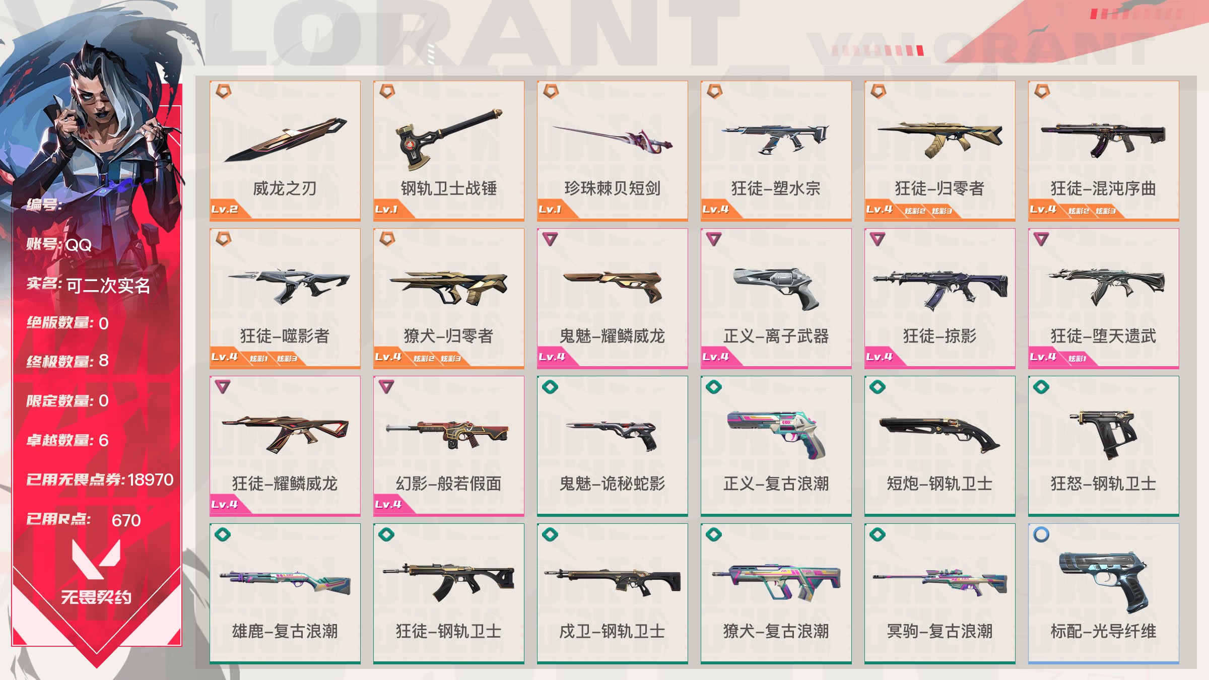 【账号佳】 【可二次实名】【6kswyhefe】lv159|铂金i, 刀皮数量3,呛皮数量39(绝版0限定8终极0卓越6);皮肤资产价值18970,已用r点670;【刀皮】:近战武器-威龙之刃,近战武器-钢轨卫士战锤,近战武器-珍珠棘贝短剑; 【呛皮】:狂徒-塑水宗,狂徒-归零者,狂徒-混沌序曲,狂徒-噬影者,獠犬-归零者,鬼魅-耀鳞威龙,正义-离子武器,狂徒-掠影,狂徒-堕天遗武,狂徒-耀鳞威龙,幻影-般若假面,鬼魅-诡秘蛇影,正义-复古浪潮,短炮-钢轨卫士,狂怒-钢轨卫士,雄鹿-复古浪潮,狂徒-钢轨卫士,戍卫-钢轨卫士,獠犬-复古浪潮,冥驹-复古浪潮,标配-光导纤维,鬼魅-光导纤维,短炮-深海水族,狂怒-珍珠棘贝,骇灵-珍珠棘贝,骇灵-光导纤维,蜂刺-深海水族,蜂刺-战术小伙伴,幻影-珍珠棘贝,幻影-战术小伙伴,戍卫-珍珠棘贝,獠犬-战术小伙伴,飞将-光导纤维,莽侠-深海水族,奥丁-战术小伙伴,战神-深海水族,鬼魅-流星兵团,标配-超能偶像,鬼魅-星云暗涌;【热门卡面】:双城之战金克丝卡面,势不可挡芮娜卡面,双城之战拥抱卡面,势不可挡蝰蛇卡面,万圣夜卡面,情人节不死鸟卡面,虹吸式咖啡壶卡面,命运之手女皇卡面,耀鳞威龙卡面,逆向独行卡面,势不可挡盖可卡面;【热门挂饰】:神中神挂饰,第九季超凡挂饰,双城之战小蛋糕挂饰,袖珍捷风挂饰,糖葫芦挂饰,2021冠军巡回赛花火挂饰,传世莲华挂饰,耀鳞威龙挂饰,鱼骨头挂饰;【热门喷漆】:燥起来喷漆,小丑猫喷漆,调大音量喷漆,一切安好喷漆,情绪控制喷漆,双人比心喷漆,双击点赞喷漆,买装还是存钱喷漆,飓刃涂鸦喷漆,耀鳞威龙喷漆,战术小伙伴喷漆,秘笈顺序喷漆,醒狮贺春喷漆;详情看图【皮肤可能含有某些特权皮肤,具体以游戏内实际拥有为准】【qq】【可二次实名】【官方截图】