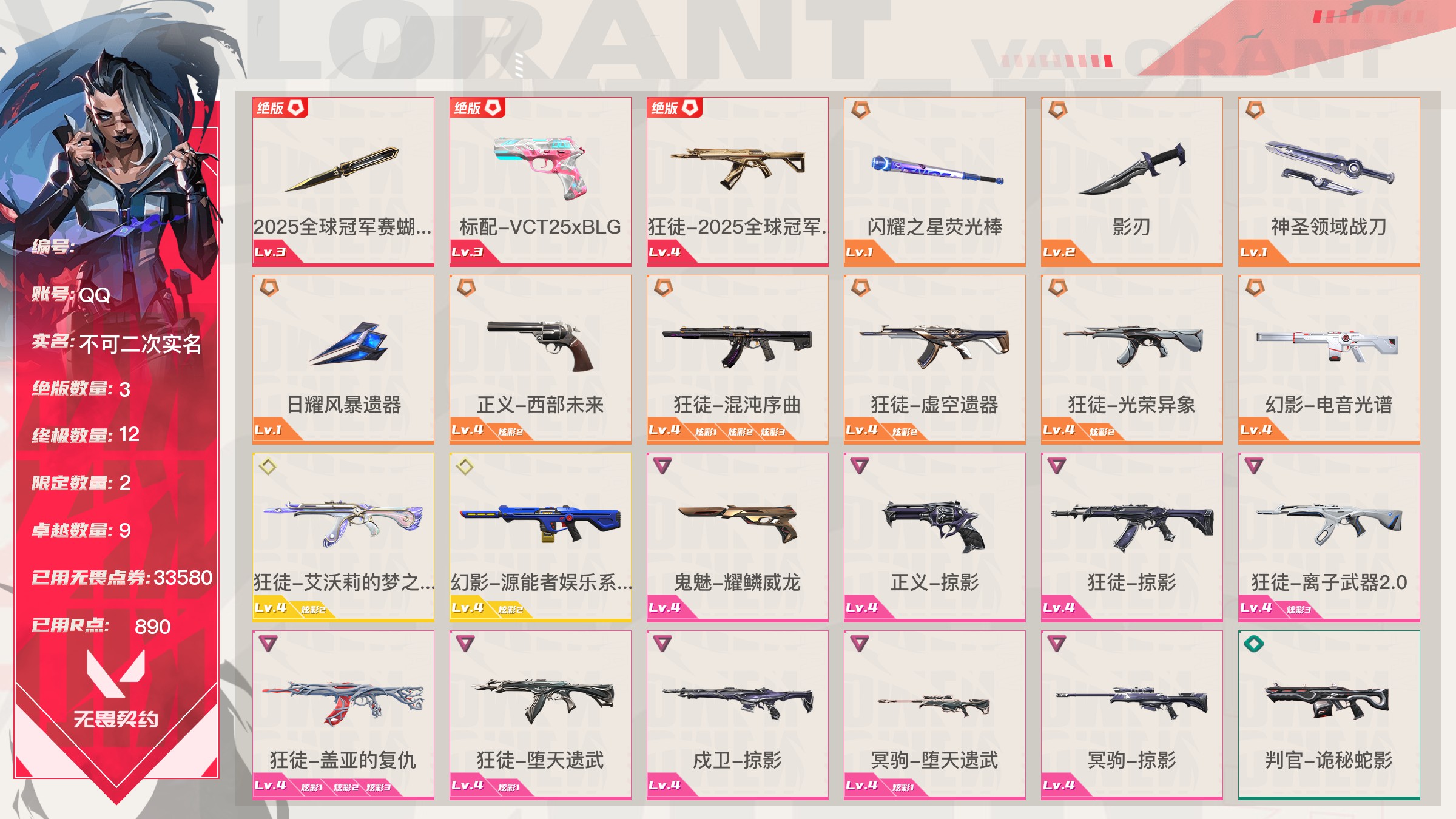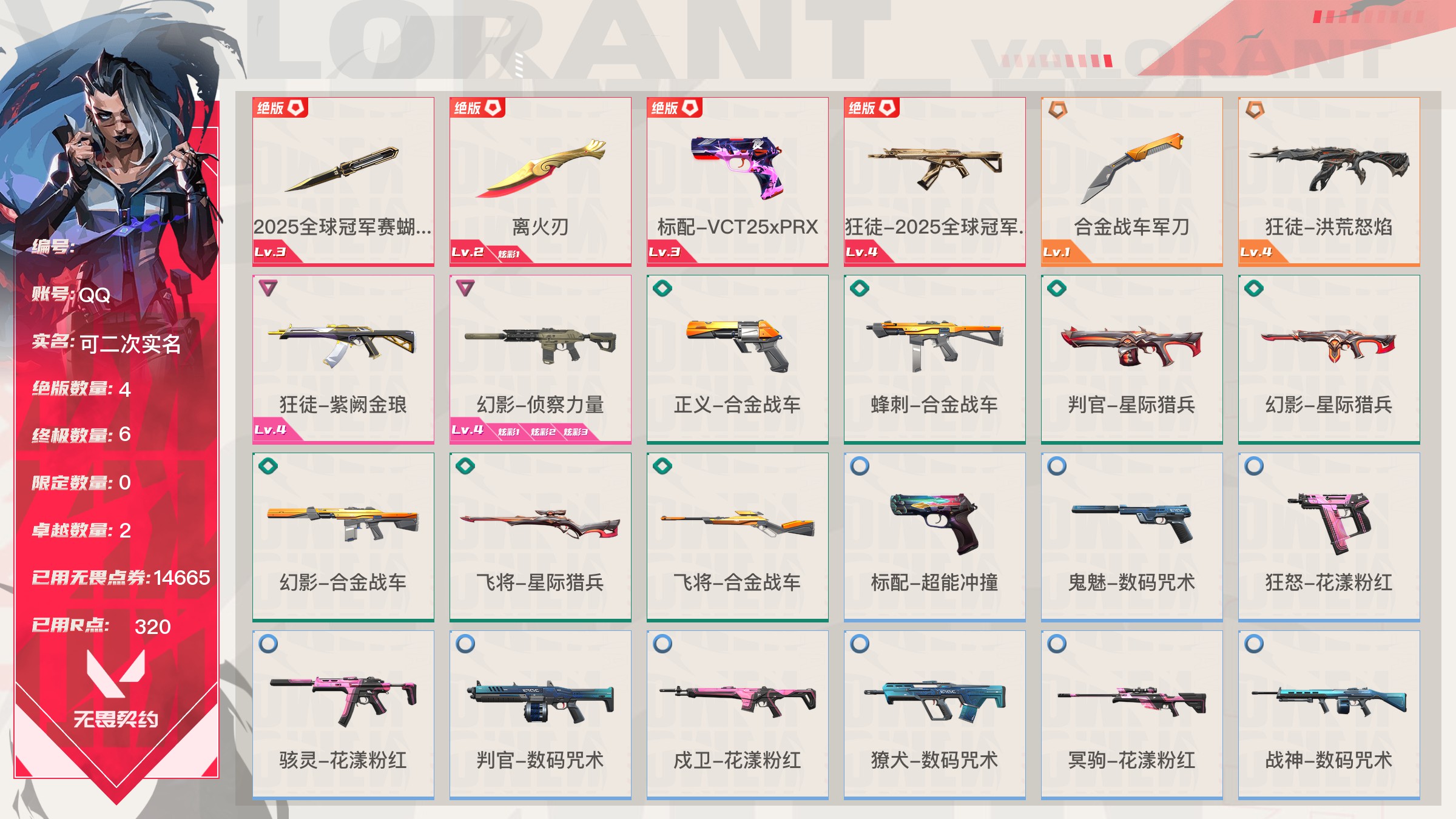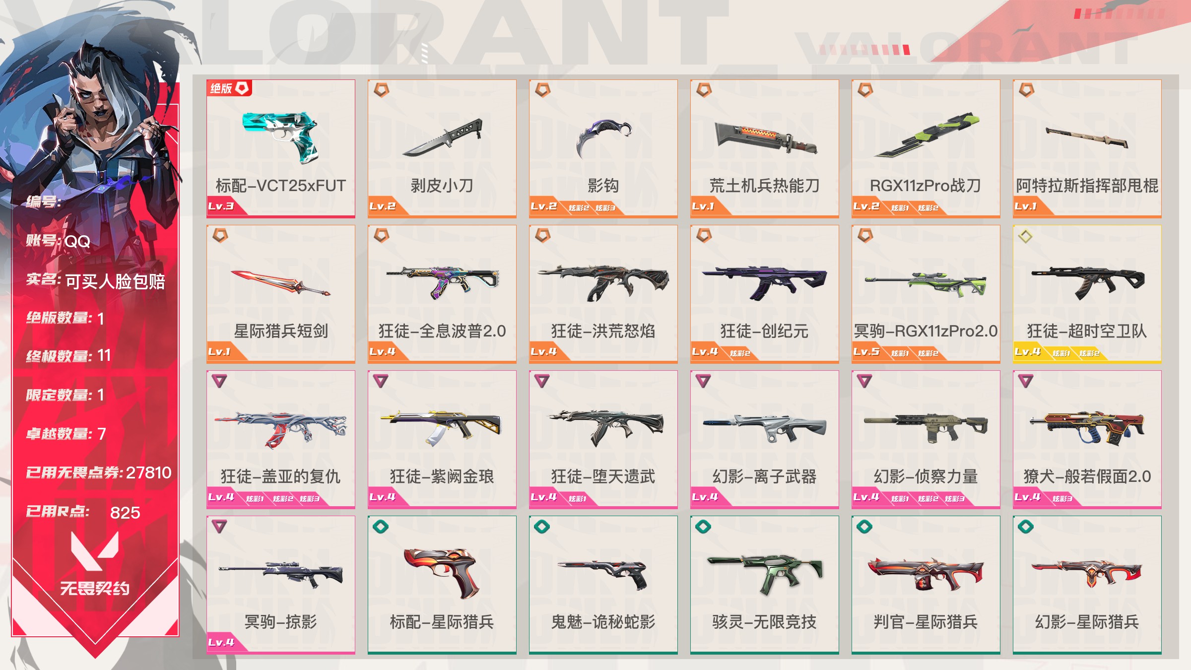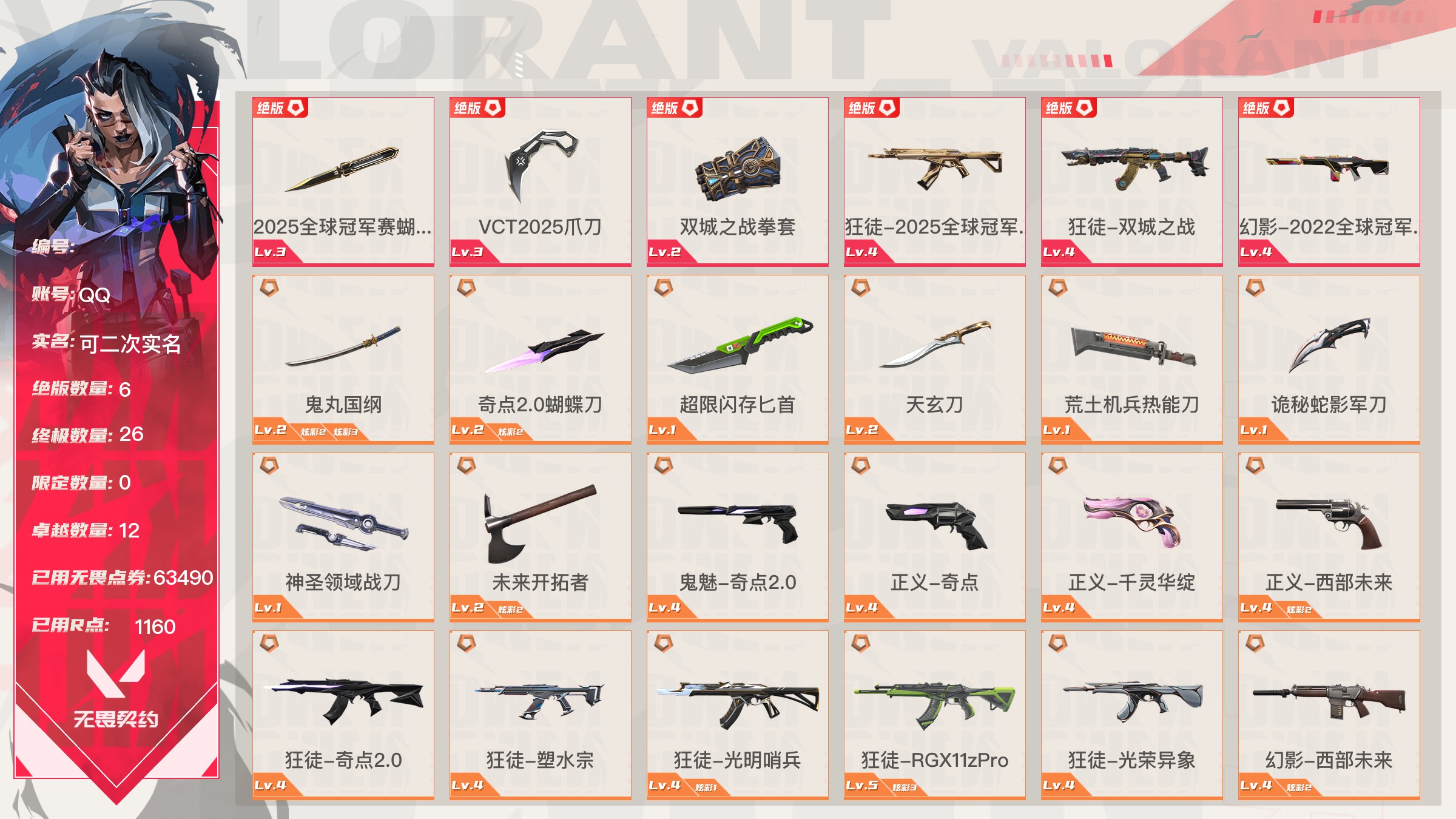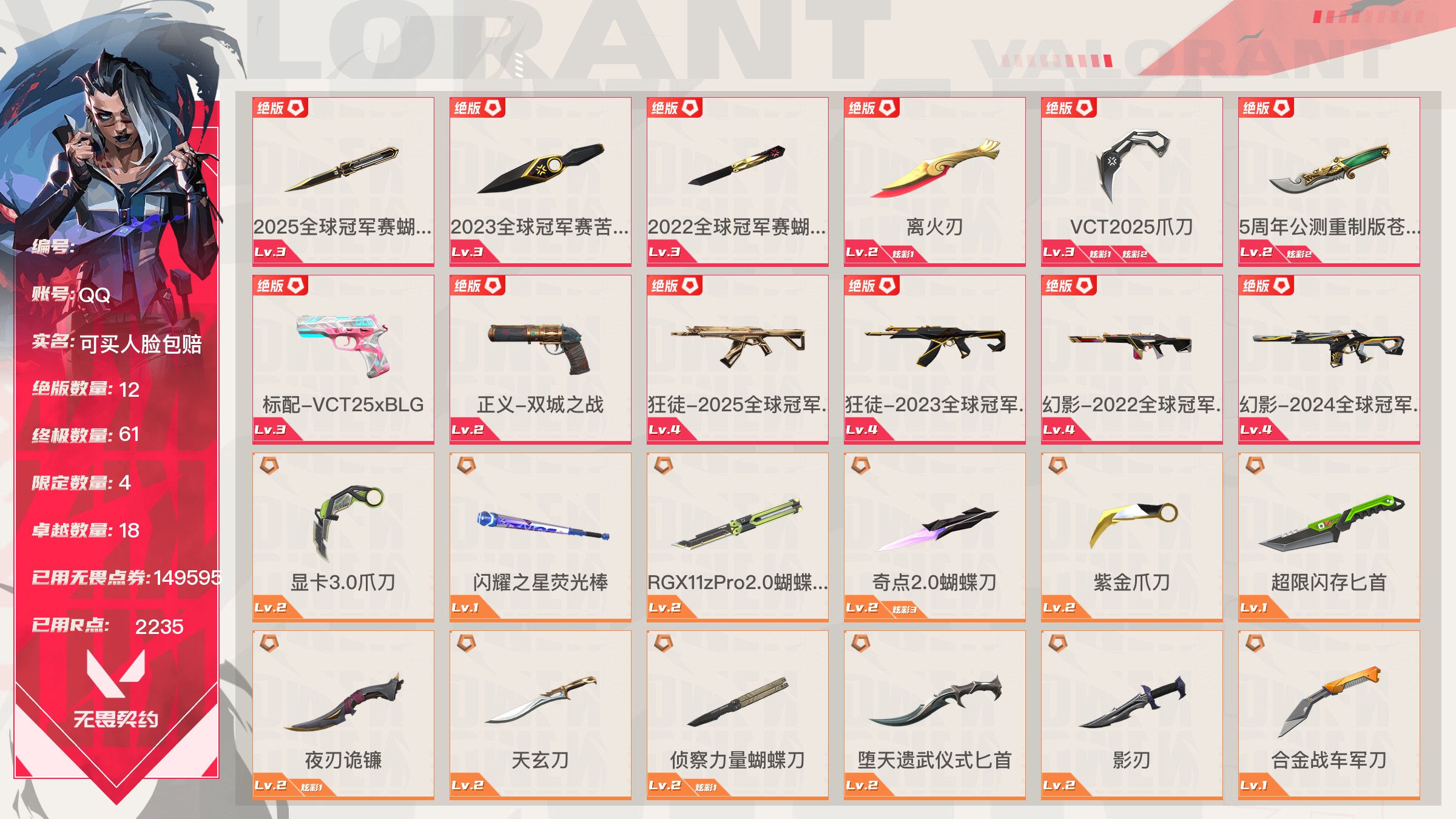 【账号佳】 【可包人脸】【69sjvhc11】lv213|未定级, 刀皮数量28,呛皮数量182(绝版12限定61终极4卓越18);皮肤资产价值149595,已用r点2235;【刀皮】:近战武器-2025全球冠军赛蝴蝶刀,近战武器-2023全球冠军赛苦无,近战武器-2022全球冠军赛蝴蝶刀,近战武器-离火刃,近战武器-vct2025爪刀,近战武器-5周年公测重制版苍龙之刃,近战武器-显卡3.0爪刀,近战武器-闪耀之星荧光棒,近战武器-rgx11zpro2.0蝴蝶刀,近战武器-奇点2.0蝴蝶刀,近战武器-紫金爪刀,近战武器-超限闪存匕首,近战武器-夜刃诡镰,近战武器-天玄刀,近战武器-侦察力量蝴蝶刀,近战武器-堕天遗武仪式匕首,近战武器-影刃,近战武器-合金战车军刀,近战武器-黑波之刃,近战武器-金琅斧,近战武器-荒土机兵热能刀,近战武器-诡秘蛇影军刀,近战武器-神圣领域战刀,近战武器-镭切,近战武器-日耀风暴遗器,近战武器-未来开拓者,近战武器-星际猎兵短剑,近战武器-无畏契约go第一卷苦无; 【呛皮】:标配-vct25xblg,正义-双城之战,狂徒-2025全球冠军赛,狂徒-2023全球冠军赛,幻影-2022全球冠军赛,幻影-2024全球冠军赛,标配-rgx11zpro2.0,鬼魅-奇点2.0,正义-奇点,正义-塑水宗,正义-千灵华绽,正义-西部未来,短炮-洪荒怒焰,骇灵-rgx11zpro2.0,骇灵-塑水宗,判官-偃月苍龙,狂徒-全息波普2.0,狂徒-奇点2.0,狂徒-塑水宗,狂徒-偃月苍龙,狂徒-混沌序曲,狂徒-虚空遗器,狂徒-rgx11zpro,幻影-全息波普2.0,幻影-砰砰x特攻队,幻影-rgx11zpro2.0,幻影-西部未来,獠犬-归零者,冥驹-rgx11zpro2.0,飞将-塑水宗,飞将-西部未来,莽侠-归零者2.0,奥丁-西部未来,鬼魅-源能者娱乐系统,狂徒-艾沃莉的梦之翼,獠犬-源能者娱乐系统,冥驹-源能者娱乐系统,标配-紫阙金琅,鬼魅-盖亚的复仇,鬼魅-耀鳞威龙,正义-离子武器,骇灵-紫阙金琅,蜂刺-天界神兵,狂徒-离子武器2.0,狂徒-盖亚的复仇,狂徒-紫阙金琅,狂徒-堕天遗武,狂徒-海洋之星,幻影-侦察力量,幻影-盖亚的复仇2.0,幻影-异鳞魔蛇,戍卫-紫阙金琅,戍卫-掠影,冥驹-堕天遗武,冥驹-起源,标配-星际猎兵,鬼魅-诡秘蛇影,正义-合金战车,短炮-钢轨卫士,狂怒-钢轨卫士,骇灵-无限竞技,蜂刺-合金战车,蜂刺-弧光异彩,判官-星际猎兵,判官-诡秘蛇影,狂徒-诡秘蛇影,狂徒-弧光异彩,幻影-星际猎兵,幻影-合金战车,獠犬-弧光异彩,飞将-星际猎兵,飞将-合金战车,莽侠-诡秘蛇影,标配-光导纤维,标配-彩梦之城,标配-超能冲撞,鬼魅-数码咒术,鬼魅-信手涂鸦,正义-游戏结束,狂怒-花漾粉红,骇灵-光导纤维,骇灵-花漾粉红,骇灵-信手涂鸦,蜂刺-战术小伙伴,判官-数码咒术,雄鹿-彩梦之城,幻影-战术小伙伴,戍卫-彩梦之城,戍卫-花漾粉红,獠犬-数码咒术,冥驹-花漾粉红,飞将-信手涂鸦,奥丁-战术小伙伴,奥丁-信手涂鸦,战神-数码咒术,狂徒-阿特拉斯指挥部,狂徒-荒土机兵,狂徒-超能偶像,幻影-日耀风暴,幻影-神圣领域,幻影-超限闪存,戍卫-超能偶像,獠犬-神圣领域,冥驹-荒土机兵,莽侠-阿特拉斯指挥部,莽侠-超限闪存,正义-日耀风暴,正义-超限闪存,鬼魅-流星兵团,标配-荒土机兵,标配-超能偶像,狂怒-神圣领域,骇灵-阿特拉斯指挥部,骇灵-日耀风暴,骇灵-荒土机兵,蜂刺-超限闪存,判官-超能偶像,奥丁-日耀风暴,战神-神圣领域,狂徒-瑰梦艺语,幻影-末日之翼,幻影-纳米打击,幻影-聚合之力,戍卫-光环序列,戍卫-太空穿梭,戍卫-甜蜜战术,戍卫-折光棱晶,戍卫-月球哨兵,戍卫-逆冲蛮牛,戍卫-浮光跃金,獠犬-悠闲猫生,獠犬-幻语魔咒,獠犬-逆冲蛮牛,獠犬-模拟赫兹,獠犬-采蜜小蜂队,冥驹-光环序列,冥驹-甜蜜战术,冥驹-星云暗涌,冥驹-模拟赫兹,莽侠-神罚2.0,莽侠-月球哨兵,飞将-悠闲猫生,飞将-幻语魔咒,飞将-末日之翼,飞将-聚合之力,正义-太空穿梭,正义-月球哨兵,正义-纳米打击,鬼魅-瑰梦艺语,鬼魅-甜蜜战术,鬼魅-星云暗涌,鬼魅-模拟赫兹,鬼魅-采蜜小蜂队,标配-折光棱晶,标配-浮光跃金,短炮-悠闲猫生,短炮-末日之翼,狂怒-光环序列,狂怒-幻语魔咒,狂怒-逆冲蛮牛,狂怒-聚合之力,骇灵-瑰梦艺语,骇灵-星云暗涌,骇灵-浮光跃金,蜂刺-折光棱晶,蜂刺-星云暗涌,蜂刺-聚合之力,判官-太空穿梭,判官-甜蜜战术,判官-纳米打击,判官-采蜜小蜂队,雄鹿-瑰梦艺语,雄鹿-幻语魔咒,雄鹿-月球哨兵,雄鹿-逆冲蛮牛,雄鹿-模拟赫兹,奥丁-末日之翼,奥丁-纳米打击,战神-光环序列,战神-太空穿梭,战神-浮光跃金,战神-采蜜小蜂队;【热门卡面】:势不可挡蝰蛇卡面,势不可挡贤者卡面,势不可挡捷风卡面,情人节捷风卡面,双城之战金克丝卡面,势不可挡芮娜卡面,许愿星砂卡面,vct2025cn联赛卡面,vct2025太平洋联赛卡面,vct2025美洲联赛卡面,vct2025emea联赛卡面,势不可挡星礈卡面,西部未来卡面,rgx11zpro2.0卡面,vct25xblg卡面,分崩离析卡面,vctcn首冠卡面,捣蛋鬼出没卡面,超能偶像卡面,塑水宗卡面,势不可挡零卡面,双城之战谜团卡面,离火刃凰卡面,离火刃凤卡面;【热门挂饰】:v25第三幕神话挂饰,科尔宾之光挂饰,神中神挂饰,飞刀挂饰,vct2025cn联赛挂饰,vct2025太平洋联赛挂饰,vct2025emea联赛挂饰,vct2025美洲联赛挂饰,西部未来挂饰,rgx11zpro2.0挂饰,vctxblg挂饰,双面黑猫挂饰,奇点2.0挂饰,鱼骨头挂饰,袖珍捷风挂饰,糖葫芦挂饰,超能偶像挂饰,传世莲华挂饰,塑水宗挂饰,魄月玄兔挂饰,全球冠军赛方块挂饰,数码咒术挂饰;【热门喷漆】:来点朋克喷漆,2022全球冠军赛喷漆,捷风跳peek喷漆,皮蛋萌舞喷漆,捷风喷漆,无条件投降喷漆,西部未来喷漆,rgx11zpro2.0喷漆,真烦人