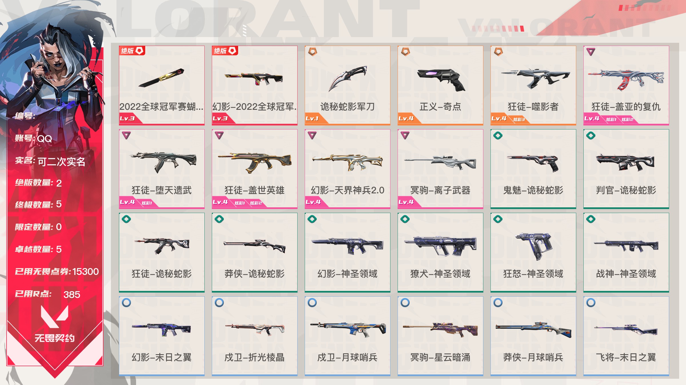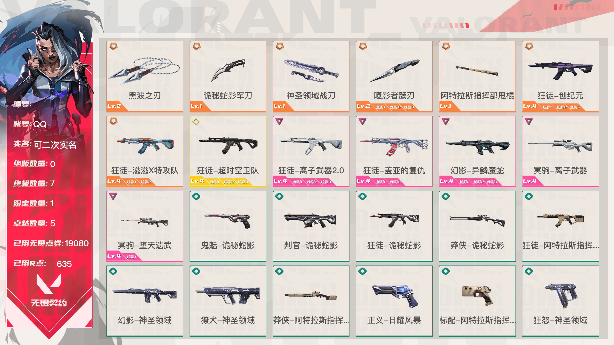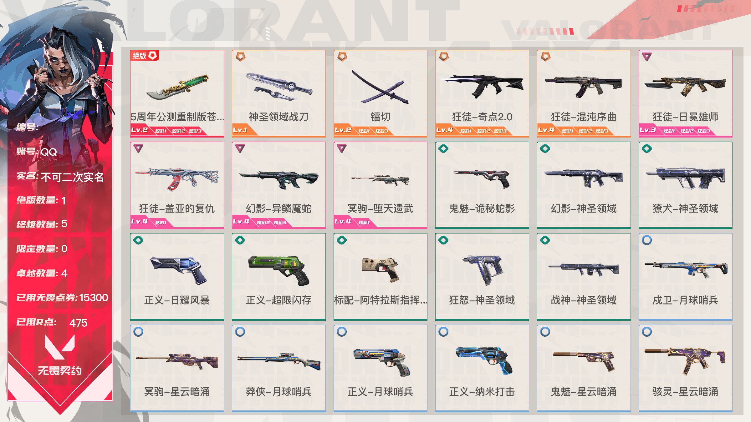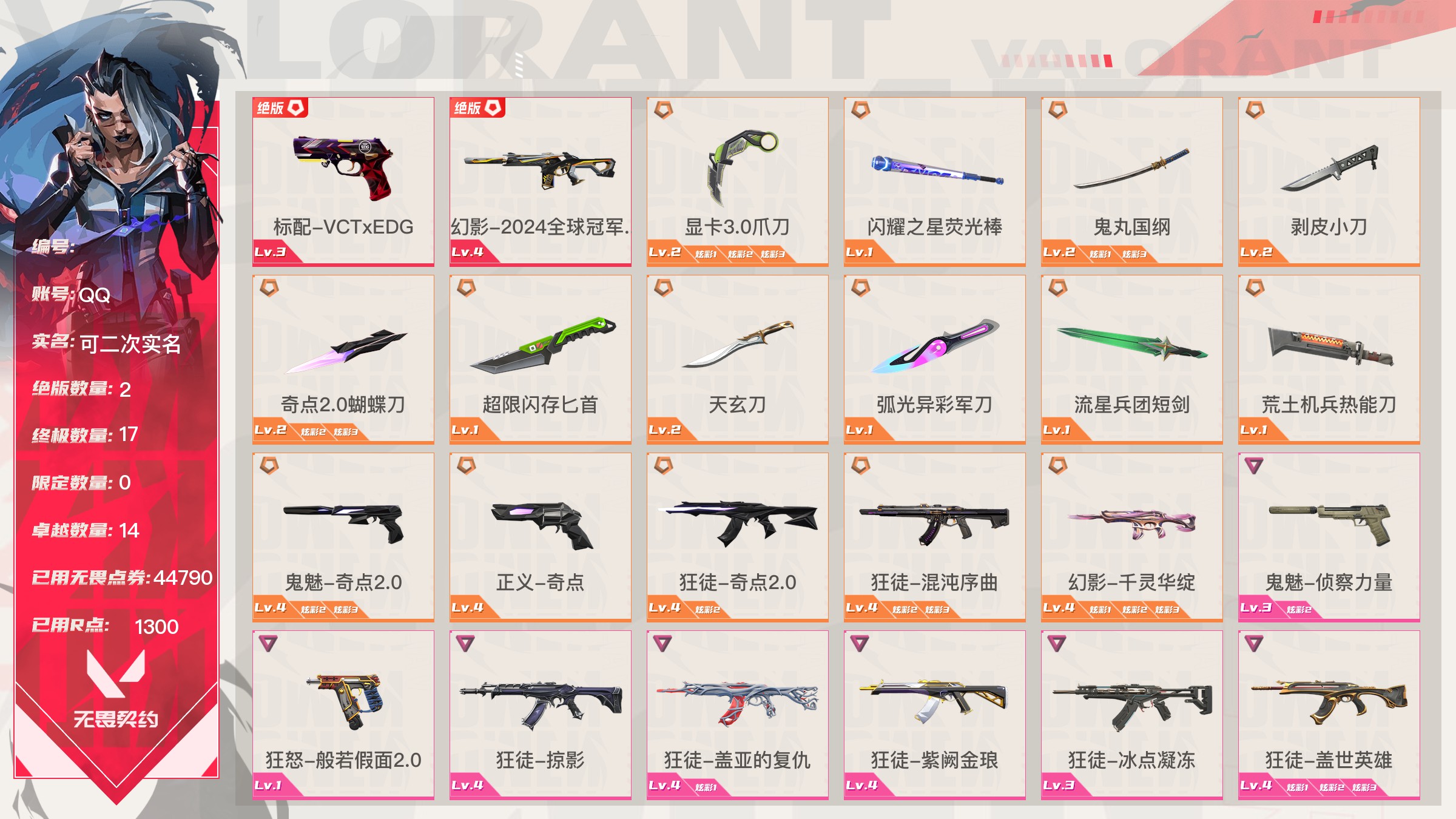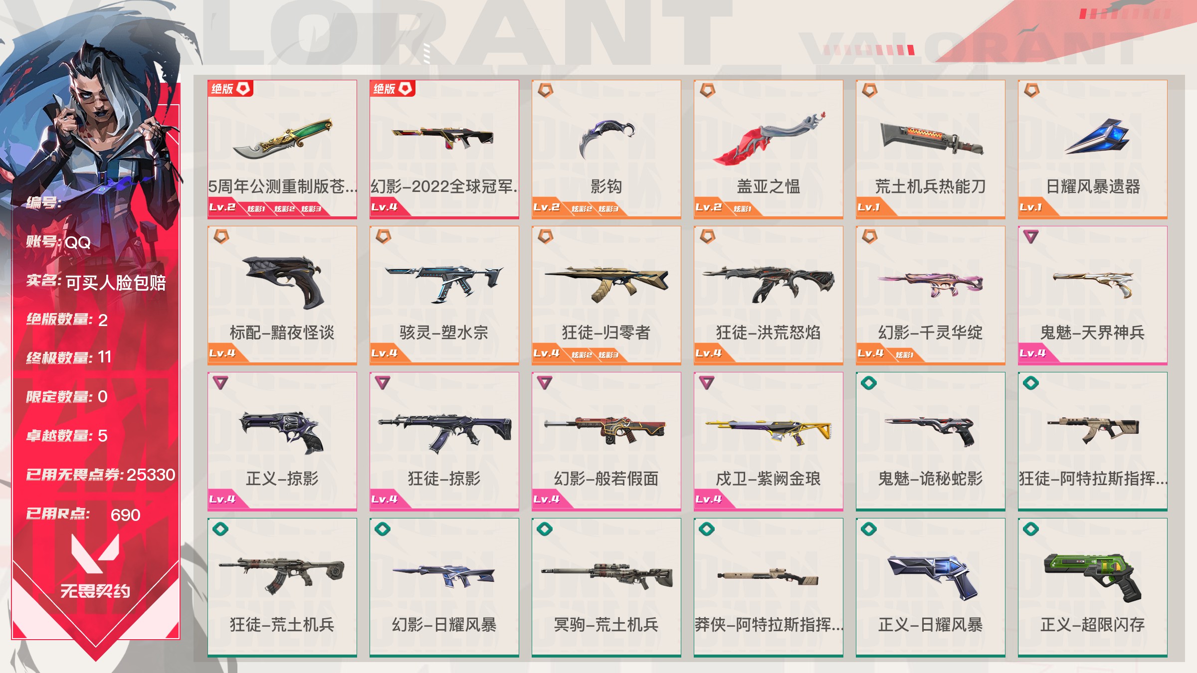 【账号佳】 【可包人脸】【69sjvhc11】lv213|未定级, 刀皮数量28,呛皮数量182(绝版12限定61终极4卓越18);皮肤资产价值149595,已用r点2235;【刀皮】:近战武器-2025全球冠军赛蝴蝶刀,近战武器-2023全球冠军赛苦无,近战武器-2022全球冠军赛蝴蝶刀,近战武器-离火刃,近战武器-vct2025爪刀,近战武器-5周年公测重制版苍龙之刃,近战武器-显卡3.0爪刀,近战武器-闪耀之星荧光棒,近战武器-rgx11zpro2.0蝴蝶刀,近战武器-奇点2.0蝴蝶刀,近战武器-紫金爪刀,近战武器-超限闪存匕首,近战武器-夜刃诡镰,近战武器-天玄刀,近战武器-侦察力量蝴蝶刀,近战武器-堕天遗武仪式匕首,近战武器-影刃,近战武器-合金战车军刀,近战武器-黑波之刃,近战武器-金琅斧,近战武器-荒土机兵热能刀,近战武器-诡秘蛇影军刀,近战武器-神圣领域战刀,近战武器-镭切,近战武器-日耀风暴遗器,近战武器-未来开拓者,近战武器-星际猎兵短剑,近战武器-无畏契约go第一卷苦无; 【呛皮】:标配-vct25xblg,正义-双城之战,狂徒-2025全球冠军赛,狂徒-2023全球冠军赛,幻影-2022全球冠军赛,幻影-2024全球冠军赛,标配-rgx11zpro2.0,鬼魅-奇点2.0,正义-奇点,正义-塑水宗,正义-千灵华绽,正义-西部未来,短炮-洪荒怒焰,骇灵-rgx11zpro2.0,骇灵-塑水宗,判官-偃月苍龙,狂徒-全息波普2.0,狂徒-奇点2.0,狂徒-塑水宗,狂徒-偃月苍龙,狂徒-混沌序曲,狂徒-虚空遗器,狂徒-rgx11zpro,幻影-全息波普2.0,幻影-砰砰x特攻队,幻影-rgx11zpro2.0,幻影-西部未来,獠犬-归零者,冥驹-rgx11zpro2.0,飞将-塑水宗,飞将-西部未来,莽侠-归零者2.0,奥丁-西部未来,鬼魅-源能者娱乐系统,狂徒-艾沃莉的梦之翼,獠犬-源能者娱乐系统,冥驹-源能者娱乐系统,标配-紫阙金琅,鬼魅-盖亚的复仇,鬼魅-耀鳞威龙,正义-离子武器,骇灵-紫阙金琅,蜂刺-天界神兵,狂徒-离子武器2.0,狂徒-盖亚的复仇,狂徒-紫阙金琅,狂徒-堕天遗武,狂徒-海洋之星,幻影-侦察力量,幻影-盖亚的复仇2.0,幻影-异鳞魔蛇,戍卫-紫阙金琅,戍卫-掠影,冥驹-堕天遗武,冥驹-起源,标配-星际猎兵,鬼魅-诡秘蛇影,正义-合金战车,短炮-钢轨卫士,狂怒-钢轨卫士,骇灵-无限竞技,蜂刺-合金战车,蜂刺-弧光异彩,判官-星际猎兵,判官-诡秘蛇影,狂徒-诡秘蛇影,狂徒-弧光异彩,幻影-星际猎兵,幻影-合金战车,獠犬-弧光异彩,飞将-星际猎兵,飞将-合金战车,莽侠-诡秘蛇影,标配-光导纤维,标配-彩梦之城,标配-超能冲撞,鬼魅-数码咒术,鬼魅-信手涂鸦,正义-游戏结束,狂怒-花漾粉红,骇灵-光导纤维,骇灵-花漾粉红,骇灵-信手涂鸦,蜂刺-战术小伙伴,判官-数码咒术,雄鹿-彩梦之城,幻影-战术小伙伴,戍卫-彩梦之城,戍卫-花漾粉红,獠犬-数码咒术,冥驹-花漾粉红,飞将-信手涂鸦,奥丁-战术小伙伴,奥丁-信手涂鸦,战神-数码咒术,狂徒-阿特拉斯指挥部,狂徒-荒土机兵,狂徒-超能偶像,幻影-日耀风暴,幻影-神圣领域,幻影-超限闪存,戍卫-超能偶像,獠犬-神圣领域,冥驹-荒土机兵,莽侠-阿特拉斯指挥部,莽侠-超限闪存,正义-日耀风暴,正义-超限闪存,鬼魅-流星兵团,标配-荒土机兵,标配-超能偶像,狂怒-神圣领域,骇灵-阿特拉斯指挥部,骇灵-日耀风暴,骇灵-荒土机兵,蜂刺-超限闪存,判官-超能偶像,奥丁-日耀风暴,战神-神圣领域,狂徒-瑰梦艺语,幻影-末日之翼,幻影-纳米打击,幻影-聚合之力,戍卫-光环序列,戍卫-太空穿梭,戍卫-甜蜜战术,戍卫-折光棱晶,戍卫-月球哨兵,戍卫-逆冲蛮牛,戍卫-浮光跃金,獠犬-悠闲猫生,獠犬-幻语魔咒,獠犬-逆冲蛮牛,獠犬-模拟赫兹,獠犬-采蜜小蜂队,冥驹-光环序列,冥驹-甜蜜战术,冥驹-星云暗涌,冥驹-模拟赫兹,莽侠-神罚2.0,莽侠-月球哨兵,飞将-悠闲猫生,飞将-幻语魔咒,飞将-末日之翼,飞将-聚合之力,正义-太空穿梭,正义-月球哨兵,正义-纳米打击,鬼魅-瑰梦艺语,鬼魅-甜蜜战术,鬼魅-星云暗涌,鬼魅-模拟赫兹,鬼魅-采蜜小蜂队,标配-折光棱晶,标配-浮光跃金,短炮-悠闲猫生,短炮-末日之翼,狂怒-光环序列,狂怒-幻语魔咒,狂怒-逆冲蛮牛,狂怒-聚合之力,骇灵-瑰梦艺语,骇灵-星云暗涌,骇灵-浮光跃金,蜂刺-折光棱晶,蜂刺-星云暗涌,蜂刺-聚合之力,判官-太空穿梭,判官-甜蜜战术,判官-纳米打击,判官-采蜜小蜂队,雄鹿-瑰梦艺语,雄鹿-幻语魔咒,雄鹿-月球哨兵,雄鹿-逆冲蛮牛,雄鹿-模拟赫兹,奥丁-末日之翼,奥丁-纳米打击,战神-光环序列,战神-太空穿梭,战神-浮光跃金,战神-采蜜小蜂队;【热门卡面】:势不可挡蝰蛇卡面,势不可挡贤者卡面,势不可挡捷风卡面,情人节捷风卡面,双城之战金克丝卡面,势不可挡芮娜卡面,许愿星砂卡面,vct2025cn联赛卡面,vct2025太平洋联赛卡面,vct2025美洲联赛卡面,vct2025emea联赛卡面,势不可挡星礈卡面,西部未来卡面,rgx11zpro2.0卡面,vct25xblg卡面,分崩离析卡面,vctcn首冠卡面,捣蛋鬼出没卡面,超能偶像卡面,塑水宗卡面,势不可挡零卡面,双城之战谜团卡面,离火刃凰卡面,离火刃凤卡面;【热门挂饰】:v25第三幕神话挂饰,科尔宾之光挂饰,神中神挂饰,飞刀挂饰,vct2025cn联赛挂饰,vct2025太平洋联赛挂饰,vct2025emea联赛挂饰,vct2025美洲联赛挂饰,西部未来挂饰,rgx11zpro2.0挂饰,vctxblg挂饰,双面黑猫挂饰,奇点2.0挂饰,鱼骨头挂饰,袖珍捷风挂饰,糖葫芦挂饰,超能偶像挂饰,传世莲华挂饰,塑水宗挂饰,魄月玄兔挂饰,全球冠军赛方块挂饰,数码咒术挂饰;【热门喷漆】:来点朋克喷漆,2022全球冠军赛喷漆,捷风跳peek喷漆,皮蛋萌舞喷漆,捷风喷漆,无条件投降喷漆,西部未来喷漆,rgx11zpro2.0喷漆,真烦人
