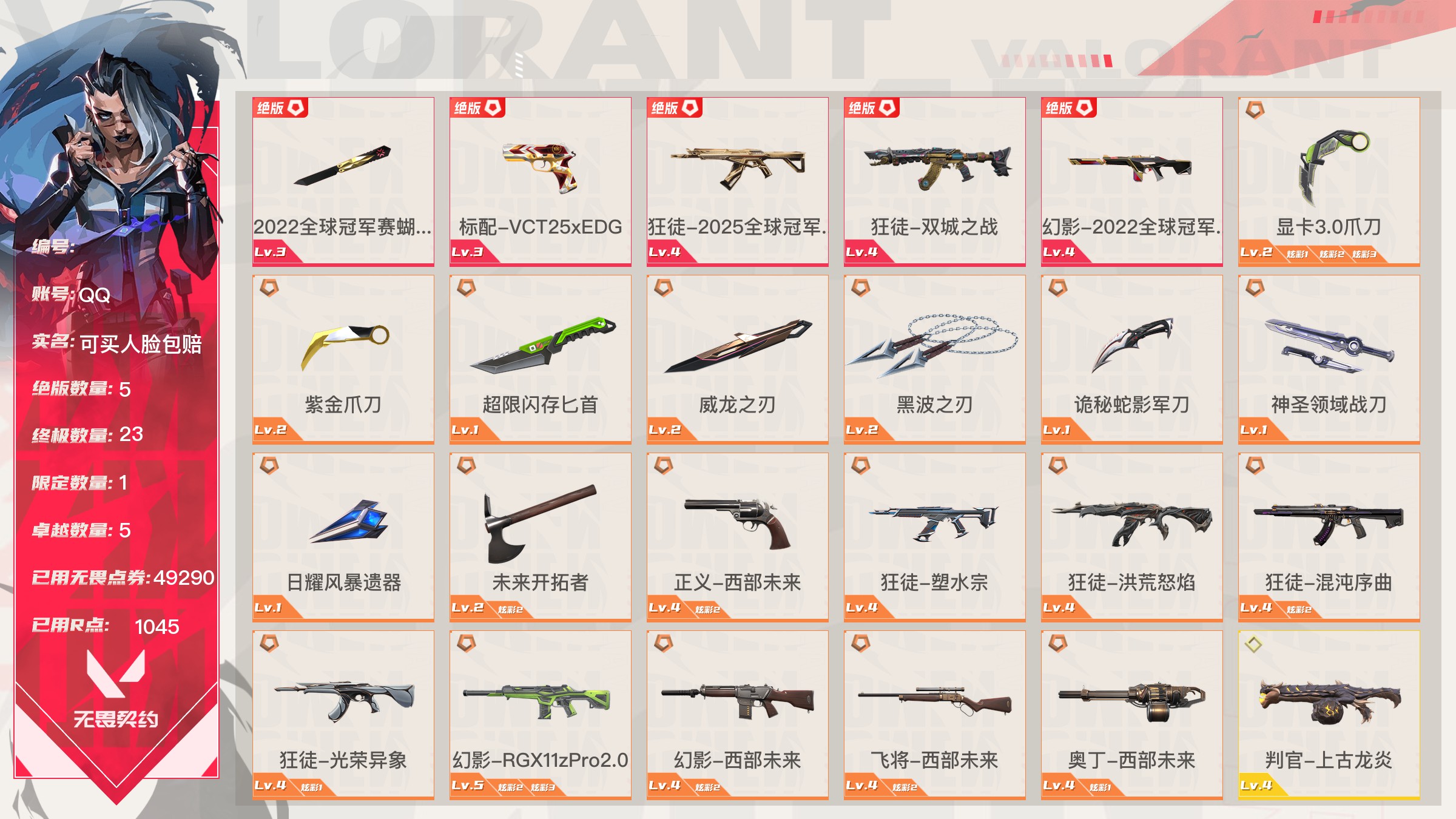 【账号佳】 【可包人脸】【69sjvagfe】lv171|未定级, 刀皮数量10,呛皮数量76(绝版5限定23终极1卓越5);皮肤资产价值49290,已用r点1045;【刀皮】:近战武器-2022全球冠军赛蝴蝶刀,近战武器-显卡3.0爪刀,近战武器-紫金爪刀,近战武器-超限闪存匕首,近战武器-威龙之刃,近战武器-黑波之刃,近战武器-诡秘蛇影军刀,近战武器-神圣领域战刀,近战武器-日耀风暴遗器,近战武器-未来开拓者; 【呛皮】:标配-vct25xedg,狂徒-2025全球冠军赛,狂徒-双城之战,幻影-2022全球冠军赛,正义-西部未来,狂徒-塑水宗,狂徒-洪荒怒焰,狂徒-混沌序曲,狂徒-光荣异象,幻影-rgx11zpro2.0,幻影-西部未来,飞将-西部未来,奥丁-西部未来,判官-上古龙炎,鬼魅-耀鳞威龙,正义-离子武器,狂徒-离子武器2.0,狂徒-紫阙金琅,冥驹-起源,鬼魅-诡秘蛇影,判官-诡秘蛇影,狂徒-诡秘蛇影,莽侠-诡秘蛇影,狂徒-超能偶像,幻影-日耀风暴,幻影-神圣领域,幻影-超限闪存,戍卫-超能偶像,獠犬-神圣领域,莽侠-超限闪存,正义-日耀风暴,正义-超限闪存,狂怒-神圣领域,骇灵-日耀风暴,蜂刺-超限闪存,判官-超能偶像,奥丁-日耀风暴,战神-神圣领域,幻影-末日之翼,戍卫-甜蜜战术,戍卫-折光棱晶,戍卫-月球哨兵,戍卫-浮光跃金,獠犬-幻语魔咒,獠犬-模拟赫兹,冥驹-甜蜜战术,冥驹-星云暗涌,冥驹-模拟赫兹,莽侠-月球哨兵,飞将-幻语魔咒,飞将-末日之翼,飞将-聚合之力,正义-月球哨兵,正义-纳米打击,鬼魅-甜蜜战术,鬼魅-星云暗涌,鬼魅-模拟赫兹,鬼魅-采蜜小蜂队,标配-折光棱晶,标配-浮光跃金,短炮-末日之翼,狂怒-幻语魔咒,狂怒-聚合之力,骇灵-星云暗涌,骇灵-浮光跃金,蜂刺-折光棱晶,蜂刺-星云暗涌,蜂刺-聚合之力,判官-甜蜜战术,判官-采蜜小蜂队,雄鹿-幻语魔咒,雄鹿-月球哨兵,雄鹿-模拟赫兹,奥丁-末日之翼,战神-浮光跃金,战神-采蜜小蜂队;【热门卡面】:许愿星砂卡面,势不可挡幽影卡面,势不可挡星礈卡面,西部未来卡面,vct25xedg卡面,势不可挡芮娜卡面,双城之战拥抱卡面,双城之战金克丝卡面,布鲁诺中校卡面,超能偶像卡面;【热门挂饰】:v25第三幕超凡挂饰,双城之战魄罗挂饰,神中神挂饰,西部未来挂饰,vctxedg挂饰,双城之战小蛋糕挂饰,终章ko小金人挂饰,超能偶像挂饰,袖珍捷风挂饰;【热门喷漆】:2022全球冠军赛喷漆,捷风跳peek喷漆,进击的章鱼2喷漆,西部未来喷漆,真烦人喷漆,vctxedg喷漆,皮蛋呼呼喷漆,小丑猫喷漆,买装还是存钱喷漆,超能偶像喷漆;详情看图【皮肤可能含有某些特权皮肤,具体以游戏内实际拥有为准】【qq】【可买人脸包赔】【官方截图】