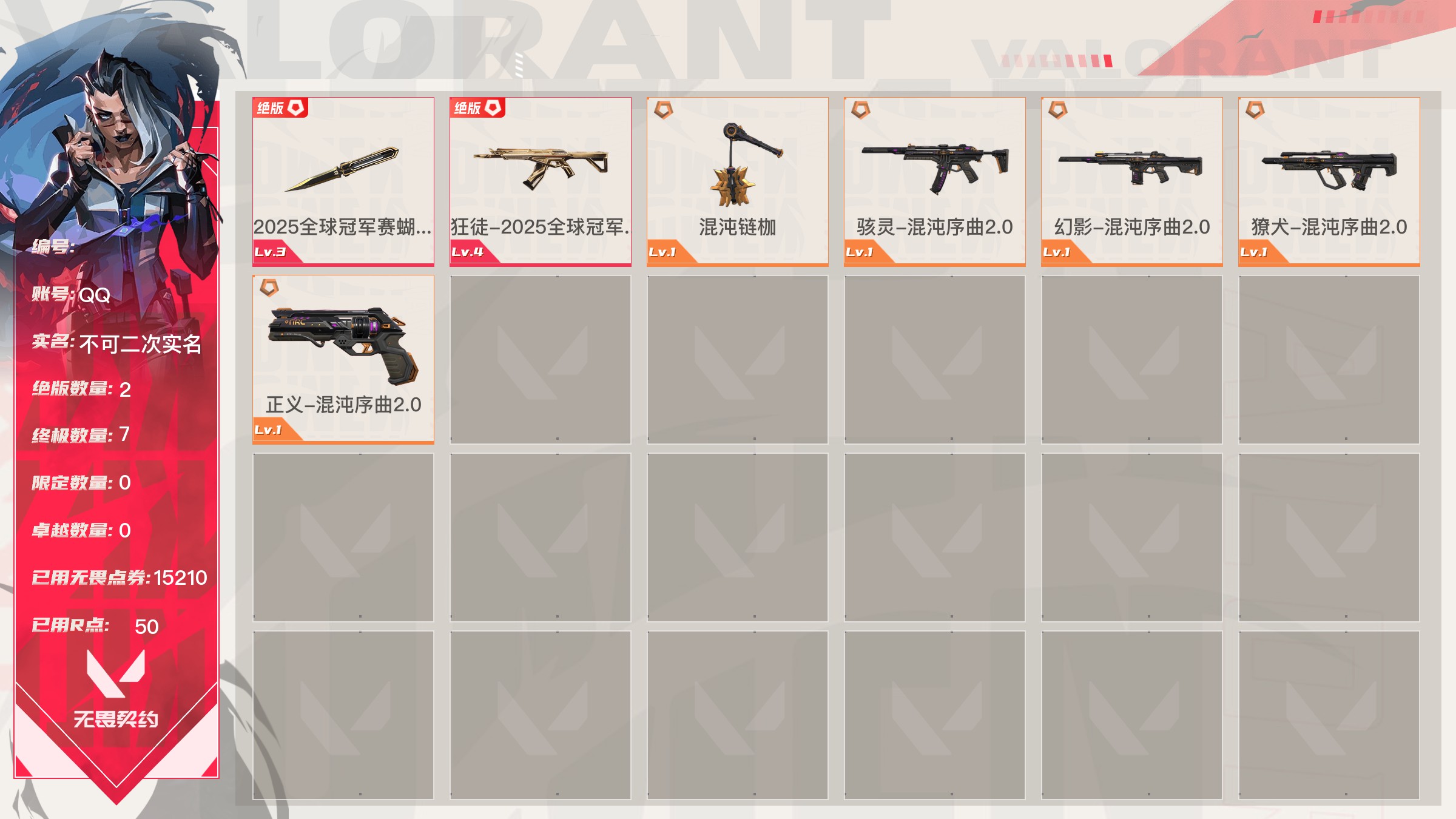 【账号佳】 【69sjvhadh】lv13|未定级, 刀皮数量2,呛皮数量5(绝版2限定7终极0卓越0);皮肤资产价值15210,已用r点50;【刀皮】:近战武器-2025全球冠军赛蝴蝶刀,近战武器-混沌链枷; 【呛皮】:狂徒-2025全球冠军赛,骇灵-混沌序曲2.0,幻影-混沌序曲2.0,獠犬-混沌序曲2.0,正义-混沌序曲2.0;详情看图【皮肤可能含有某些特权皮肤,具体以游戏内实际拥有为准】【qq】【不可二次实名】【官方截图】