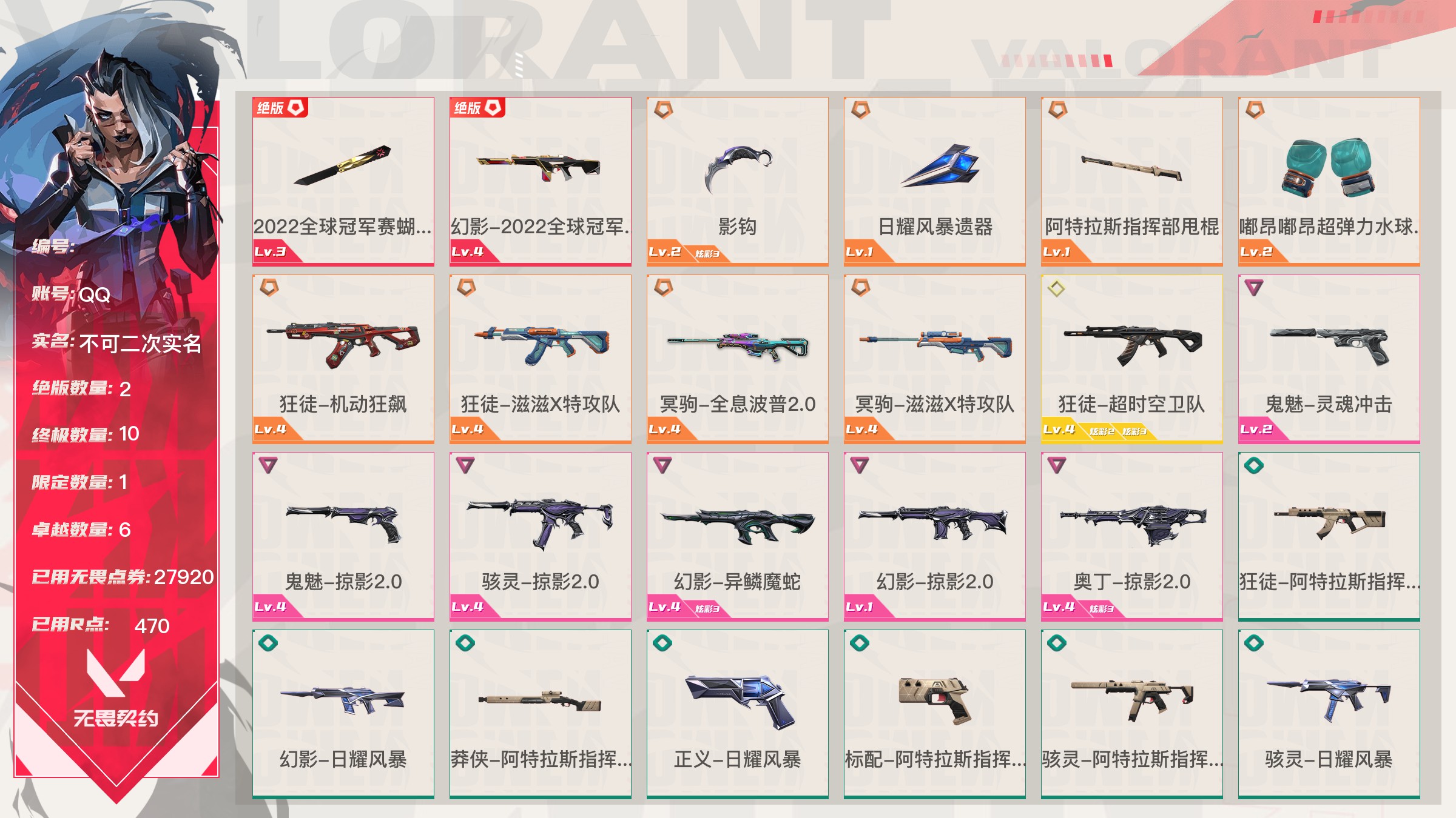 【账号佳】 【69sjv2gba】lv106|未定级, 刀皮数量5,呛皮数量36(绝版2限定10终极1卓越6);皮肤资产价值27920,已用r点470;【刀皮】:近战武器-2022全球冠军赛蝴蝶刀,近战武器-影钩,近战武器-日耀风暴遗器,近战武器-阿特拉斯指挥部甩棍,近战武器-嘟昂嘟昂超弹力水球拳套; 【呛皮】:幻影-2022全球冠军赛,狂徒-机动狂飙,狂徒-滋滋x特攻队,冥驹-全息波普2.0,冥驹-滋滋x特攻队,狂徒-超时空卫队,鬼魅-灵魂冲击,鬼魅-掠影2.0,骇灵-掠影2.0,幻影-异鳞魔蛇,幻影-掠影2.0,奥丁-掠影2.0,狂徒-阿特拉斯指挥部,幻影-日耀风暴,莽侠-阿特拉斯指挥部,正义-日耀风暴,标配-阿特拉斯指挥部,骇灵-阿特拉斯指挥部,骇灵-日耀风暴,奥丁-日耀风暴,幻影-悠闲猫生,戍卫-太空穿梭,戍卫-甜蜜战术,獠犬-悠闲猫生,獠犬-幻语魔咒,冥驹-甜蜜战术,飞将-悠闲猫生,飞将-幻语魔咒,正义-太空穿梭,鬼魅-甜蜜战术,短炮-悠闲猫生,狂怒-幻语魔咒,判官-太空穿梭,判官-甜蜜战术,雄鹿-幻语魔咒,战神-太空穿梭;【热门卡面】:双城之战金克丝卡面;【热门喷漆】:捷风跳peek喷漆,2022全球冠军赛喷漆;详情看图【皮肤可能含有某些特权皮肤,具体以游戏内实际拥有为准】【qq】【不可二次实名】【官方截图】