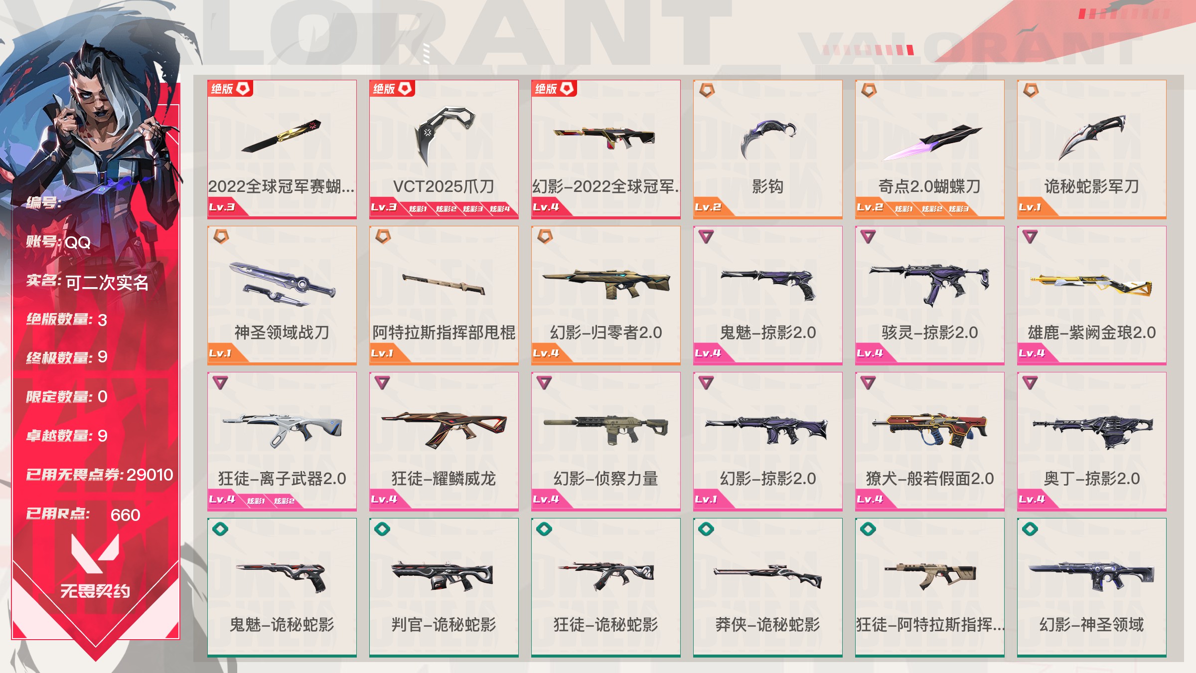【账号佳】 【可二次实名】【6s5osh1cc】lv69|白银ii, 刀皮数量7,呛皮数量47(绝版3限定9终极0卓越9);皮肤资产价值29010,已用r点660;【刀皮】:近战武器-2022全球冠军赛蝴蝶刀,近战武器-vct2025爪刀,近战武器-影钩,近战武器-奇点2.0蝴蝶刀,近战武器-诡秘蛇影军刀,近战武器-神圣领域战刀,近战武器-阿特拉斯指挥部甩棍; 【呛皮】:幻影-2022全球冠军赛,幻影-归零者2.0,鬼魅-掠影2.0,骇灵-掠影2.0,雄鹿-紫阙金琅2.0,狂徒-离子武器2.0,狂徒-耀鳞威龙,幻影-侦察力量,幻影-掠影2.0,獠犬-般若假面2.0,奥丁-掠影2.0,鬼魅-诡秘蛇影,判官-诡秘蛇影,狂徒-诡秘蛇影,莽侠-诡秘蛇影,狂徒-阿特拉斯指挥部,幻影-神圣领域,獠犬-神圣领域,莽侠-阿特拉斯指挥部,正义-日耀风暴,标配-阿特拉斯指挥部,狂怒-神圣领域,骇灵-阿特拉斯指挥部,战神-神圣领域,幻影-悠闲猫生,幻影-末日之翼,戍卫-太空穿梭,戍卫-折光棱晶,戍卫-月球哨兵,獠犬-悠闲猫生,冥驹-星云暗涌,莽侠-月球哨兵,飞将-悠闲猫生,飞将-末日之翼,正义-太空穿梭,正义-月球哨兵,鬼魅-星云暗涌,标配-折光棱晶,短炮-悠闲猫生,短炮-末日之翼,骇灵-星云暗涌,蜂刺-折光棱晶,蜂刺-星云暗涌,判官-太空穿梭,雄鹿-月球哨兵,奥丁-末日之翼,战神-太空穿梭;【热门卡面】:情人节捷风卡面,星宿灿烂猎枭卡面,势不可挡星礈卡面,vct2025cn联赛卡面,vct2025太平洋联赛卡面,vct2025美洲联赛卡面,vct2025emea联赛卡面;【热门挂饰】:神中神挂饰,vct2025cn联赛挂饰,vct2025太平洋联赛挂饰,vct2025emea联赛挂饰,vct2025美洲联赛挂饰;【热门喷漆】:这就太不行了喷漆,2022全球冠军赛喷漆,买装还是存钱喷漆,真烦人喷漆;详情看图【皮肤可能含有某些特权皮肤,具体以游戏内实际拥有为准】【qq】【可二次实名】【官方截图】