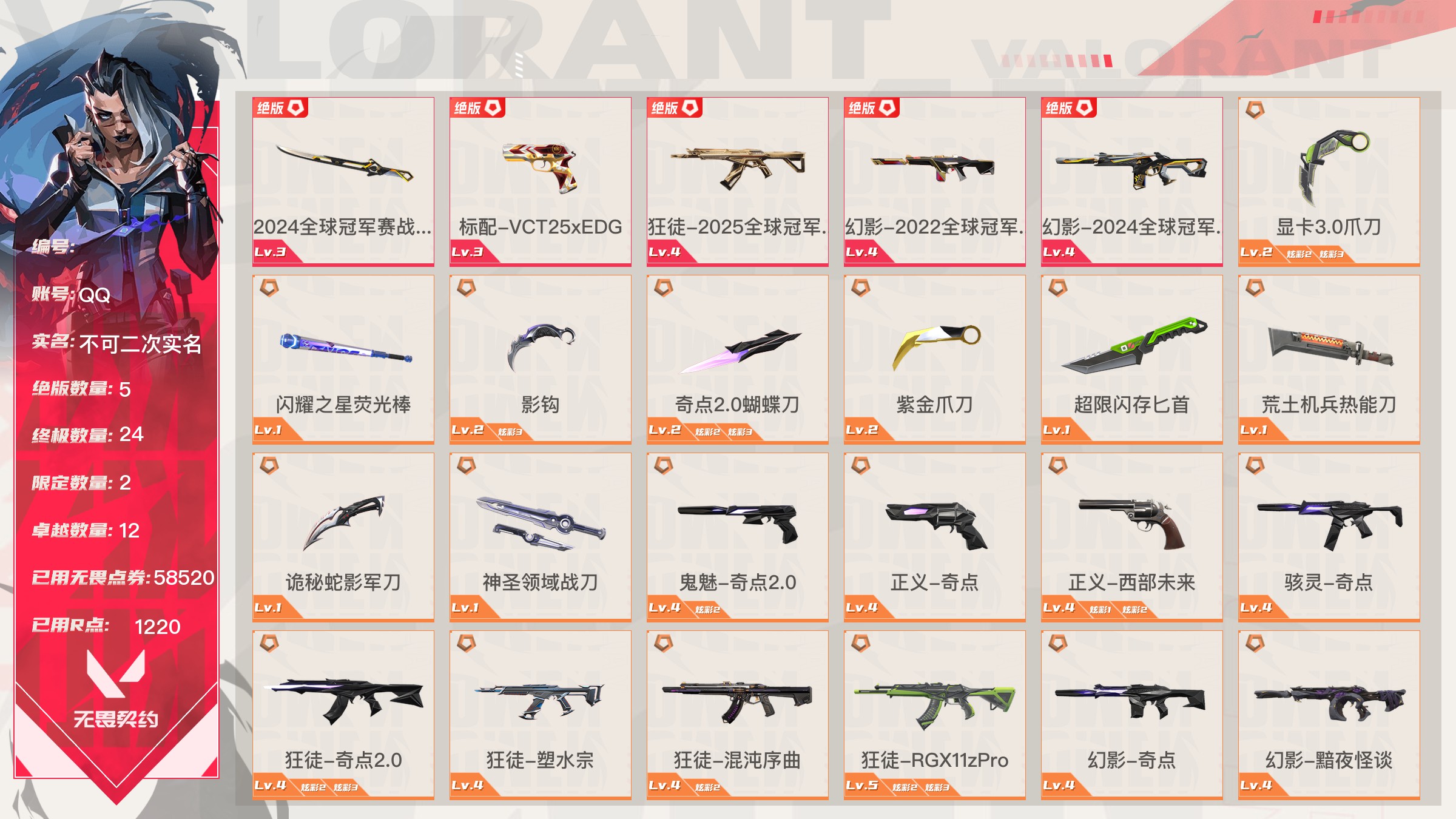 【账号佳】 【可二次实名】R43380 可二次QQ【段位铂金三】【诡秘蛇影军刀+神圣领域战刀+vct 2025爪刀+镭切+超限闪存匕首+奇点蝴蝶刀+超能偶像应援棒】【洪荒怒焰狂徒+创纪元狂徒+奇点狂徒+光明哨兵狂徒+混沌序曲狂徒+艾沃莉的梦之翼狂徒】【2024冠军赛幻影】【vct25 x blg标配】【创纪元莽侠】【创纪元正义】【创纪元骇灵】【奇点鬼魅】【紫阙金琅戍卫】【总资产32010】详情请看图片【卖号买号首选亿梦】