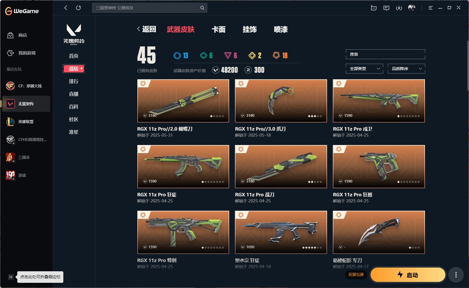 【账号佳】 【可二次实名】r44299 可二次qq《段位;超凡1》《诡秘蛇影军刀+神圣领域战刀+荒土机兵热能力+超能偶像应援棒+rgx11zPro3.0爪刀+流星兵团短剑》《rgx11zPro狂徒+光荣异象狂徒+创纪元狂徒+掠影狂徒+堕天遗武狂徒》《侦察力量幻影》《堕天遗武冥驹》《西部未来正义》《电音光谱獠犬》《vct25xth标配》《神中神罚莽侠》《天界神兵戍卫》《天界神兵鬼魅》各种道具详情看截图、低价出售找回包 赔、截图展示段位不带表实际段位,如赛季更新等不可抗拒因素发生变化、时限道具不保证所剩时间、标题未写送点券默认不送【卖号买号首选亿梦】
