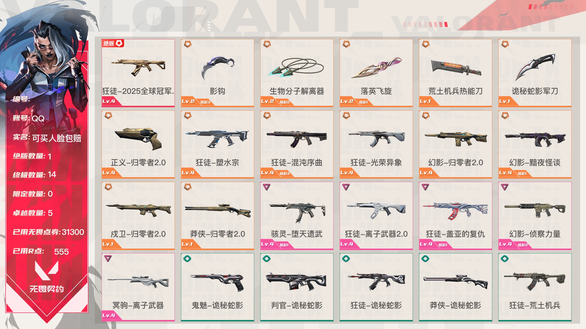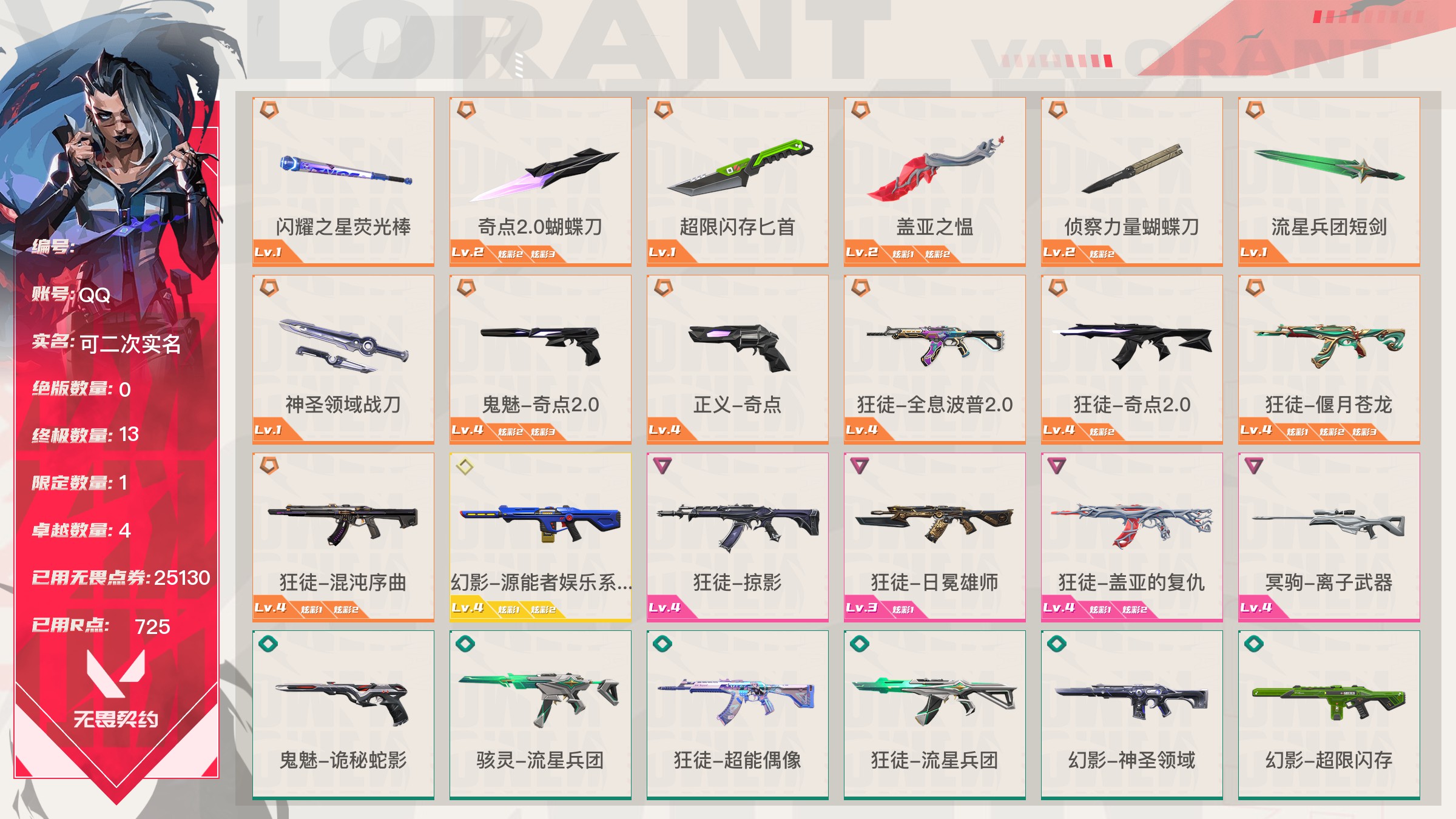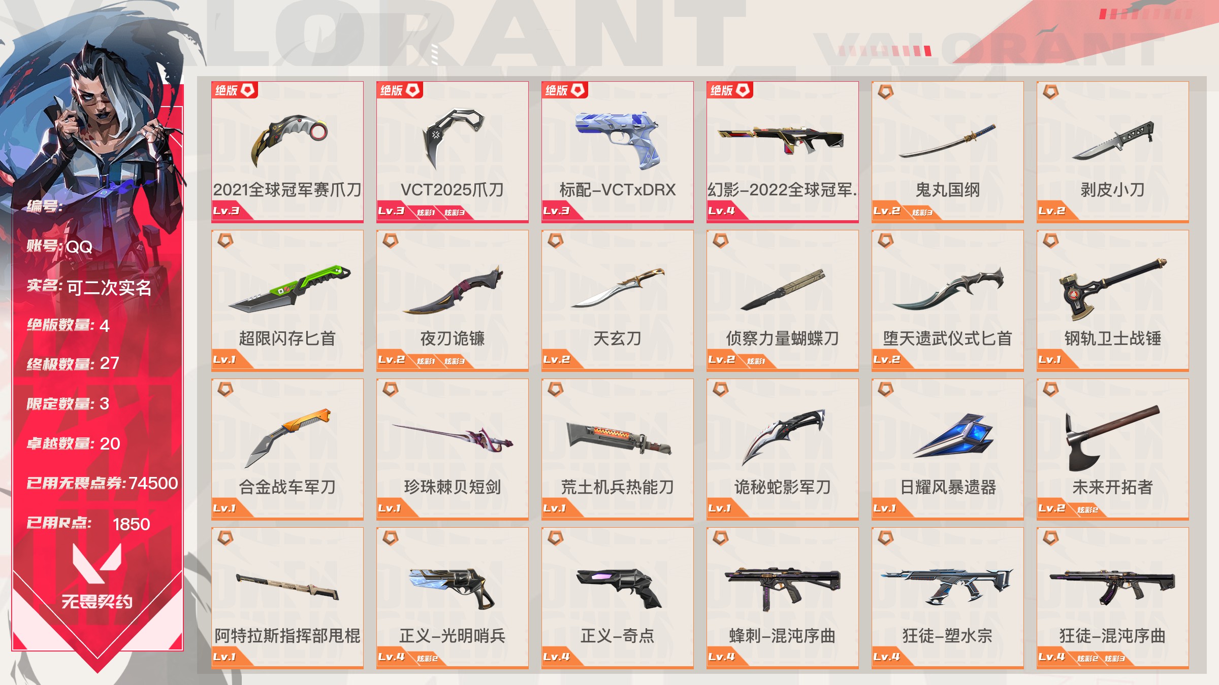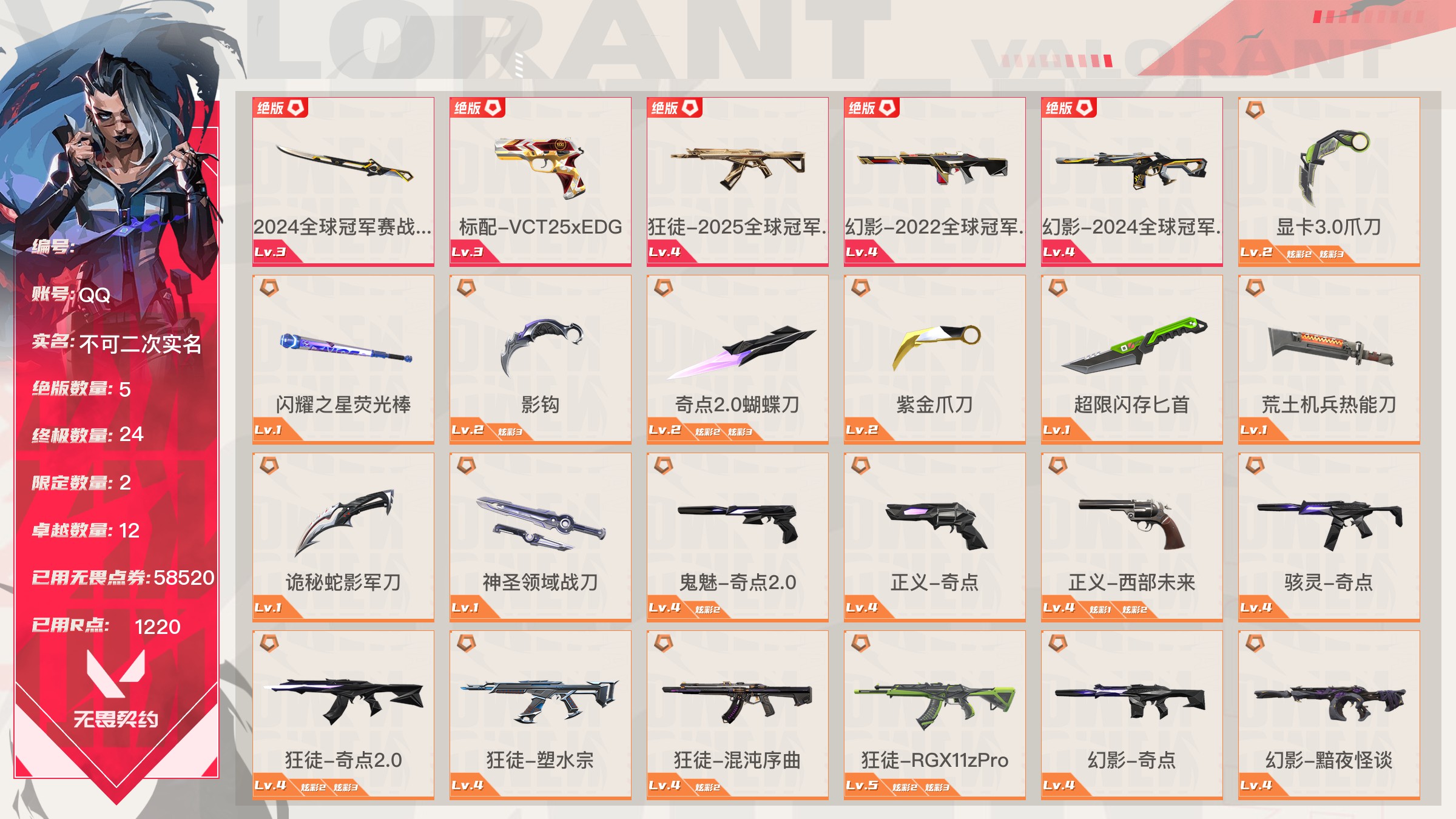 【账号佳】 【可二次实名】【69x8j21e2】lv235|未定级, 刀皮数量17,呛皮数量142(绝版4限定27终极3卓越20);皮肤资产价值74500,已用r点1850;【刀皮】:近战武器-2021全球冠军赛爪刀,近战武器-vct2025爪刀,近战武器-鬼丸国纲,近战武器-剥皮小刀,近战武器-超限闪存匕首,近战武器-夜刃诡镰,近战武器-天玄刀,近战武器-侦察力量蝴蝶刀,近战武器-堕天遗武仪式匕首,近战武器-钢轨卫士战锤,近战武器-合金战车军刀,近战武器-珍珠棘贝短剑,近战武器-荒土机兵热能刀,近战武器-诡秘蛇影军刀,近战武器-日耀风暴遗器,近战武器-未来开拓者,近战武器-阿特拉斯指挥部甩棍; 【呛皮】:标配-vctxdrx,幻影-2022全球冠军赛,正义-光明哨兵,正义-奇点,蜂刺-混沌序曲,狂徒-塑水宗,狂徒-混沌序曲,幻影-洪荒怒焰,冥驹-归零者,莽侠-显卡3.0,正义-781-a协议,狂徒-艾沃莉的梦之翼,狂徒-超时空卫队,鬼魅-盖亚的复仇,鬼魅-盖世英雄,正义-离子武器,狂怒-般若假面2.0,狂徒-掠影,狂徒-离子武器2.0,狂徒-盖亚的复仇,狂徒-堕天遗武,狂徒-耀鳞威龙,狂徒-盖世英雄,狂徒-般若假面2.0,幻影-侦察力量,幻影-天界神兵2.0,戍卫-天界神兵,獠犬-般若假面2.0,冥驹-离子武器,冥驹-起源,飞将-盖亚的复仇,奥丁-紫阙金琅2.0,战神-般若假面2.0,标配-星际猎兵,鬼魅-诡秘蛇影,正义-复古浪潮,正义-合金战车,短炮-钢轨卫士,狂怒-钢轨卫士,蜂刺-合金战车,判官-诡秘蛇影,雄鹿-复古浪潮,狂徒-诡秘蛇影,狂徒-钢轨卫士,幻影-合金战车,戍卫-钢轨卫士,獠犬-复古浪潮,冥驹-复古浪潮,飞将-合金战车,莽侠-诡秘蛇影,标配-光导纤维,鬼魅-光导纤维,鬼魅-数码咒术,短炮-深海水族,狂怒-珍珠棘贝,狂怒-花漾粉红,骇灵-珍珠棘贝,骇灵-光导纤维,骇灵-花漾粉红,蜂刺-深海水族,蜂刺-战术小伙伴,判官-数码咒术,幻影-珍珠棘贝,幻影-战术小伙伴,戍卫-珍珠棘贝,戍卫-花漾粉红,獠犬-战术小伙伴,獠犬-数码咒术,冥驹-花漾粉红,飞将-光导纤维,莽侠-深海水族,奥丁-战术小伙伴,战神-深海水族,战神-数码咒术,狂徒-阿特拉斯指挥部,狂徒-荒土机兵,幻影-日耀风暴,幻影-神圣领域,幻影-超限闪存,獠犬-神圣领域,冥驹-荒土机兵,莽侠-阿特拉斯指挥部,莽侠-超限闪存,正义-日耀风暴,正义-超限闪存,鬼魅-流星兵团,标配-阿特拉斯指挥部,标配-荒土机兵,标配-超能偶像,狂怒-神圣领域,骇灵-阿特拉斯指挥部,骇灵-日耀风暴,骇灵-荒土机兵,蜂刺-超限闪存,奥丁-日耀风暴,战神-神圣领域,幻影-悠闲猫生,幻影-末日之翼,幻影-纳米打击,戍卫-太空穿梭,戍卫-甜蜜战术,戍卫-折光棱晶,戍卫-月球哨兵,戍卫-逆冲蛮牛,戍卫-浮光跃金,獠犬-悠闲猫生,獠犬-幻语魔咒,獠犬-逆冲蛮牛,獠犬-模拟赫兹,冥驹-甜蜜战术,冥驹-星云暗涌,冥驹-模拟赫兹,莽侠-月球哨兵,飞将-悠闲猫生,飞将-幻语魔咒,飞将-末日之翼,正义-太空穿梭,正义-月球哨兵,正义-纳米打击,鬼魅-甜蜜战术,鬼魅-模拟赫兹,标配-折光棱晶,标配-浮光跃金,短炮-悠闲猫生,短炮-末日之翼,狂怒-幻语魔咒,狂怒-逆冲蛮牛,骇灵-星云暗涌,骇灵-浮光跃金,蜂刺-折光棱晶,蜂刺-星云暗涌,判官-太空穿梭,判官-甜蜜战术,判官-纳米打击,雄鹿-幻语魔咒,雄鹿-月球哨兵,雄鹿-逆冲蛮牛,雄鹿-模拟赫兹,奥丁-末日之翼,奥丁-纳米打击,战神-太空穿梭,战神-浮光跃金;【热门卡面】:无畏契约吉祥物卡面,势不可挡星礈卡面,vct2025cn联赛卡面,vct2025太平洋联赛卡面,vct2025美洲联赛卡面,vct2025emea联赛卡面,情人节捷风卡面,分崩离析卡面,双城之战拥抱卡面,九命灵猫卡面,vctcn首冠卡面,狼人猎手卡面,vctxdrx卡面,虹吸式咖啡壶卡面,势不可挡盖可卡面,逆向独行卡面,势不可挡零卡面;【热门挂饰】:云开见日挂饰,科尔宾之光挂饰,神中神挂饰,vct2025cn联赛挂饰,vct2025太平洋联赛挂饰,vct2025emea联赛挂饰,vct2025美洲联赛挂饰,第九季超凡挂饰,双城之战小蛋糕挂饰,终章ko小金人挂饰,袖珍捷风挂饰,糖葫芦挂饰,第八季超凡挂饰,vctxdrx挂饰,传世莲华挂饰,2021冠军巡回赛花火挂饰,数码咒术挂饰;【热门喷漆】:捷风跳peek喷漆,比心喷漆,真烦人喷漆,鼻尖上的蝴蝶喷漆,皮蛋呼呼喷漆,小丑猫喷漆,撸到秃喷漆,燥起来喷漆,调大音量喷漆,vctxdrx喷漆,情绪控制喷漆,双人比心喷漆,双击点赞喷漆,买装还是存钱喷漆,飓刃涂鸦喷漆,战术小伙伴喷漆,秘笈顺序喷漆,醒狮贺春喷漆,自我否定喷漆,目瞪口呆喷漆,纸箱小猫喷漆,没有资金喷漆;详情看图【皮肤可能含有某些特权皮肤,具体以游戏内实际拥有为准】【qq】【可二次实名】【官方截图】