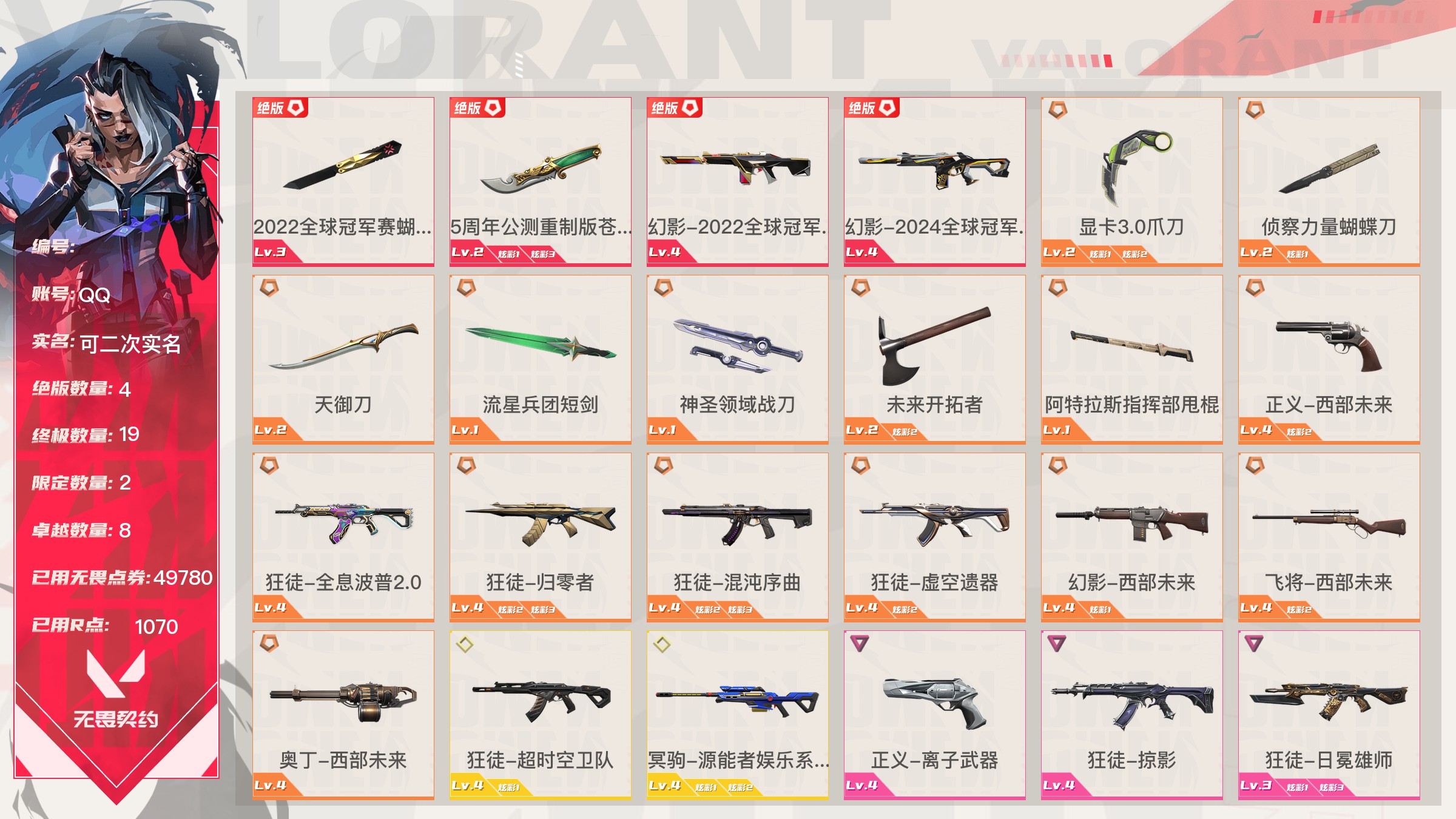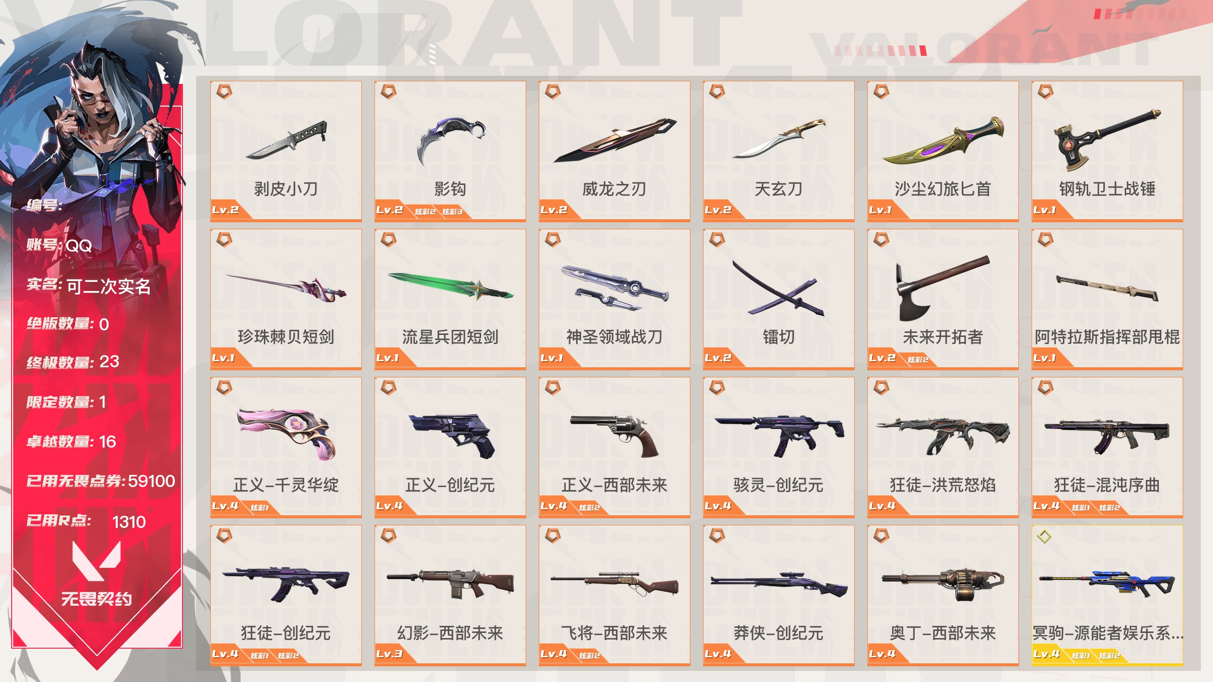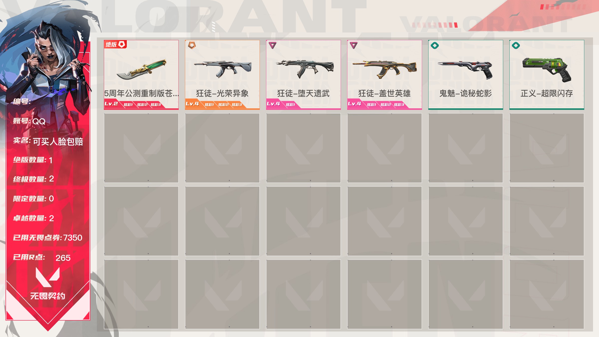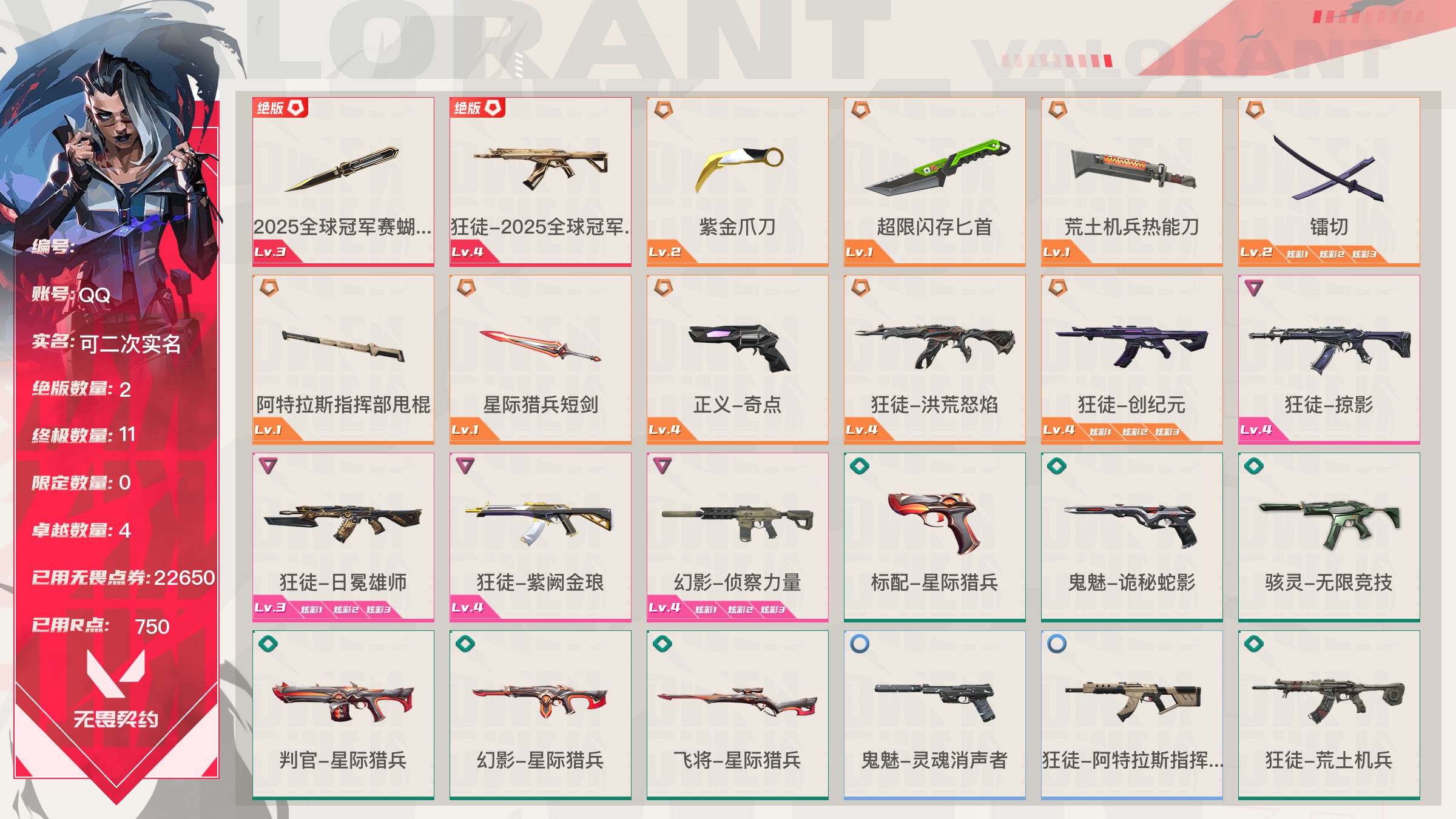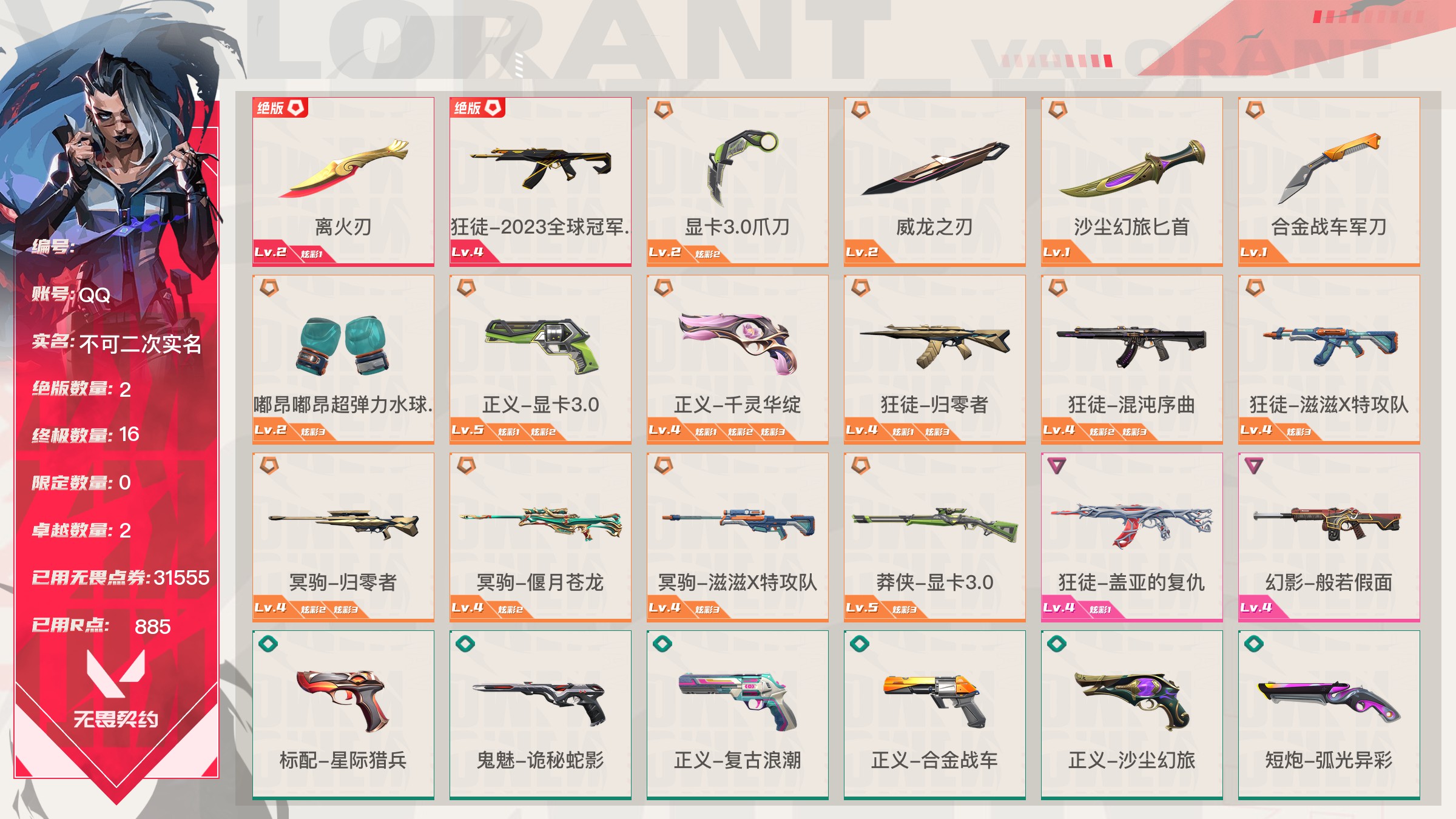 【账号佳】 【可二次实名】【69x8j21e2】lv235|未定级, 刀皮数量17,呛皮数量142(绝版4限定27终极3卓越20);皮肤资产价值74500,已用r点1850;【刀皮】:近战武器-2021全球冠军赛爪刀,近战武器-vct2025爪刀,近战武器-鬼丸国纲,近战武器-剥皮小刀,近战武器-超限闪存匕首,近战武器-夜刃诡镰,近战武器-天玄刀,近战武器-侦察力量蝴蝶刀,近战武器-堕天遗武仪式匕首,近战武器-钢轨卫士战锤,近战武器-合金战车军刀,近战武器-珍珠棘贝短剑,近战武器-荒土机兵热能刀,近战武器-诡秘蛇影军刀,近战武器-日耀风暴遗器,近战武器-未来开拓者,近战武器-阿特拉斯指挥部甩棍; 【呛皮】:标配-vctxdrx,幻影-2022全球冠军赛,正义-光明哨兵,正义-奇点,蜂刺-混沌序曲,狂徒-塑水宗,狂徒-混沌序曲,幻影-洪荒怒焰,冥驹-归零者,莽侠-显卡3.0,正义-781-a协议,狂徒-艾沃莉的梦之翼,狂徒-超时空卫队,鬼魅-盖亚的复仇,鬼魅-盖世英雄,正义-离子武器,狂怒-般若假面2.0,狂徒-掠影,狂徒-离子武器2.0,狂徒-盖亚的复仇,狂徒-堕天遗武,狂徒-耀鳞威龙,狂徒-盖世英雄,狂徒-般若假面2.0,幻影-侦察力量,幻影-天界神兵2.0,戍卫-天界神兵,獠犬-般若假面2.0,冥驹-离子武器,冥驹-起源,飞将-盖亚的复仇,奥丁-紫阙金琅2.0,战神-般若假面2.0,标配-星际猎兵,鬼魅-诡秘蛇影,正义-复古浪潮,正义-合金战车,短炮-钢轨卫士,狂怒-钢轨卫士,蜂刺-合金战车,判官-诡秘蛇影,雄鹿-复古浪潮,狂徒-诡秘蛇影,狂徒-钢轨卫士,幻影-合金战车,戍卫-钢轨卫士,獠犬-复古浪潮,冥驹-复古浪潮,飞将-合金战车,莽侠-诡秘蛇影,标配-光导纤维,鬼魅-光导纤维,鬼魅-数码咒术,短炮-深海水族,狂怒-珍珠棘贝,狂怒-花漾粉红,骇灵-珍珠棘贝,骇灵-光导纤维,骇灵-花漾粉红,蜂刺-深海水族,蜂刺-战术小伙伴,判官-数码咒术,幻影-珍珠棘贝,幻影-战术小伙伴,戍卫-珍珠棘贝,戍卫-花漾粉红,獠犬-战术小伙伴,獠犬-数码咒术,冥驹-花漾粉红,飞将-光导纤维,莽侠-深海水族,奥丁-战术小伙伴,战神-深海水族,战神-数码咒术,狂徒-阿特拉斯指挥部,狂徒-荒土机兵,幻影-日耀风暴,幻影-神圣领域,幻影-超限闪存,獠犬-神圣领域,冥驹-荒土机兵,莽侠-阿特拉斯指挥部,莽侠-超限闪存,正义-日耀风暴,正义-超限闪存,鬼魅-流星兵团,标配-阿特拉斯指挥部,标配-荒土机兵,标配-超能偶像,狂怒-神圣领域,骇灵-阿特拉斯指挥部,骇灵-日耀风暴,骇灵-荒土机兵,蜂刺-超限闪存,奥丁-日耀风暴,战神-神圣领域,幻影-悠闲猫生,幻影-末日之翼,幻影-纳米打击,戍卫-太空穿梭,戍卫-甜蜜战术,戍卫-折光棱晶,戍卫-月球哨兵,戍卫-逆冲蛮牛,戍卫-浮光跃金,獠犬-悠闲猫生,獠犬-幻语魔咒,獠犬-逆冲蛮牛,獠犬-模拟赫兹,冥驹-甜蜜战术,冥驹-星云暗涌,冥驹-模拟赫兹,莽侠-月球哨兵,飞将-悠闲猫生,飞将-幻语魔咒,飞将-末日之翼,正义-太空穿梭,正义-月球哨兵,正义-纳米打击,鬼魅-甜蜜战术,鬼魅-模拟赫兹,标配-折光棱晶,标配-浮光跃金,短炮-悠闲猫生,短炮-末日之翼,狂怒-幻语魔咒,狂怒-逆冲蛮牛,骇灵-星云暗涌,骇灵-浮光跃金,蜂刺-折光棱晶,蜂刺-星云暗涌,判官-太空穿梭,判官-甜蜜战术,判官-纳米打击,雄鹿-幻语魔咒,雄鹿-月球哨兵,雄鹿-逆冲蛮牛,雄鹿-模拟赫兹,奥丁-末日之翼,奥丁-纳米打击,战神-太空穿梭,战神-浮光跃金;【热门卡面】:无畏契约吉祥物卡面,势不可挡星礈卡面,vct2025cn联赛卡面,vct2025太平洋联赛卡面,vct2025美洲联赛卡面,vct2025emea联赛卡面,情人节捷风卡面,分崩离析卡面,双城之战拥抱卡面,九命灵猫卡面,vctcn首冠卡面,狼人猎手卡面,vctxdrx卡面,虹吸式咖啡壶卡面,势不可挡盖可卡面,逆向独行卡面,势不可挡零卡面;【热门挂饰】:云开见日挂饰,科尔宾之光挂饰,神中神挂饰,vct2025cn联赛挂饰,vct2025太平洋联赛挂饰,vct2025emea联赛挂饰,vct2025美洲联赛挂饰,第九季超凡挂饰,双城之战小蛋糕挂饰,终章ko小金人挂饰,袖珍捷风挂饰,糖葫芦挂饰,第八季超凡挂饰,vctxdrx挂饰,传世莲华挂饰,2021冠军巡回赛花火挂饰,数码咒术挂饰;【热门喷漆】:捷风跳peek喷漆,比心喷漆,真烦人喷漆,鼻尖上的蝴蝶喷漆,皮蛋呼呼喷漆,小丑猫喷漆,撸到秃喷漆,燥起来喷漆,调大音量喷漆,vctxdrx喷漆,情绪控制喷漆,双人比心喷漆,双击点赞喷漆,买装还是存钱喷漆,飓刃涂鸦喷漆,战术小伙伴喷漆,秘笈顺序喷漆,醒狮贺春喷漆,自我否定喷漆,目瞪口呆喷漆,纸箱小猫喷漆,没有资金喷漆;详情看图【皮肤可能含有某些特权皮肤,具体以游戏内实际拥有为准】【qq】【可二次实名】【官方截图】