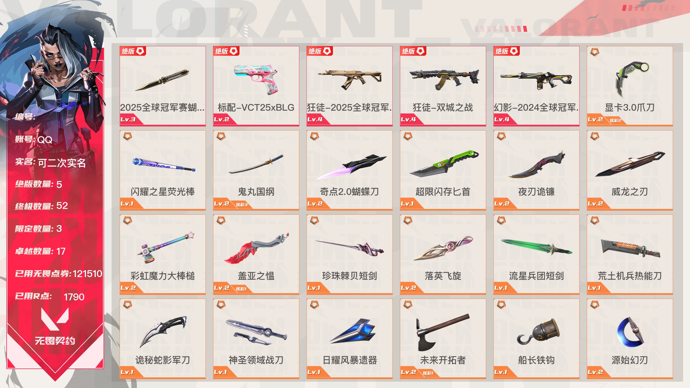 【账号佳】 【可二次实名】【69x8jhfe2】lv176|未定级, 刀皮数量23,呛皮数量168(绝版5限定52终极3卓越17);皮肤资产价值121510,已用r点1790;【刀皮】:近战武器-2025全球冠军赛蝴蝶刀,近战武器-显卡3.0爪刀,近战武器-闪耀之星荧光棒,近战武器-鬼丸国纲,近战武器-奇点2.0蝴蝶刀,近战武器-超限闪存匕首,近战武器-夜刃诡镰,近战武器-威龙之刃,近战武器-彩虹魔力大棒槌,近战武器-盖亚之愠,近战武器-珍珠棘贝短剑,近战武器-落英飞旋,近战武器-流星兵团短剑,近战武器-荒土机兵热能刀,近战武器-诡秘蛇影军刀,近战武器-神圣领域战刀,近战武器-日耀风暴遗器,近战武器-未来开拓者,近战武器-船长铁钩,近战武器-源始幻刃,近战武器-超时空卫队三棱军刺,近战武器-嘟昂嘟昂超弹力水球拳套,近战武器-星际猎兵短剑; 【呛皮】:标配-vct25xblg,狂徒-2025全球冠军赛,狂徒-双城之战,幻影-2024全球冠军赛,鬼魅-奇点2.0,正义-奇点,正义-千灵华绽,正义-西部未来,正义-虚空遗器,判官-千灵华绽,判官-虚空遗器,狂徒-全息波普2.0,狂徒-奇点2.0,狂徒-塑水宗,狂徒-洪荒怒焰,狂徒-混沌序曲,狂徒-创纪元,狂徒-虚空遗器,狂徒-rgx11zpro,狂徒-光荣异象,幻影-千灵华绽,幻影-西部未来,幻影-虚空遗器,幻影-电音光谱,冥驹-归零者,冥驹-千灵华绽,飞将-塑水宗,飞将-西部未来,奥丁-西部未来,狂徒-艾沃莉的梦之翼,狂徒-上古龙炎,狂徒-超时空卫队,标配-海洋之星2.0,鬼魅-耀鳞威龙,狂怒-般若假面2.0,狂徒-掠影,狂徒-日冕雄师,狂徒-离子武器2.0,狂徒-盖亚的复仇,狂徒-紫阙金琅,狂徒-堕天遗武,狂徒-耀鳞威龙,狂徒-盖世英雄,狂徒-般若假面2.0,幻影-海洋之星2.0,獠犬-般若假面2.0,獠犬-海洋之星2.0,奥丁-海洋之星2.0,战神-般若假面2.0,标配-星际猎兵,鬼魅-诡秘蛇影,正义-复古浪潮,骇灵-流星兵团,判官-星际猎兵,判官-诡秘蛇影,雄鹿-复古浪潮,狂徒-诡秘蛇影,幻影-星际猎兵,幻影-浪漫雪国,獠犬-复古浪潮,獠犬-金纹世家,冥驹-复古浪潮,飞将-星际猎兵,莽侠-诡秘蛇影,短炮-深海水族,狂怒-珍珠棘贝,骇灵-珍珠棘贝,蜂刺-深海水族,幻影-珍珠棘贝,戍卫-珍珠棘贝,莽侠-深海水族,战神-深海水族,狂徒-阿特拉斯指挥部,狂徒-荒土机兵,狂徒-超能偶像,狂徒-流星兵团,幻影-日耀风暴,幻影-神圣领域,幻影-超限闪存,戍卫-超能偶像,獠犬-神圣领域,冥驹-荒土机兵,莽侠-阿特拉斯指挥部,莽侠-超限闪存,正义-日耀风暴,正义-超限闪存,鬼魅-流星兵团,标配-荒土机兵,标配-超能偶像,狂怒-神圣领域,骇灵-阿特拉斯指挥部,骇灵-日耀风暴,骇灵-荒土机兵,蜂刺-超限闪存,判官-超能偶像,奥丁-日耀风暴,奥丁-流星兵团,战神-神圣领域,狂徒-瑰梦艺语,幻影-末日之翼,幻影-纳米打击,幻影-聚合之力,戍卫-光环序列,戍卫-太空穿梭,戍卫-甜蜜战术,戍卫-折光棱晶,戍卫-月球哨兵,戍卫-逆冲蛮牛,戍卫-浮光跃金,戍卫-战术熊与伙伴们,獠犬-悠闲猫生,獠犬-幻语魔咒,獠犬-逆冲蛮牛,獠犬-模拟赫兹,獠犬-采蜜小蜂队,冥驹-光环序列,冥驹-甜蜜战术,冥驹-星云暗涌,冥驹-模拟赫兹,莽侠-月球哨兵,莽侠-纤云弄巧,飞将-悠闲猫生,飞将-幻语魔咒,飞将-末日之翼,飞将-聚合之力,飞将-战术熊与伙伴们,正义-太空穿梭,正义-月球哨兵,正义-纳米打击,正义-纤云弄巧,鬼魅-瑰梦艺语,鬼魅-甜蜜战术,鬼魅-星云暗涌,鬼魅-模拟赫兹,鬼魅-采蜜小蜂队,标配-折光棱晶,标配-浮光跃金,标配-战术熊与伙伴们,短炮-悠闲猫生,短炮-末日之翼,短炮-纤云弄巧,狂怒-光环序列,狂怒-幻语魔咒,狂怒-逆冲蛮牛,狂怒-聚合之力,狂怒-战术熊与伙伴们,骇灵-瑰梦艺语,骇灵-星云暗涌,骇灵-浮光跃金,蜂刺-折光棱晶,蜂刺-星云暗涌,蜂刺-聚合之力,蜂刺-纤云弄巧,判官-太空穿梭,判官-甜蜜战术,判官-纳米打击,判官-采蜜小蜂队,雄鹿-瑰梦艺语,雄鹿-幻语魔咒,雄鹿-月球哨兵,雄鹿-逆冲蛮牛,雄鹿-模拟赫兹,奥丁-末日之翼,奥丁-纳米打击,战神-光环序列,战神-太空穿梭,战神-浮光跃金,战神-采蜜小蜂队;【热门卡面】:势不可挡幽影卡面,势不可挡不死鸟卡面,噬影者卡面,布鲁诺中校卡面,势不可挡星礈卡面,西部未来卡面,vct25xblg卡面,贤者之泪卡面,分崩离析卡面,双城之战拥抱卡面,vctcn首冠卡面,捣蛋鬼出没卡面,分神的决斗者卡面,超能偶像卡面,千灵华绽卡面,虹吸式咖啡壶卡面;【热门挂饰】:蓄势待滚挂饰,v25第三幕神话挂饰,双城之战魄罗挂饰,神中神挂饰,西部未来挂饰,好运喵挂饰,vctxblg挂饰,双城之战小蛋糕挂饰,双面黑猫挂饰,终章ko小金人挂饰,奇点2.0挂饰,鱼骨头挂饰,袖珍捷风挂饰,糖葫芦挂饰,超能偶像挂饰,改变者全球冠军赛奖杯挂饰,迷你机甲挂饰,千灵华绽挂饰,珍珠奶茶挂饰,云开见日挂饰,传世莲华挂饰,爱与和平挂饰;【热门喷漆】:战术小伙伴喷漆,不留痕迹喷漆,悲与喜喷漆,捷风跳peek喷漆,西部未来喷漆,真烦人喷漆,vctxblg喷漆,鼻尖上的蝴蝶喷漆,喵呜喷漆,皮蛋呼呼喷漆,奇点2.0喷漆,小丑猫喷漆,超能偶像喷漆,皮蛋萌舞喷漆,开心到爆炸喷漆,别挡我的路喷漆,纸箱小猫喷漆,买装还是存钱喷漆,情绪控制喷漆,双人比心喷漆,双击点赞喷漆;详情看图【皮肤可能含有某些特权皮肤,具体以游戏内实际拥有为准】【qq】【可二次实名】【官方截图】