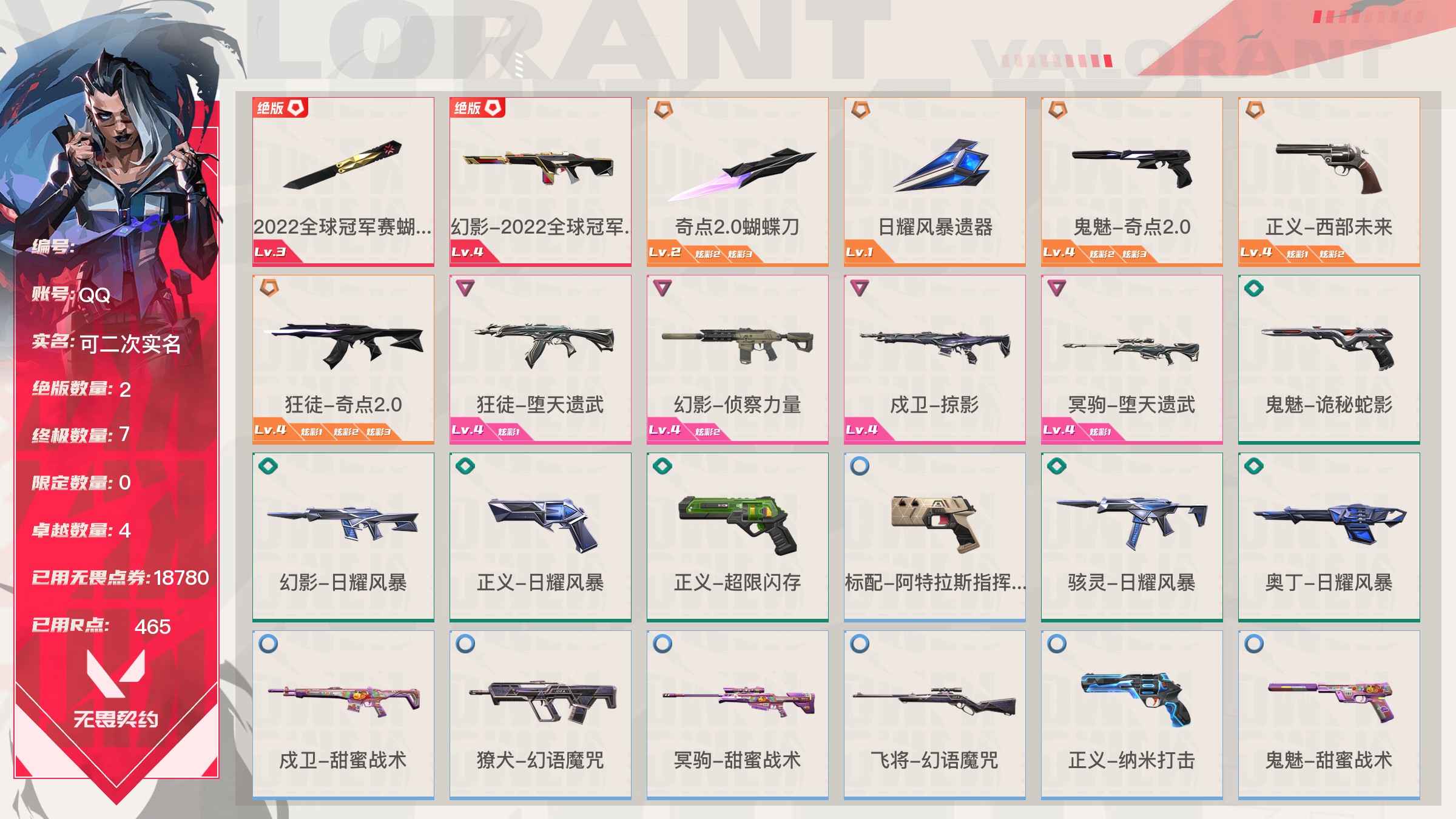 【账号佳】 【可二次实名】【69x8jg1fb】lv121|未定级, 刀皮数量3,呛皮数量25(绝版2限定7终极0卓越4);皮肤资产价值18780,已用r点465;【刀皮】:近战武器-2022全球冠军赛蝴蝶刀,近战武器-奇点2.0蝴蝶刀,近战武器-日耀风暴遗器; 【呛皮】:幻影-2022全球冠军赛,鬼魅-奇点2.0,正义-西部未来,狂徒-奇点2.0,狂徒-堕天遗武,幻影-侦察力量,戍卫-掠影,冥驹-堕天遗武,鬼魅-诡秘蛇影,幻影-日耀风暴,正义-日耀风暴,正义-超限闪存,标配-阿特拉斯指挥部,骇灵-日耀风暴,奥丁-日耀风暴,戍卫-甜蜜战术,獠犬-幻语魔咒,冥驹-甜蜜战术,飞将-幻语魔咒,正义-纳米打击,鬼魅-甜蜜战术,鬼魅-星云暗涌,狂怒-幻语魔咒,判官-甜蜜战术,雄鹿-幻语魔咒;【热门卡面】:双城之战拥抱卡面,vctcn首冠卡面;【热门挂饰】:双城之战魄罗挂饰,神中神挂饰,双城之战小蛋糕挂饰,终章ko小金人挂饰,奇点2.0挂饰;【热门喷漆】:捷风跳peek喷漆,2022全球冠军赛喷漆,随机武器喷漆,买装还是存钱喷漆,放下武器喷漆,奇点2.0喷漆,小丑猫喷漆;详情看图【皮肤可能含有某些特权皮肤,具体以游戏内实际拥有为准】【qq】【可二次实名】【官方截图】