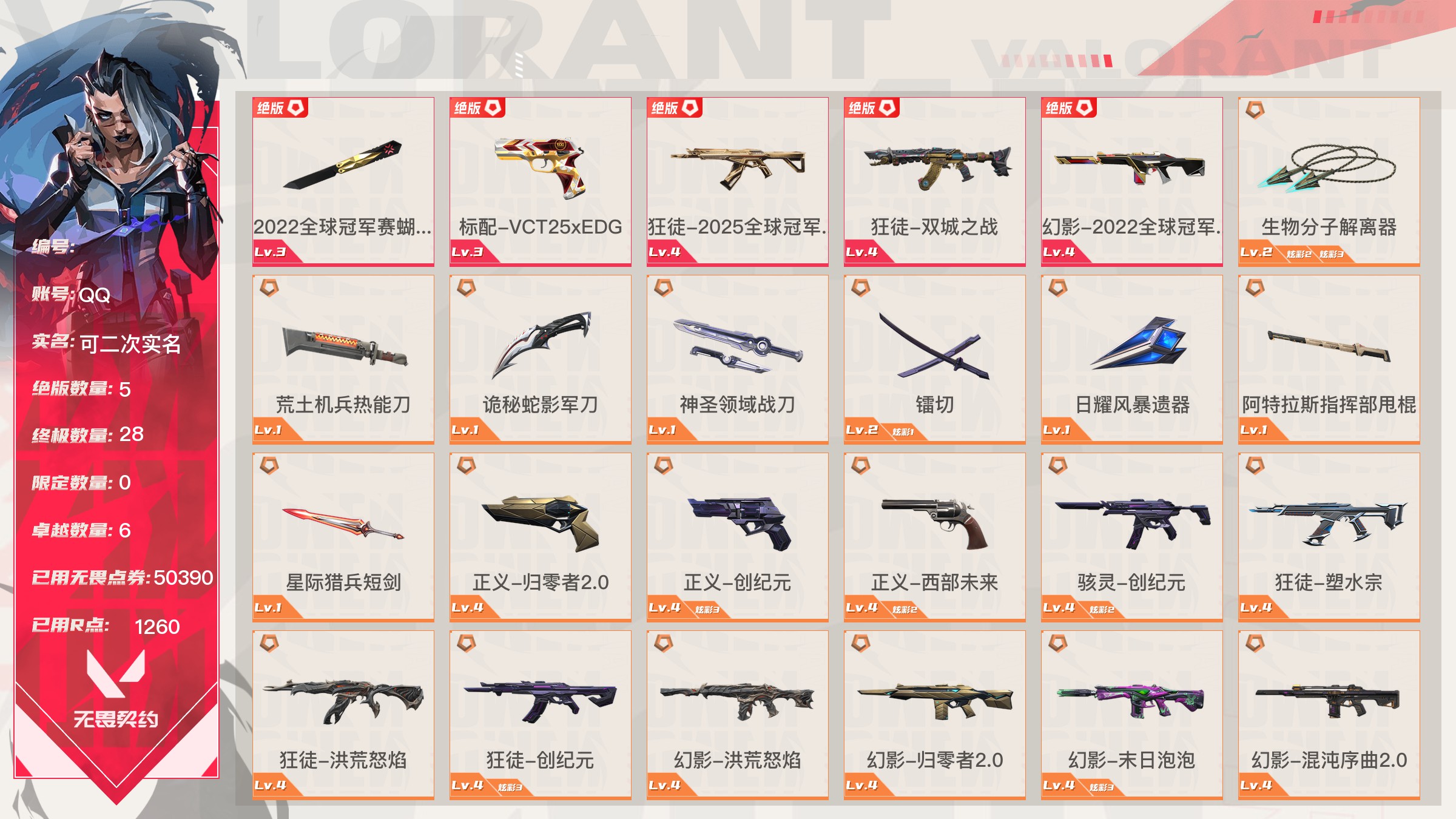 【账号佳】 【可二次实名】【69x8j1ga2】lv195|未定级, 刀皮数量9,呛皮数量98(绝版5限定28终极0卓越6);皮肤资产价值50390,已用r点1260;【刀皮】:近战武器-2022全球冠军赛蝴蝶刀,近战武器-生物分子解离器,近战武器-荒土机兵热能刀,近战武器-诡秘蛇影军刀,近战武器-神圣领域战刀,近战武器-镭切,近战武器-日耀风暴遗器,近战武器-阿特拉斯指挥部甩棍,近战武器-星际猎兵短剑; 【呛皮】:标配-vct25xedg,狂徒-2025全球冠军赛,狂徒-双城之战,幻影-2022全球冠军赛,正义-归零者2.0,正义-创纪元,正义-西部未来,骇灵-创纪元,狂徒-塑水宗,狂徒-洪荒怒焰,狂徒-创纪元,幻影-洪荒怒焰,幻影-归零者2.0,幻影-末日泡泡,幻影-混沌序曲2.0,戍卫-归零者2.0,冥驹-rgx11zpro2.0,莽侠-归零者2.0,莽侠-创纪元,狂徒-掠影,狂徒-盖亚的复仇,狂徒-耀鳞威龙,狂徒-起源,狂徒-海洋之星,幻影-侦察力量,标配-星际猎兵,鬼魅-诡秘蛇影,骇灵-无限竞技,判官-星际猎兵,判官-诡秘蛇影,狂徒-诡秘蛇影,幻影-星际猎兵,飞将-星际猎兵,莽侠-诡秘蛇影,狂徒-阿特拉斯指挥部,狂徒-荒土机兵,幻影-日耀风暴,幻影-神圣领域,獠犬-神圣领域,冥驹-荒土机兵,莽侠-阿特拉斯指挥部,正义-日耀风暴,正义-超限闪存,标配-阿特拉斯指挥部,标配-荒土机兵,狂怒-神圣领域,骇灵-阿特拉斯指挥部,骇灵-日耀风暴,骇灵-荒土机兵,奥丁-日耀风暴,战神-神圣领域,狂徒-瑰梦艺语,幻影-悠闲猫生,幻影-末日之翼,幻影-纳米打击,戍卫-光环序列,戍卫-太空穿梭,戍卫-甜蜜战术,戍卫-折光棱晶,戍卫-月球哨兵,戍卫-逆冲蛮牛,獠犬-悠闲猫生,獠犬-幻语魔咒,獠犬-逆冲蛮牛,冥驹-光环序列,冥驹-甜蜜战术,冥驹-星云暗涌,莽侠-月球哨兵,飞将-悠闲猫生,飞将-幻语魔咒,飞将-末日之翼,正义-太空穿梭,正义-月球哨兵,正义-纳米打击,鬼魅-瑰梦艺语,鬼魅-甜蜜战术,鬼魅-星云暗涌,标配-折光棱晶,短炮-悠闲猫生,短炮-末日之翼,狂怒-光环序列,狂怒-幻语魔咒,狂怒-逆冲蛮牛,骇灵-瑰梦艺语,骇灵-星云暗涌,蜂刺-折光棱晶,蜂刺-星云暗涌,判官-太空穿梭,判官-甜蜜战术,判官-纳米打击,雄鹿-瑰梦艺语,雄鹿-幻语魔咒,雄鹿-月球哨兵,雄鹿-逆冲蛮牛,奥丁-末日之翼,奥丁-纳米打击,战神-光环序列,战神-太空穿梭;【热门卡面】:势不可挡贤者卡面,星宿灿烂猎枭卡面,势不可挡蝰蛇卡面,势不可挡捷风卡面,势不可挡星礈卡面,vct25xedg卡面,势不可挡ko卡面,分崩离析卡面,双城之战拥抱卡面,双城之战金克丝卡面;【热门挂饰】:双城之战魄罗挂饰,神中神挂饰,创纪元挂饰,vctxedg挂饰,双城之战小蛋糕挂饰,鱼骨头挂饰,终章ko小金人挂饰;【热门喷漆】:放下武器喷漆,2022全球冠军赛喷漆,捷风跳peek喷漆,无条件投降喷漆,真烦人喷漆,vctxedg喷漆,鼻尖上的蝴蝶喷漆,买装还是存钱喷漆,小丑猫喷漆;详情看图【皮肤可能含有某些特权皮肤,具体以游戏内实际拥有为准】【qq】【可二次实名】【官方截图】