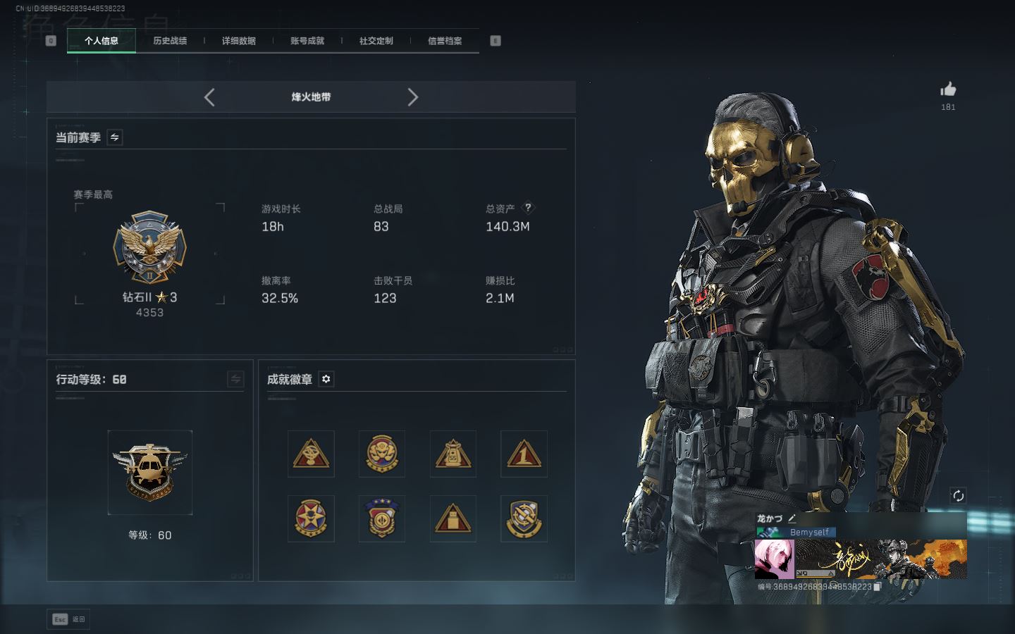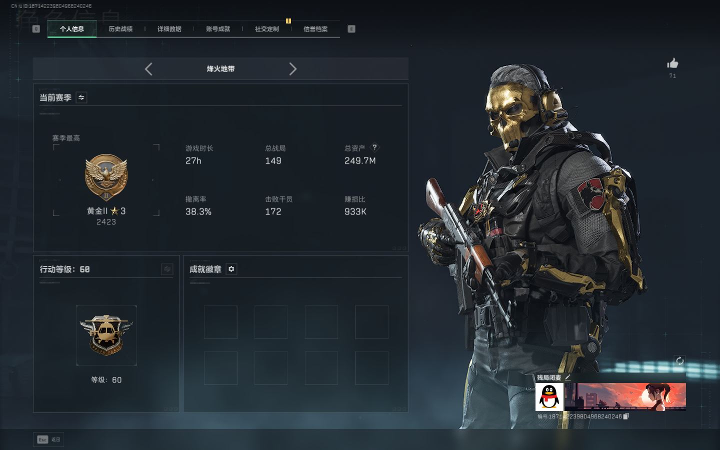 【账号佳】 ljh AK027631 包人脸 行动等级60黄金 知足192.5m 满体 s7赛季3*3【P90冲锋枪-信条SR-25射手步枪-信条KC17突击步枪-电锯惊魂SG552突击步枪-运动员M250通用机枪-骑士ASh-12战斗步枪-鹅鸭杀 】【近战 信条 黑鹰】【角色皮肤 红狼-电锯惊魂 深蓝-不破誓约 骇爪-维什戴尔 】----安全箱等时效性道具请以游戏内数据为准:详情请看图----截图展示段位不代实际段位,赛季更新等不可抗拒因素发生变化、时限道具不保证所剩时间、标题未写送三角币默认不送】【主播担保+安全至上+性价比 买号卖号只选金牌商家一左友】