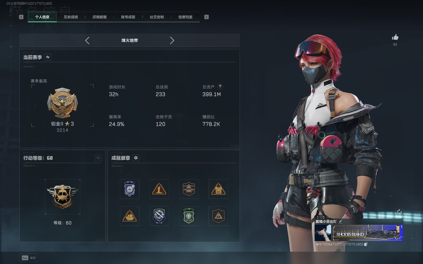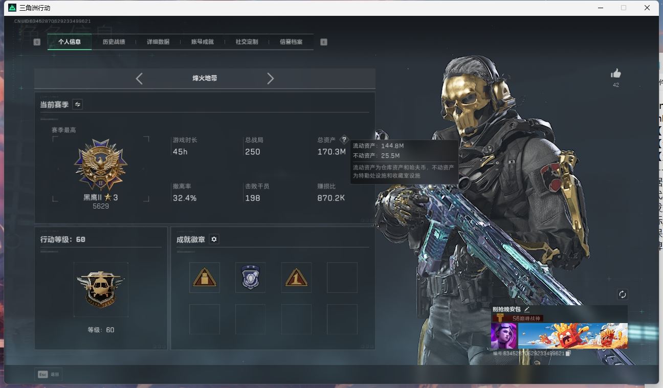 【账号佳】 ljh AK027526 包人脸 行动等级60铂金 总资产399.1m 满体 s7赛季3*3 六套多多 102发aw子弹【KC17突击步枪-电锯惊魂M250通用机枪-骑士之心ASh-12战斗步枪-鹅鸭杀0C0171冲锋枪-鹅鸭撒谎QJB201轻机枪-鹅鸭杀SCAR-H战斗步枪-启航联动 Vector冲锋枪-能天使联动 M4A1突击步枪-阿米娅 】【近战 黑鹰 】【角色皮肤 红狼-电锯惊魂 蛊-能天使午夜邮差 深蓝-不破誓约】----安全箱等时效性道具请以游戏内数据为准:详情请看图----截图展示段位不代实际段位,赛季更新等不可抗拒因素发生变化、时限道具不保证所剩时间、标题未写送三角币默认不送】【主播担保+安全至上+性价比 买号卖号只选金牌商家一左友】