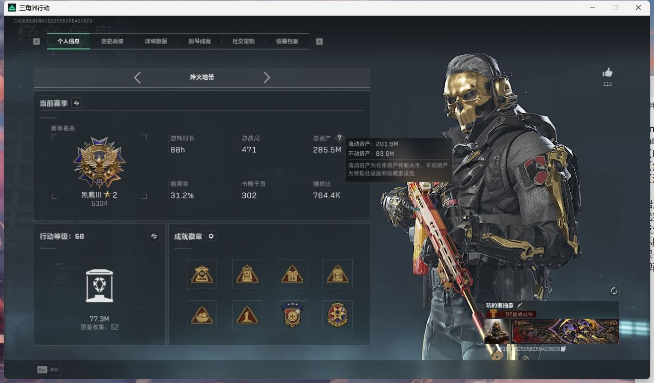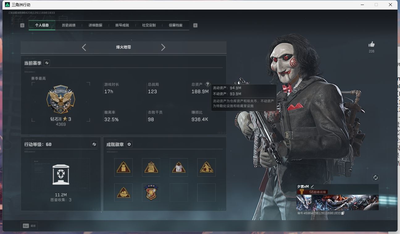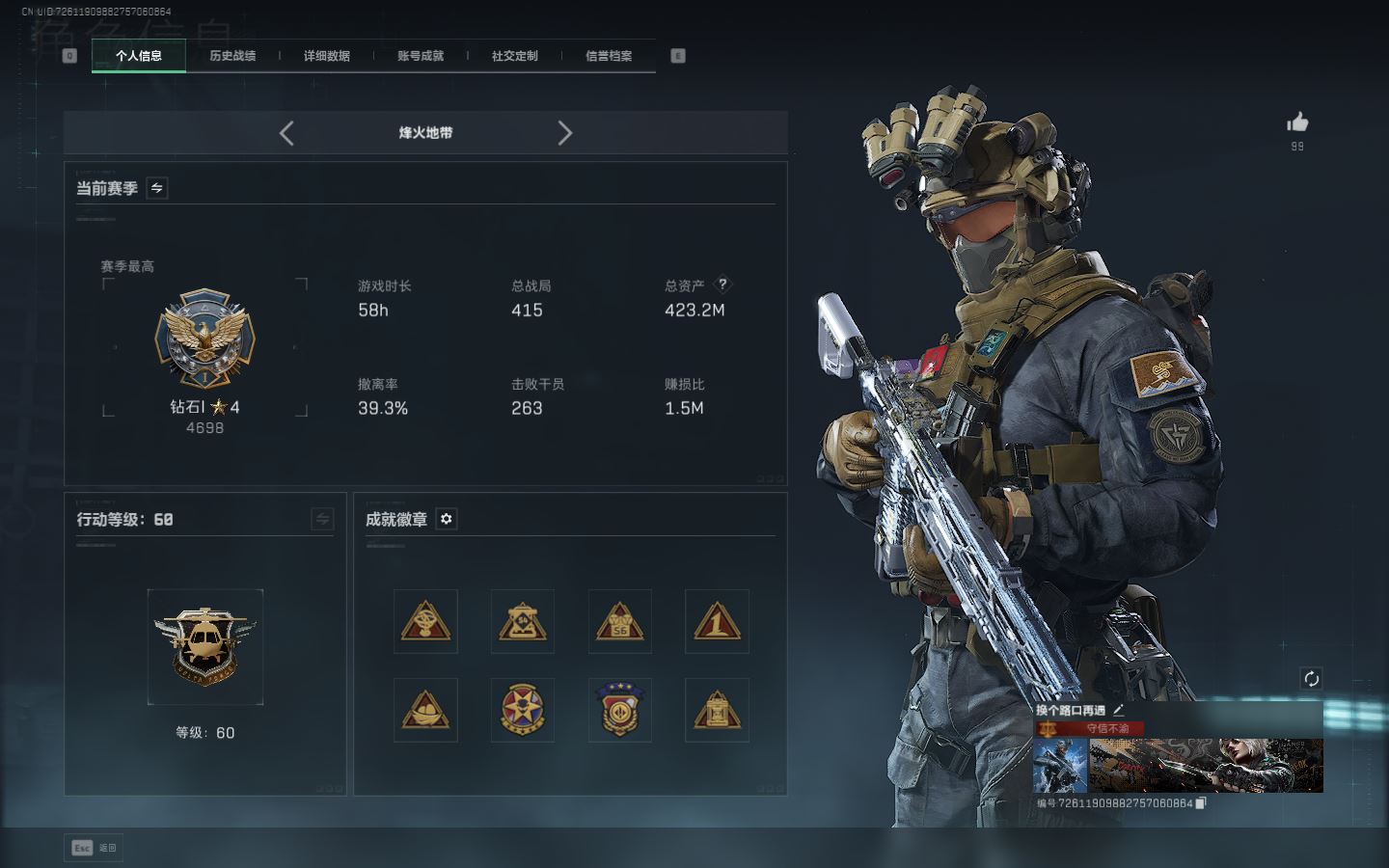 【账号佳】 ljh AK027234 有二次 行动等级60钻石 总资产423.2m 特勤处就差收藏室没满 s7赛季3*3【典藏 m7棱镜攻势s2(优品s)毁灭之源2s】【P90冲锋枪-信条SR-25射手步枪-信条 腾龙突击步枪-死神玫瑰M250通用机枪-骑士之心ASh-12战斗步枪-鹅鸭杀0C0171冲锋枪-鹅鸭杀 联动 R93狙击步枪-维什戴尔M16A4突击步枪-狩猎时刻G3战斗步枪-狩猎时刻Vector冲锋枪-狩猎时刻 SR-3M紧凑突击步枪-特斯拉线圈联动 复合弓-黑-天际线联动 CAR-15突击步枪-阿米娅联动 725双管弹枪-送葬人-无题密令 】【近战 信条 影锋 黑鹰】【角色皮肤 蜂医-送葬人无题密令 牧羊人-街头之王 深蓝-不破誓约 骇爪-维什戴尔 】----安全箱等时效性道具请以游戏内数据为准:详情请看图----截图展示段位不代实际段位,赛季更新等不可抗拒因素发生变化、时限道具不保证所剩时间、标题未写送三角币默认不送】【主播担保+安全至上+性价比 买号卖号只选金牌商家一左友】