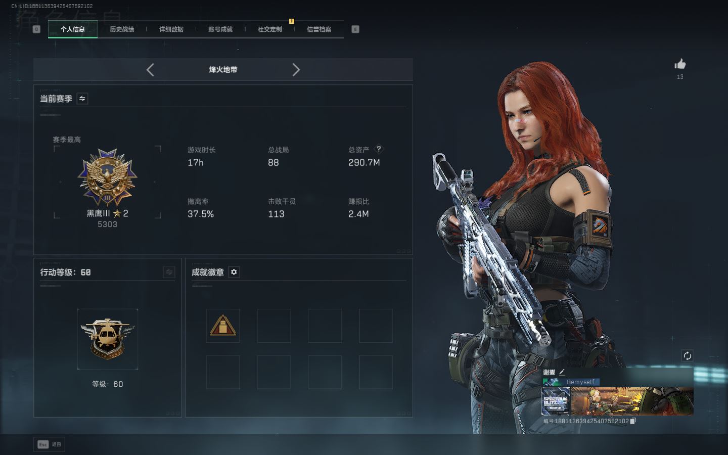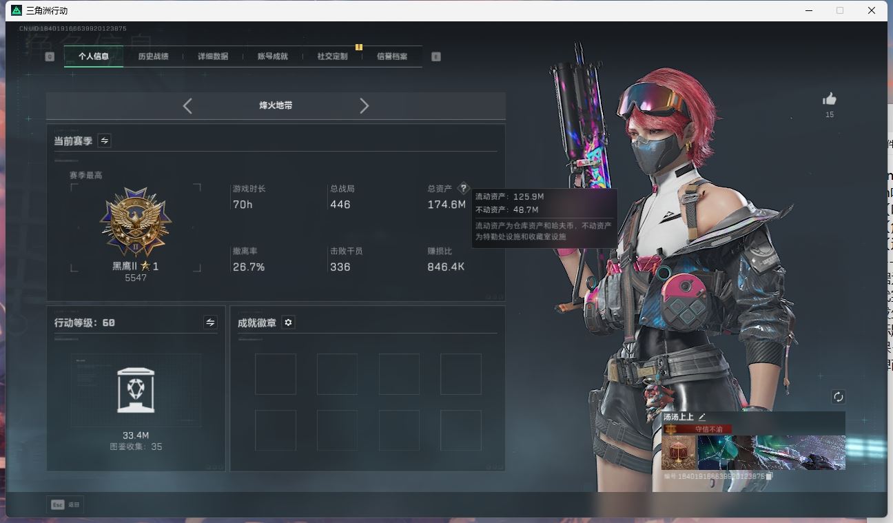 【账号佳】 hmc AK027670 行动等级:60黑鹰,总资产170m哈夫币 【2s毁灭之源 100aw子弹 s7赛季33】【AUG突击步枪-气象感应(优品c 冰)M7战斗步枪-棱镜攻势S2(极品c)】【呛皮:KC17突击步枪-电锯惊魂P90冲锋枪-信条SR-25射手步枪-信条AS Val突击步枪-死神玫瑰联动 R93狙击步枪-维什戴尔ASh-12战斗步枪-鹅鸭杀0CQ171冲锋枪-鹅鸭杀 0JB201轻机枪-鹅鸭杀M4A1突击步枪-蚀金玫瑰SCAR-H战斗步枪-启航M250通用机枪-骑士之AK-12突击步枪-特斯拉线圈UZ1冲锋枪-特斯拉线圈 SR-3M紧凑突击步枪-特斯拉线围腾龙突击步枪-捞点警条AWM狙击步枪-捞点薯条93R-捞点著条联动 CAR-15突击步枪-阿米娅联动 M4A1突击步枪-阿米娅】【角色皮肤:红狼-蚀金玫瑰 蛊-能天使午夜邮差 露娜-黑天际线 骇爪-维什戴尔 红狼-电锯惊魂 深蓝-不破誓约】【近战:近战-信条 黑鹰 】----安全箱等时效性道具请以游戏内数据为准:详情请看图----截图展示段位不代实际段位,赛季更新等不可抗拒因素发生变化、时限道具不保证所剩时间、标题未写送三角币默认不送】【主播担保+安全至上+性价比 买号卖号只选金牌商家一左友】