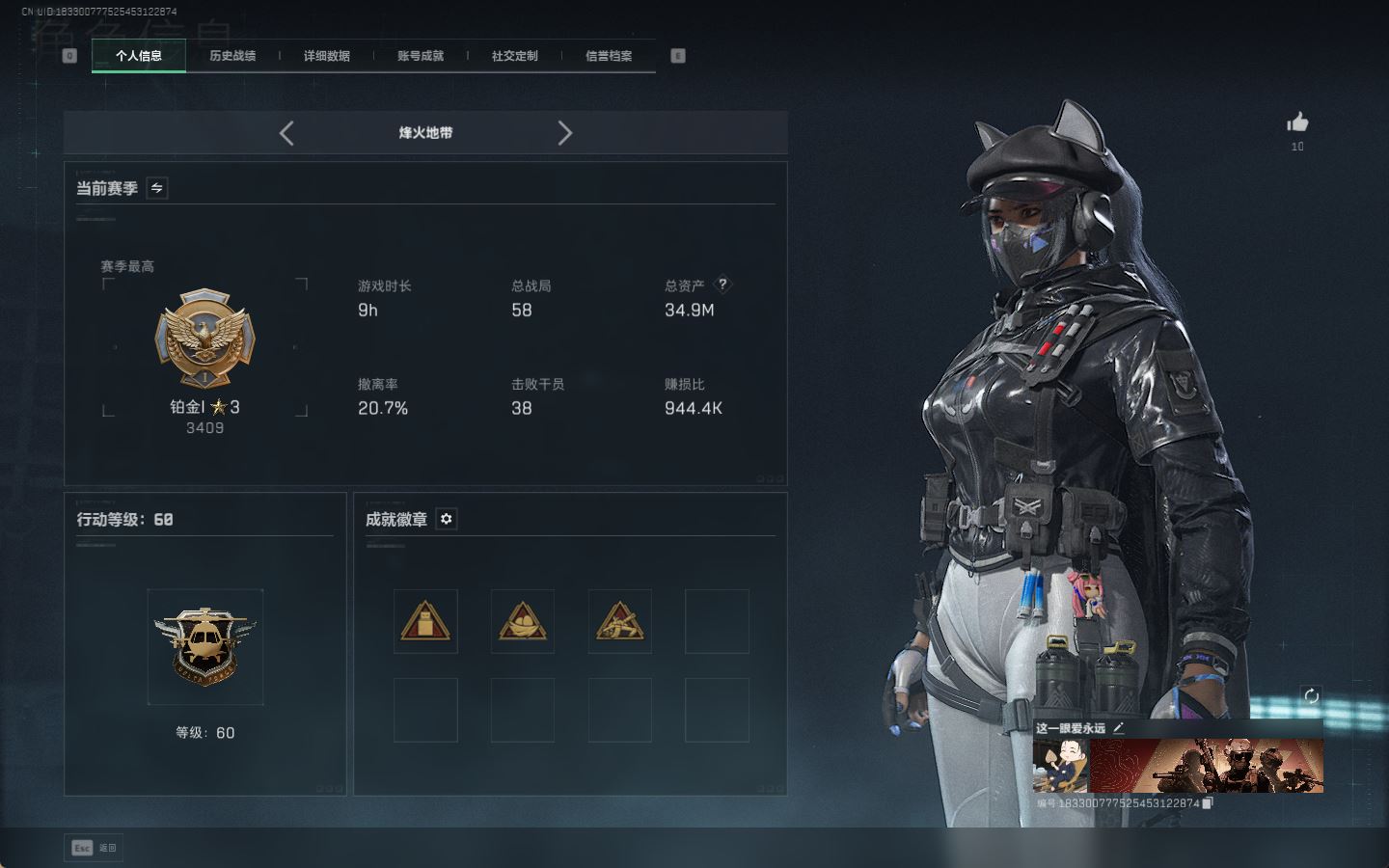 【账号佳】 ljh AK027993 包人脸 行动等级60铂金 总资产34.9m 满体【S12K霰弹枪-电锯惊魂M14射手步枪-电锯惊魂ASh-12战斗步枪-鹅鸭杀0CQ171冲锋枪-鹅鸭杀QJ日201轻机枪-期鸭杀SCAR-H战斗步枪-启航腾龙突击步枪-捞点薯条 UZ1冲锋枪-特斯拉线圈SR-3M紧凑突击步枪-特斯拉线圈联动 勇士冲锋枪-能无使-午夜邮差联动 M4A1突击步枪-阿米娅 】【近战 电锯 黑鹰】【角色皮肤 露娜-黑天际线 】----更多炫彩背包/光效/名片/武器具体看图!截图展示段位不代实际段位,赛季更新等不可抗拒因素发生变化、时限道具不保证所剩时间、标题未写送点卷默认不送】【主播担保+安全至上+性价比 买号卖号只选金牌商家一左友】