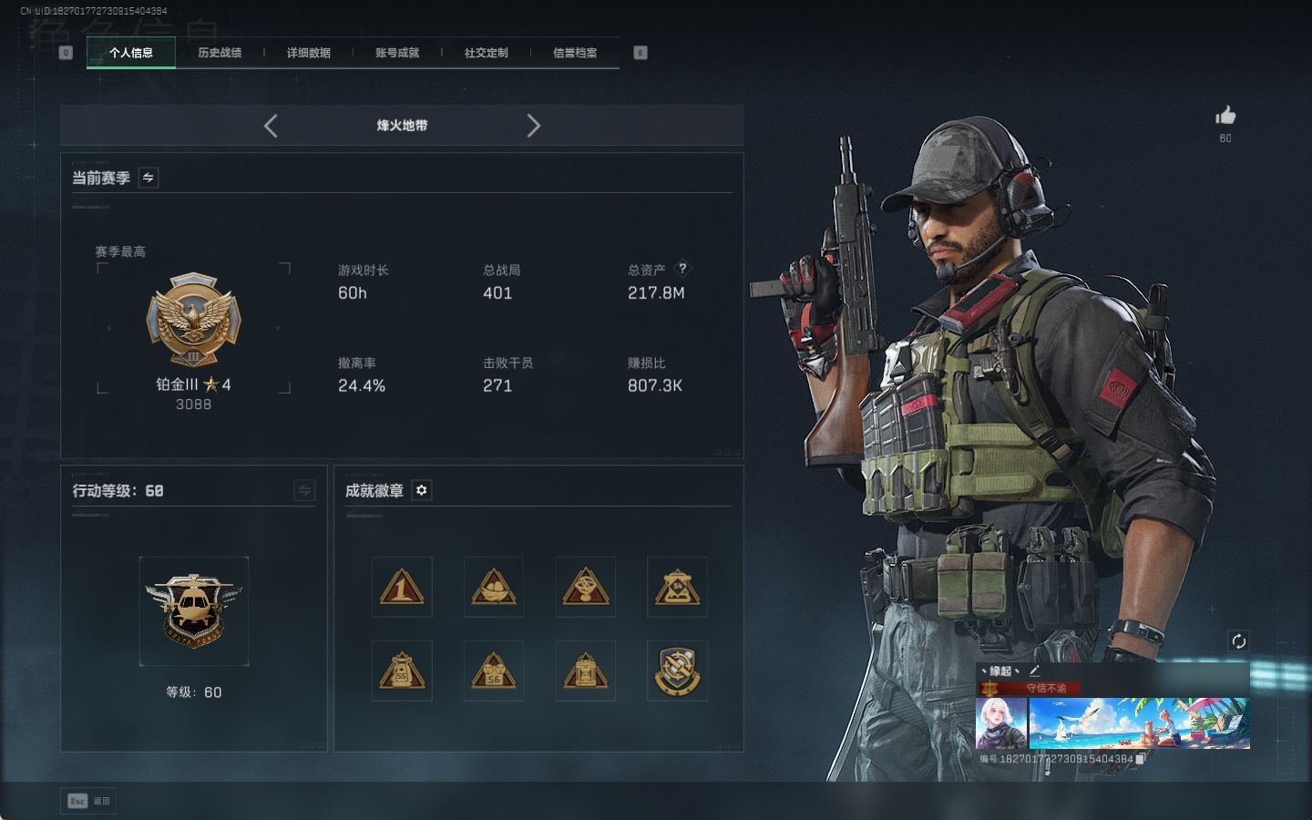 【账号佳】 ljh AK028140 有二次 行动等级60级铂金 总资产264.7m 特勤处 除仓库全满级 s7赛季3*3 66发aw【KC17突击步枪-电锯惊魂M4A1突击步枪-蚀金玫瑰SCAR-H战斗步枪-启航G3战斗步枪-骑士M250通用机枪-骑士之心AK-12突击步枪-特斯拉线圈UZI冲锋枪-特斯拉线圈SR-3M紧凑突击步枪-特斯拉线圈联动 M4A1突击步枪-阿米娅联动 勇士冲锋枪-能天使-午夜邮差M16A4突击步枪-狩猎时刻G3战斗步枪-狩猎时刻Vector冲锋枪-狩猎时刻联动 CAR-15突击步枪-阿米娅联动 复合弓-黑-天际线 K437突击步枪-北极星0C0171冲锋枪-北极星AK-12突击步枪-夜鹰】【近战-北极星 黑鹰】【红狼-蚀金玫瑰 红狼-电锯惊魂 无名-夜鹰 深蓝-不破誓约 】----安全箱等时效性道具请以游戏内数据为准:详情请看图----截图展示段位不代实际段位,赛季更新等不可抗拒因素发生变化、时限道具不保证所剩时间、标题未写送三角币默认不送】【主播担保+安全至上+性价比 买号卖号只选金牌商家一左友】