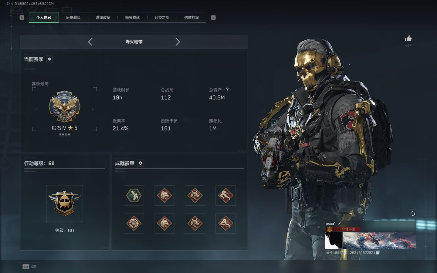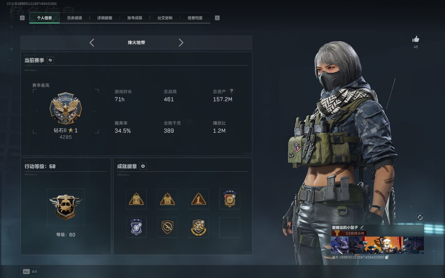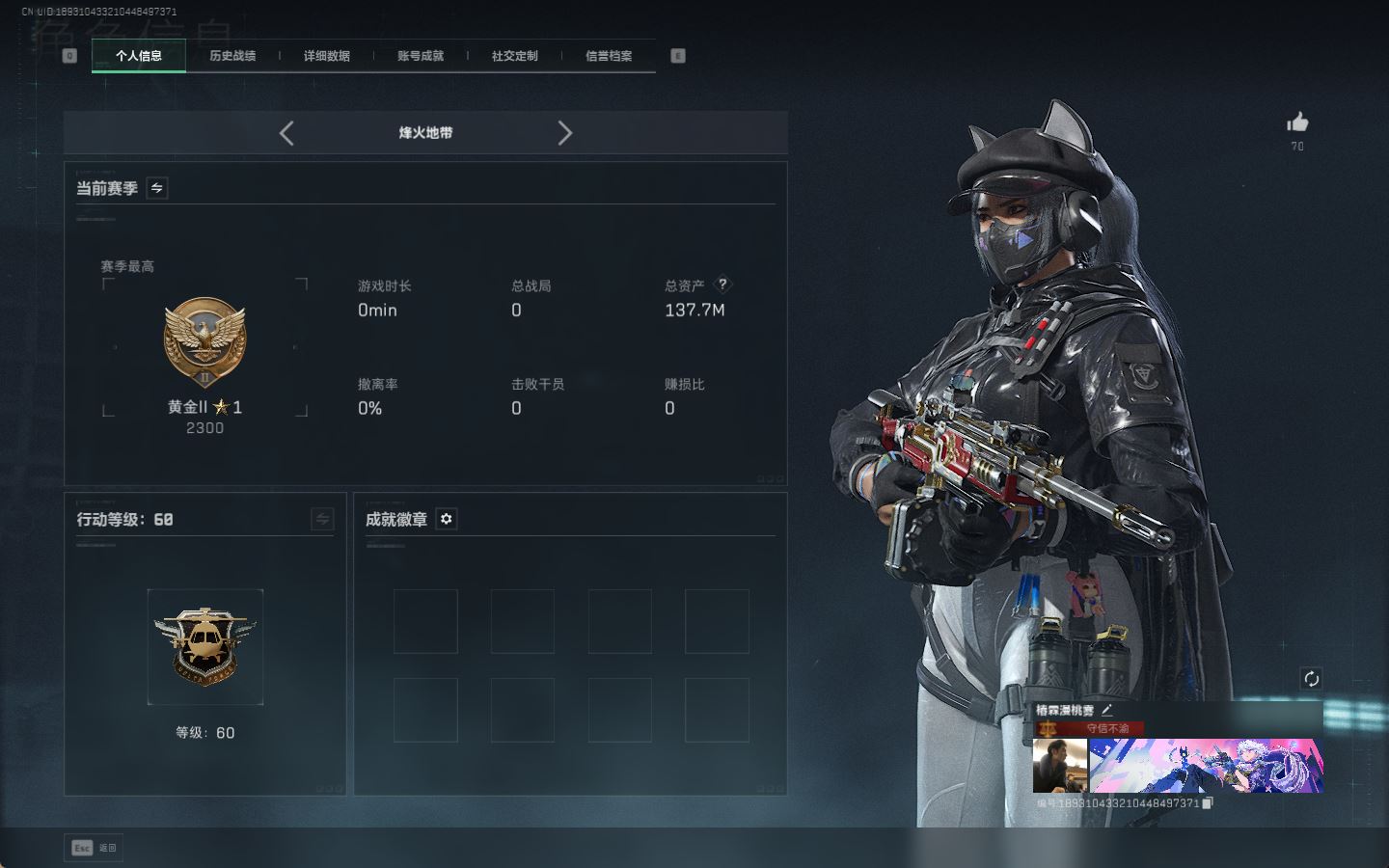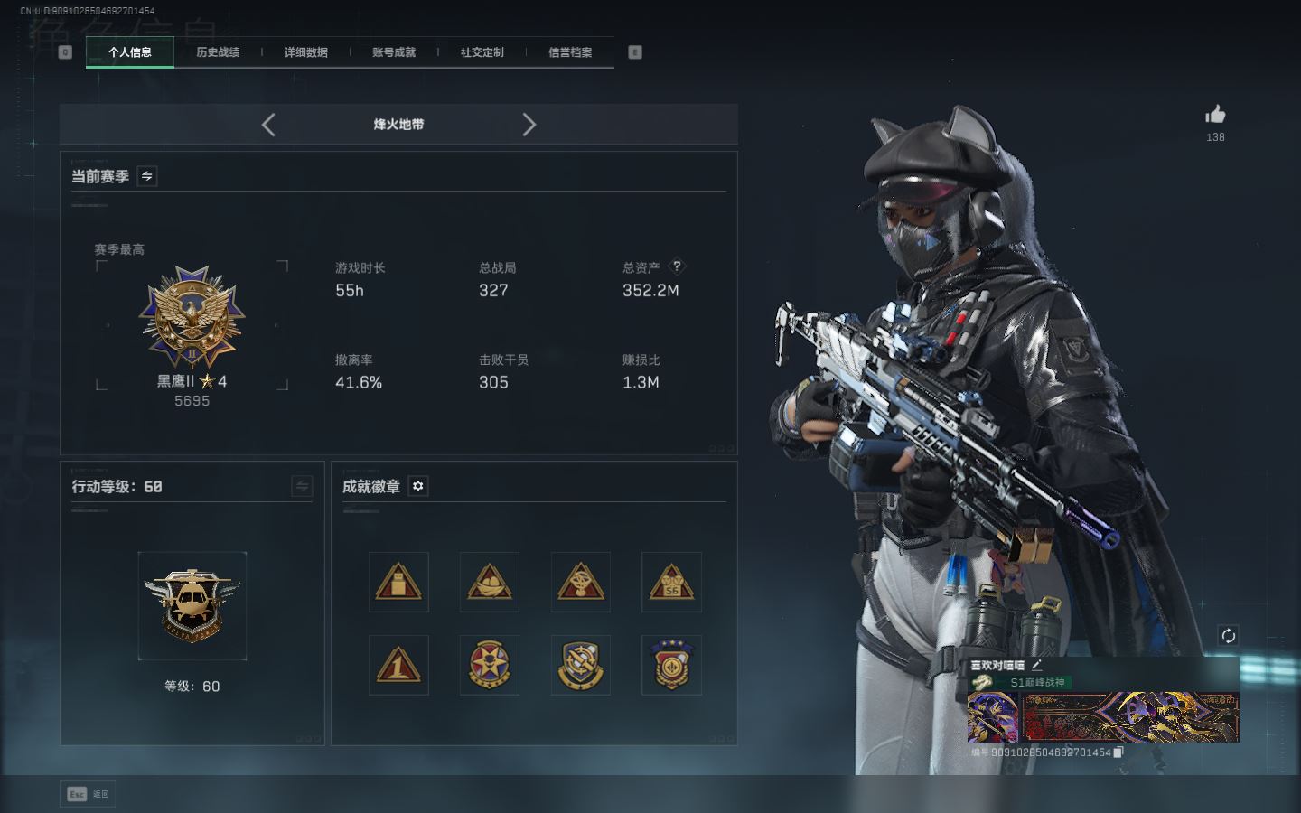 【账号佳】 ljh AK025697 包人脸 行动等级60黄金 总资产137.7m【SCAR-H战斗步枪-启航腾龙突击步枪-捞点薯条AWM狙击步枪-捞点薯条93R-捞点薯条联动 M4A1突击步枪-阿米娅联动 勇士冲锋枪-能天使-午夜邮差M16A4突击步枪-狩猎时刻 】【近战 黑鹰】【角色皮肤 无名-夜鹰 蜂医-送葬人无题密令 露娜-黑天际线 】----更多炫彩背包/光效/名片/武器具体看图!截图展示段位不代实际段位,赛季更新等不可抗拒因素发生变化、时限道具不保证所剩时间、标题未写送点卷默认不送】【主播担保+安全至上+性价比 买号卖号只选金牌商家一左友】