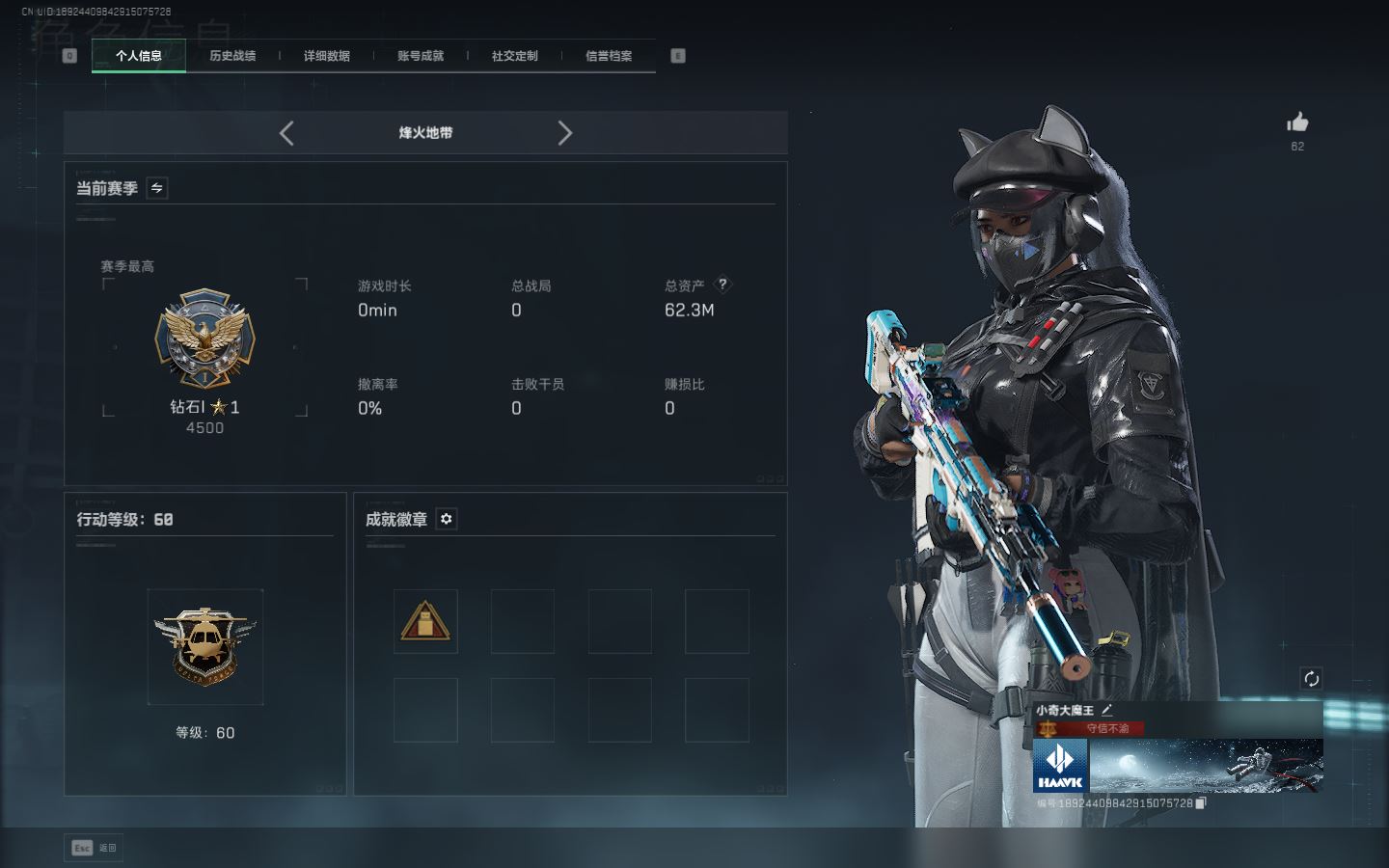 【账号佳】 ljh AK026089 包人脸 行动等级60钻石 总资产62.3m 68发aw子弹【M4A1突击步枪-蚀金玫瑰G3战斗步枪-骑士M250通用机枪-骑士之心ASh-12战斗步枪-鹅鸭杀0CQ171冲锋枪-鹅鸭杀0J日201轻机枪-鹅鸭杀SCAR-H战斗步枪-启航 SR-3M紧凑突击步枪-特斯拉线圈联动 M4A1突击步枪-阿米娅联动 勇士冲锋枪-能无使-午夜邮差腾龙突击步枪-捞点薯条AWM狙击步枪-捞点薯条 】【近战 北极星 黑鹰】【角色皮肤 红狼-蚀金玫瑰 威龙-飞虎 无名-夜鹰 蜂医-送葬人无题密令 深蓝-不破誓约 露娜-黑天际线 】----安全箱等时效性道具请以游戏内数据为准:详情请看图----截图展示段位不代实际段位,赛季更新等不可抗拒因素发生变化、时限道具不保证所剩时间、标题未写送三角币默认不送】【主播担保+安全至上+性价比 买号卖号只选金牌商家一左友】