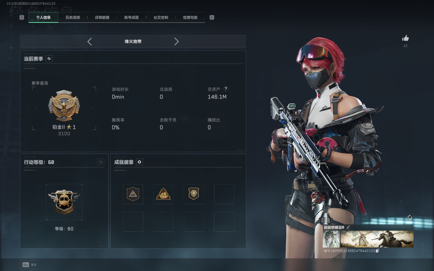 【账号佳】 ljh AK026835 包人脸 行动等级60铂金 总资产146.1m【ASh-12战斗步枪-鹅鸭杀QC0171冲锋枪-鹅鸭杀0JB201轻机枪-鹅鸭杀SCAR-H战斗步枪-启航M250通用机枪-骑士联动 CAR-15突击步枪-阿米娅联动 M4A1突击步枪-阿米娅腾龙突击步枪-捞点薯条 】【近战 黑鹰】【角色皮肤 红狼-电锯惊魂 蛊-午夜邮差 】----安全箱等时效性道具请以游戏内数据为准:详情请看图----截图展示段位不代实际段位,赛季更新等不可抗拒因素发生变化、时限道具不保证所剩时间、标题未写送三角币默认不送】【主播担保+安全至上+性价比 买号卖号只选金牌商家一左友】
