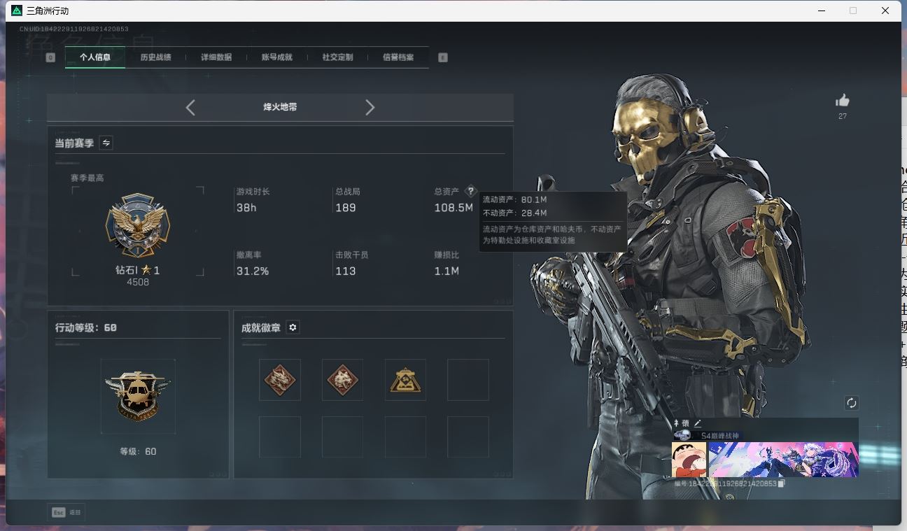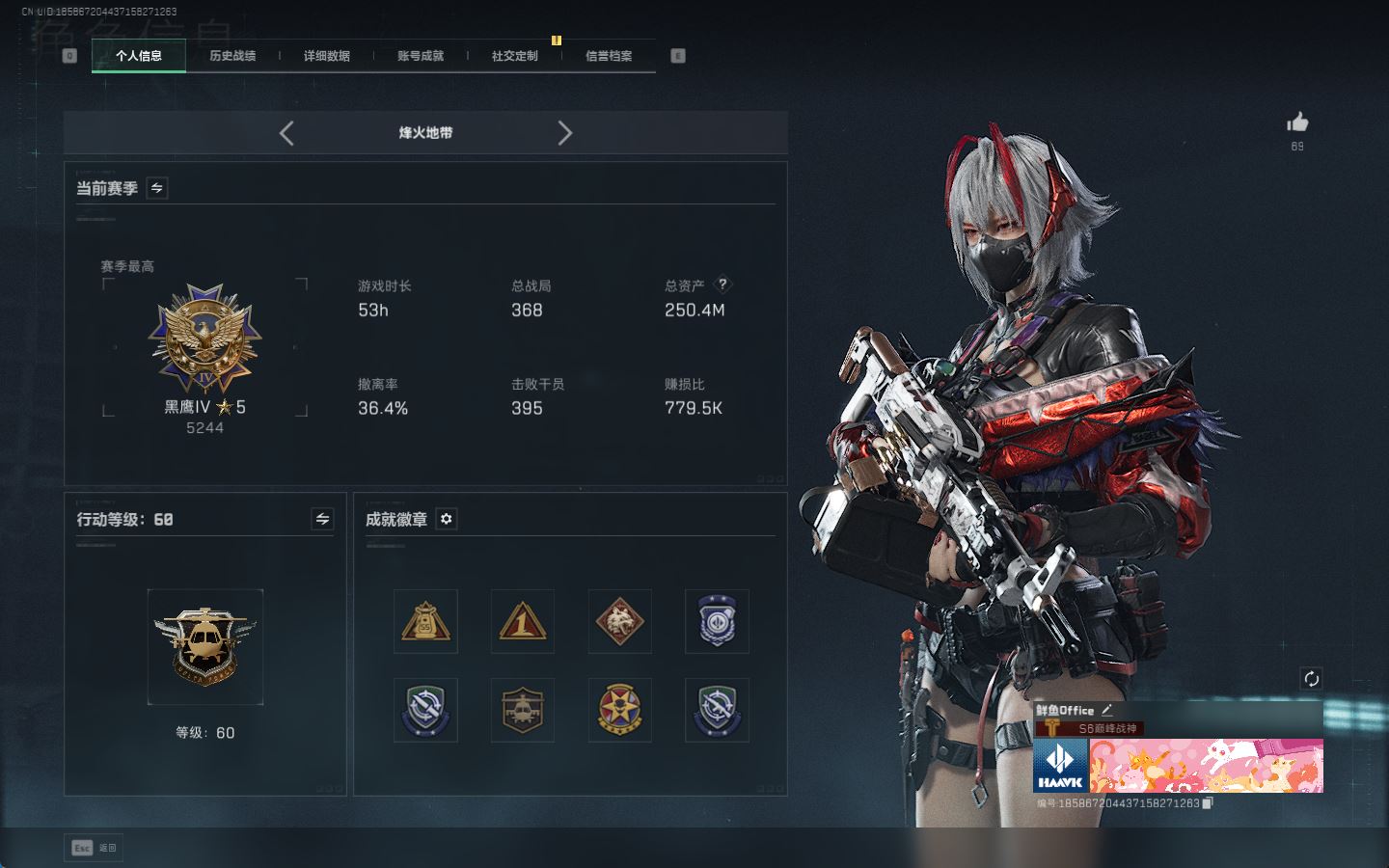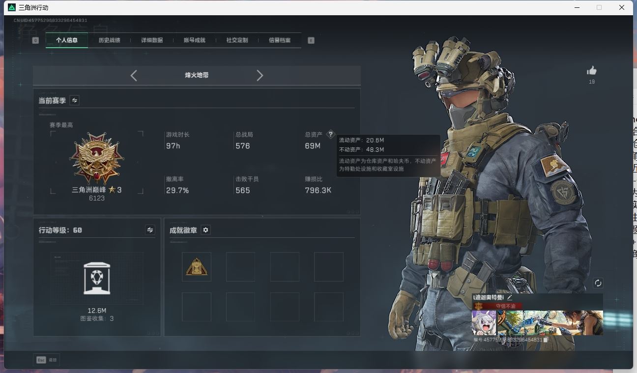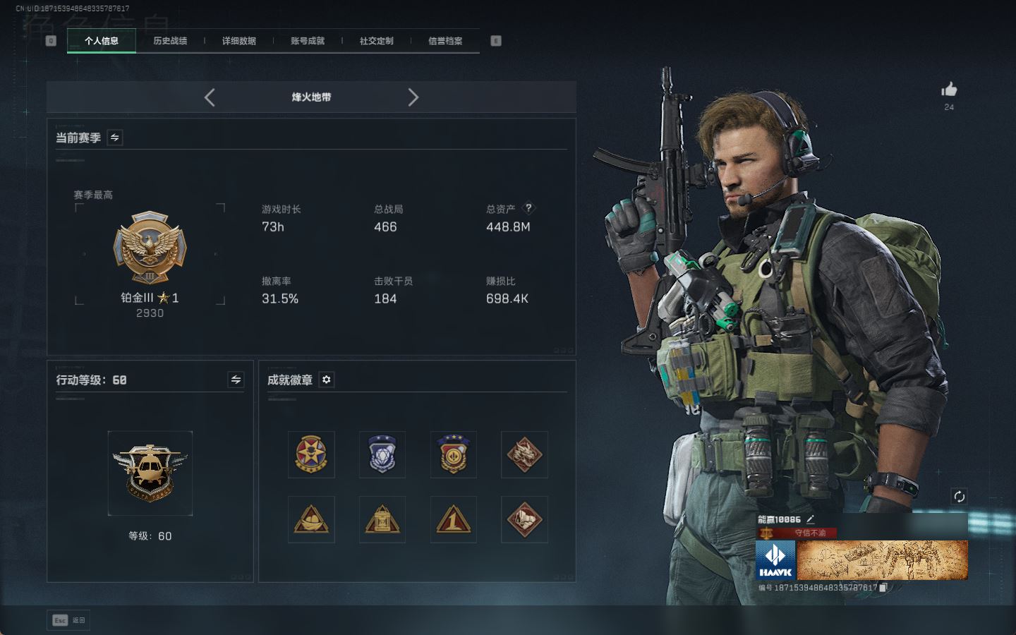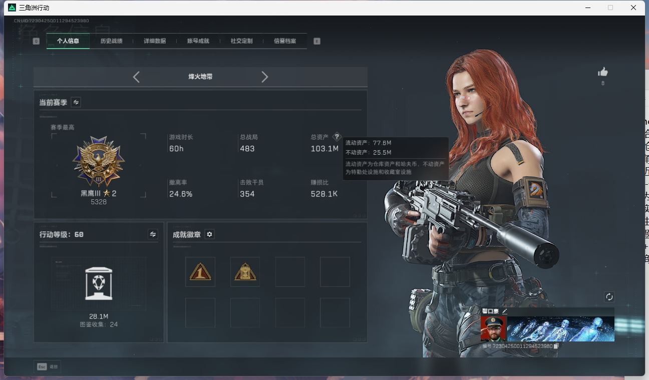 【账号佳】 ljh AK028315 包人脸 行动等级60巅峰 总资产106.9m s7赛季3*3 103发aw子弹【M250通用机枪-骑士之心ASh-12战斗步枪-鹅鸭杀QCQ171冲锋枪-鹅鸭杀0J日201轻机枪-鹅鸭杀M14射手步枪-电锯惊魂SCAR-H战斗步枪-启角G3战斗步枪-骑士 0CQ171冲锋枪-北极星联动CAR-15突击步枪-阿米娅AK-12突击步枪-特斯拉线圈UZ1冲锋枪-特斯拉线圈SR-3M紧凑突击步枪-特斯拉线圈联动 勇士冲锋枪-能天使-午夜邮差 】【角色皮肤 北极星 黑鹰】【角色皮肤 红狼-电锯惊魂 无名-夜鹰 蜂医-送葬人无题密令 深蓝-不破誓约 露娜-黑天际线 】----安全箱等时效性道具请以游戏内数据为准:详情请看图----截图展示段位不代实际段位,赛季更新等不可抗拒因素发生变化、时限道具不保证所剩时间、标题未写送三角币默认不送】【主播担保+安全至上+性价比 买号卖号只选金牌商家一左友】