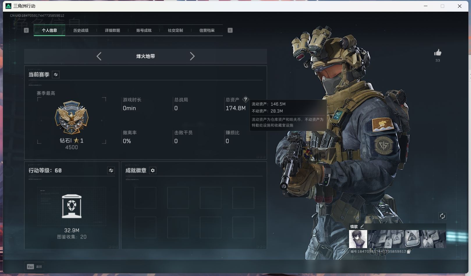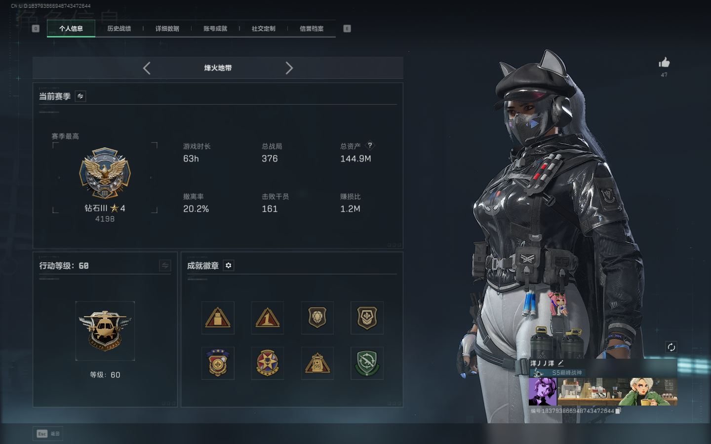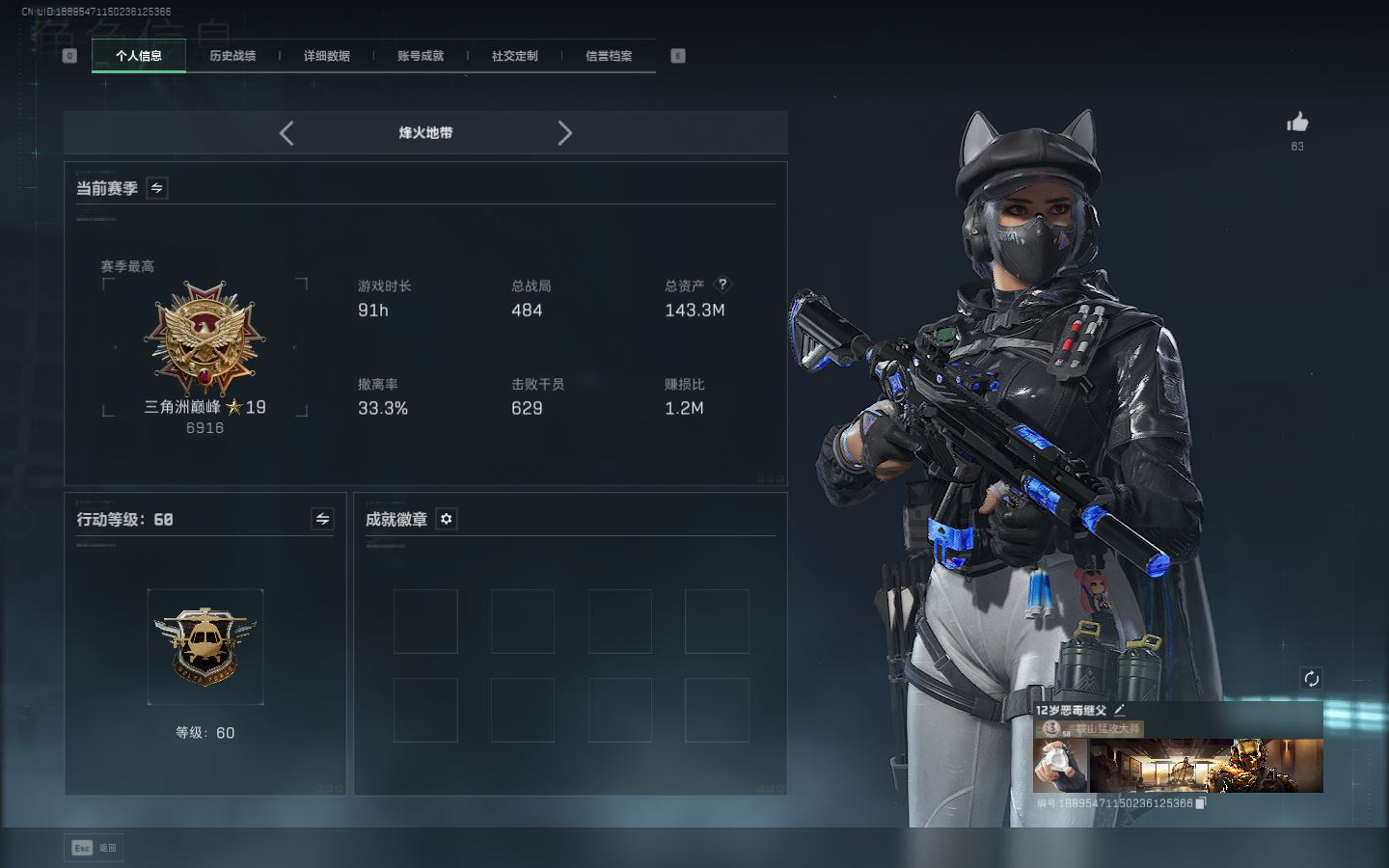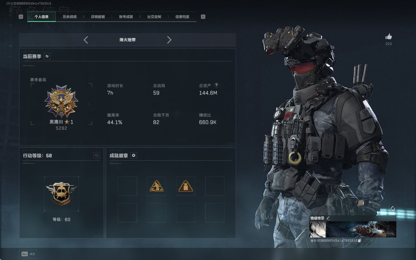 【账号佳】 ljh AK028315 包人脸 行动等级60巅峰 总资产106.9m s7赛季3*3 103发aw子弹【M250通用机枪-骑士之心ASh-12战斗步枪-鹅鸭杀QCQ171冲锋枪-鹅鸭杀0J日201轻机枪-鹅鸭杀M14射手步枪-电锯惊魂SCAR-H战斗步枪-启角G3战斗步枪-骑士 0CQ171冲锋枪-北极星联动CAR-15突击步枪-阿米娅AK-12突击步枪-特斯拉线圈UZ1冲锋枪-特斯拉线圈SR-3M紧凑突击步枪-特斯拉线圈联动 勇士冲锋枪-能天使-午夜邮差 】【角色皮肤 北极星 黑鹰】【角色皮肤 红狼-电锯惊魂 无名-夜鹰 蜂医-送葬人无题密令 深蓝-不破誓约 露娜-黑天际线 】----安全箱等时效性道具请以游戏内数据为准:详情请看图----截图展示段位不代实际段位,赛季更新等不可抗拒因素发生变化、时限道具不保证所剩时间、标题未写送三角币默认不送】【主播担保+安全至上+性价比 买号卖号只选金牌商家一左友】