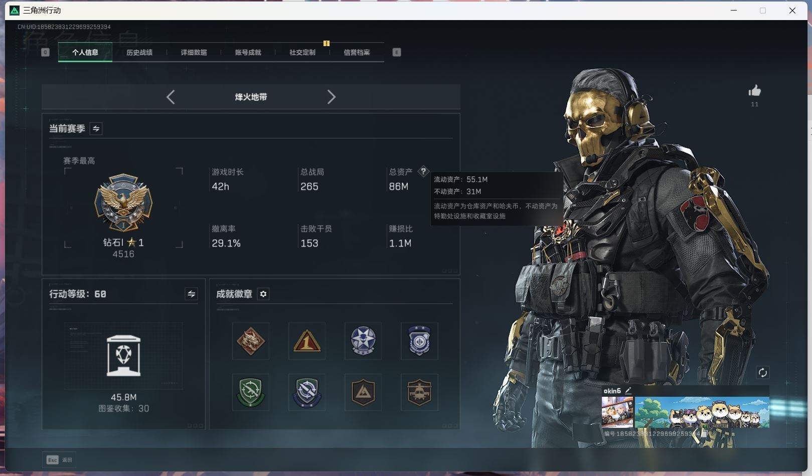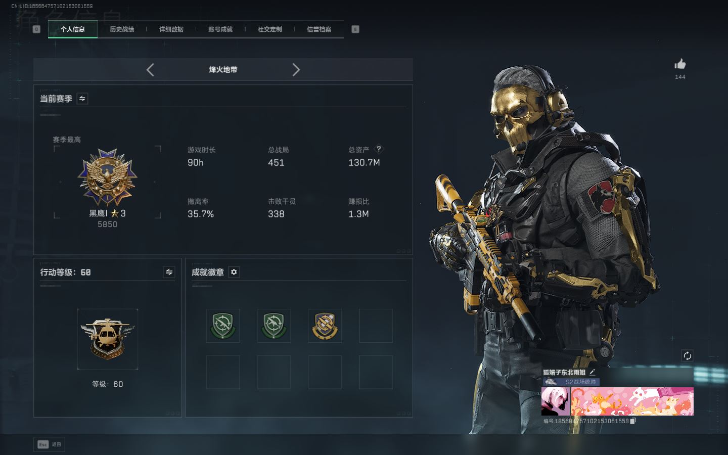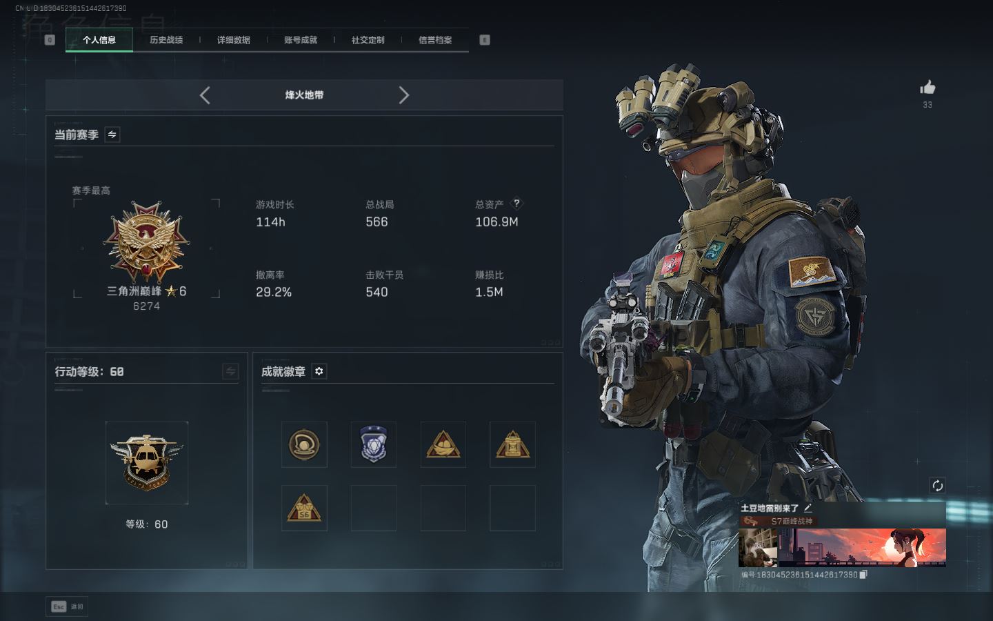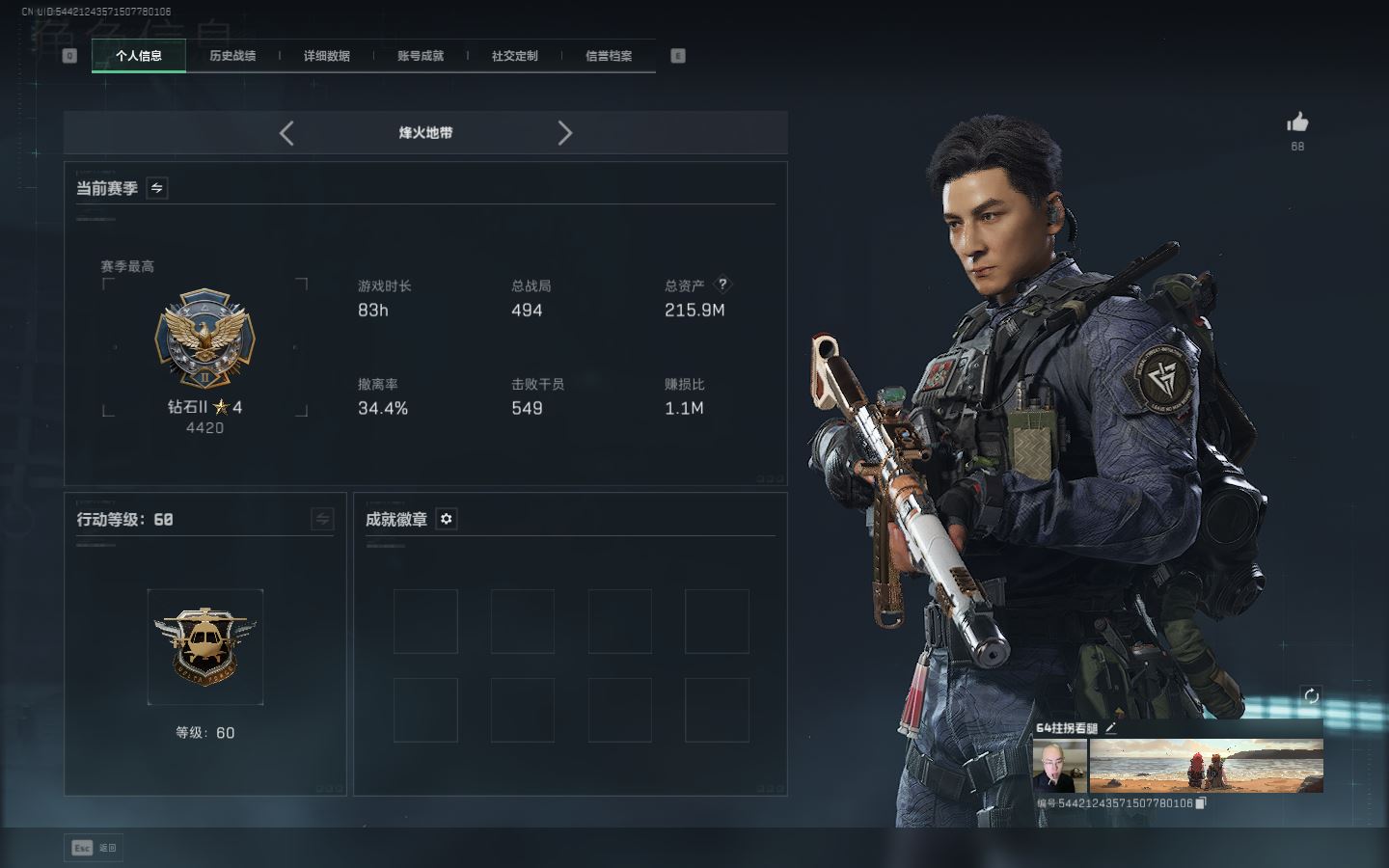 【账号佳】 ljh AK028315 包人脸 行动等级60巅峰 总资产106.9m s7赛季3*3 103发aw子弹【M250通用机枪-骑士之心ASh-12战斗步枪-鹅鸭杀QCQ171冲锋枪-鹅鸭杀0J日201轻机枪-鹅鸭杀M14射手步枪-电锯惊魂SCAR-H战斗步枪-启角G3战斗步枪-骑士 0CQ171冲锋枪-北极星联动CAR-15突击步枪-阿米娅AK-12突击步枪-特斯拉线圈UZ1冲锋枪-特斯拉线圈SR-3M紧凑突击步枪-特斯拉线圈联动 勇士冲锋枪-能天使-午夜邮差 】【角色皮肤 北极星 黑鹰】【角色皮肤 红狼-电锯惊魂 无名-夜鹰 蜂医-送葬人无题密令 深蓝-不破誓约 露娜-黑天际线 】----安全箱等时效性道具请以游戏内数据为准:详情请看图----截图展示段位不代实际段位,赛季更新等不可抗拒因素发生变化、时限道具不保证所剩时间、标题未写送三角币默认不送】【主播担保+安全至上+性价比 买号卖号只选金牌商家一左友】