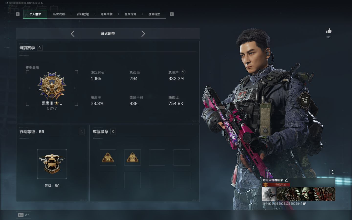 【账号佳】 ljh AK028106 包人脸 行动等级60黑鹰 总资产250.4m 满体 s7赛季3*3【KC17突击步枪-电锯惊魂ASh-12战斗步枪-鹅鸭杀0C0171冲锋枪-鹅鸭杀0JB201轻机枪-鹅鸭杀联动 M4A1突击步枪-阿米娅M250通用机枪-骑士之心 SR-9射手步枪-几何解构SCAR-H战斗步枪-启航联动Vector冲锋枪-能天使联动R93狙击步枪-维什戴尔腾龙突击步枪-捞点薯条AWM狙击步枪-捞点薯条 】【近战 北极星 黑鹰】【角色皮肤 红狼-蚀金玫瑰 红狼-电锯惊魂 威龙-壮志凌云 无名-夜鹰 蜂医-送葬人无题密令 深蓝-不破誓约 骇爪-维什戴尔 】 ----更多炫彩背包/光效/名片/武器具体看图!截图展示段位不代实际段位,赛季更新等不可抗拒因素发生变化、时限道具不保证所剩时间、标题未写送点卷默认不送】【主播担保+安全至上+性价比 买号卖号只选金牌商家一左友】