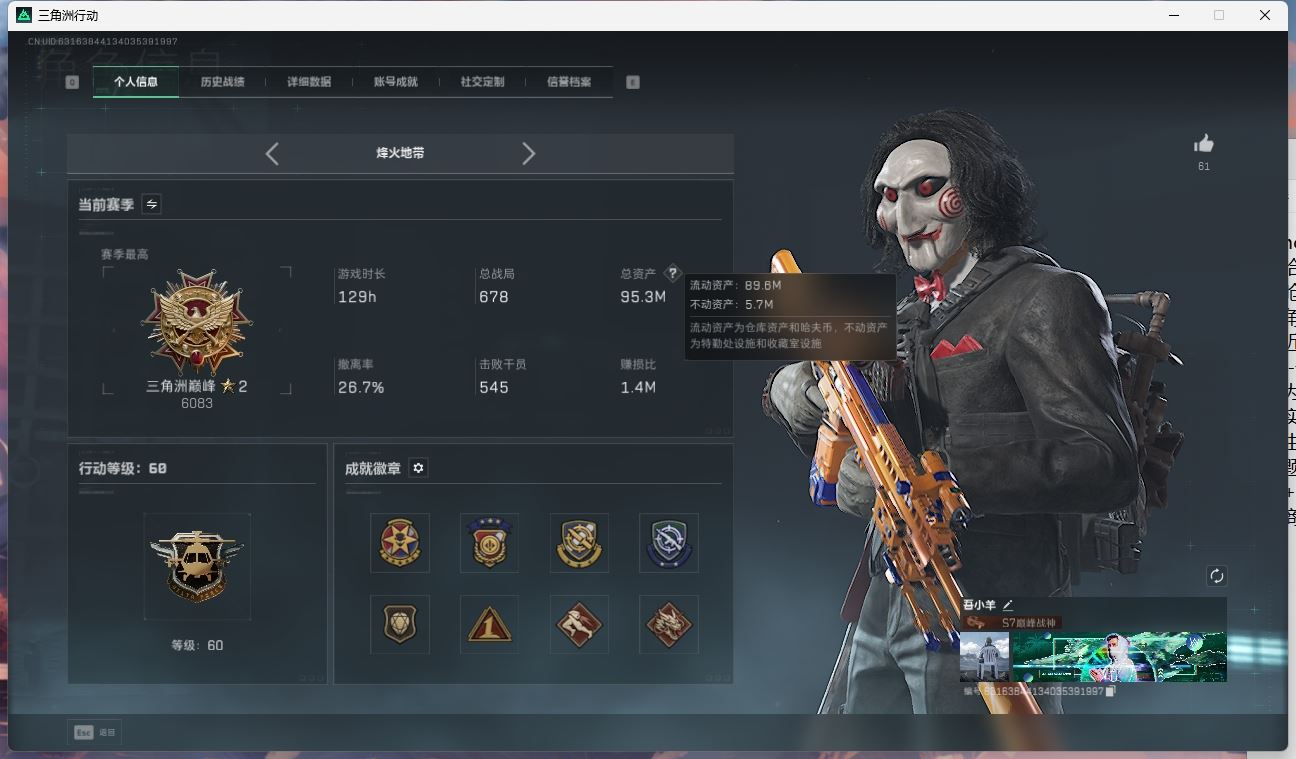【账号佳】 ljh AK028320 有二次 行动等级60巅峰 总资产143.3m满体满仓【KC17突击步枪-电锯惊魂SCAR-H战斗步枪-水墨云图G3战斗步枪-骑士联动R93狙击步抢-维什戴尔ASh-12战斗步枪-鹅鸭杀0C0171冲锋枪-鹅鸭杀 M250通用机枪-骑士之心M4A1突击步枪-蚀金玫瑰AK-12突击步枪-特斯拉线圈UZ1冲锋枪-特斯拉线圈SR-3M紧凑突击步枪-特斯拉线圈 】【近战 北极星 黑鹰】【角色皮肤 红狼-蚀金玫瑰 红狼-电锯惊魂 蜂医-送葬人无题密令 深蓝-不破誓约 骇爪-维什戴尔 骇爪-水墨云图 】----安全箱等时效性道具请以游戏内数据为准:详情请看图----截图展示段位不代实际段位,赛季更新等不可抗拒因素发生变化、时限道具不保证所剩时间、标题未写送三角币默认不送】【主播担保+安全至上+性价比 买号卖号只选金牌商家一左友】