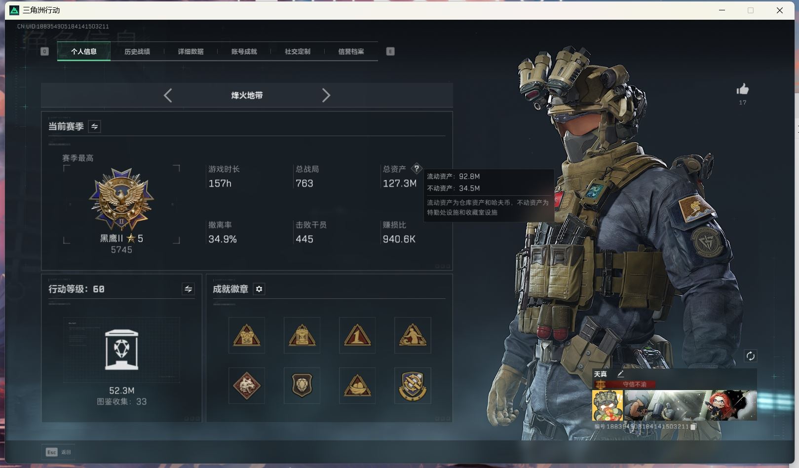【账号佳】 hmc AK028452 行动等级:60黑鹰,总资产127m哈夫币 【75aw子弹 s7赛季33 】【呛皮:SG552突击步枪-运动员KC17突击步枪-电锯惊魂G3战斗步枪-骑士ASh-12战斗步枪-鹅鸭杀QCQ171冲锋枪-鹅鸭杀0JB201轻机枪-鹅鸭杀联动 CAR-15突击步枪-阿米娅 联动R93狙击步枪-维什戴尔SCAR-H战斗步枪-启航联动 M4A1突击步枪-阿米娅】 【角色皮肤:骇爪-维什戴尔 红狼-电锯惊魂 深蓝-不破誓约 】【近战:黑鹰】----安全箱等时效性道具请以游戏内数据为准:详情请看图----截图展示段位不代实际段位,赛季更新等不可抗拒因素发生变化、时限道具不保证所剩时间、标题未写送三角券默认不送】【主播担保+安全至上+性价比 买号卖号只选金牌商家一左友】