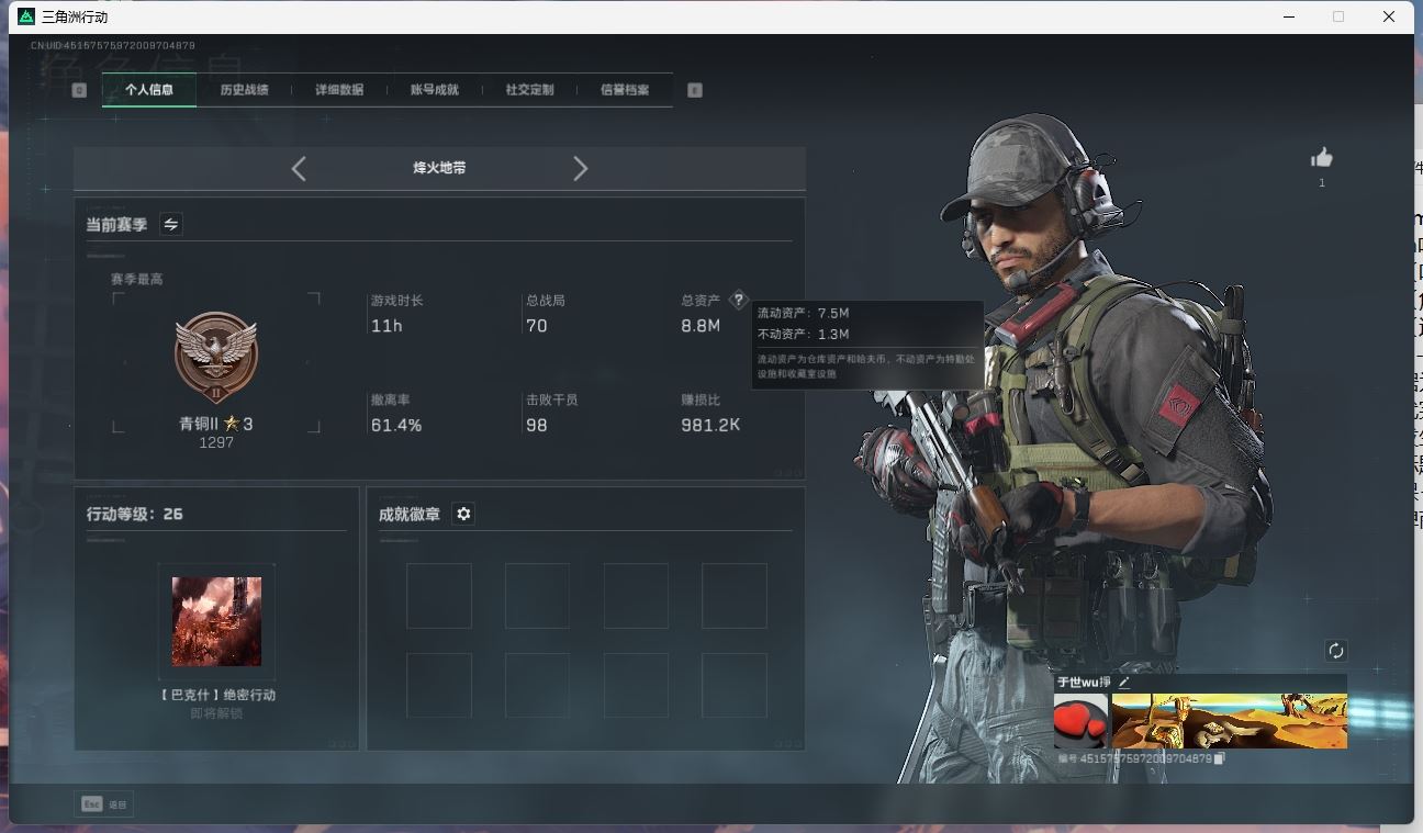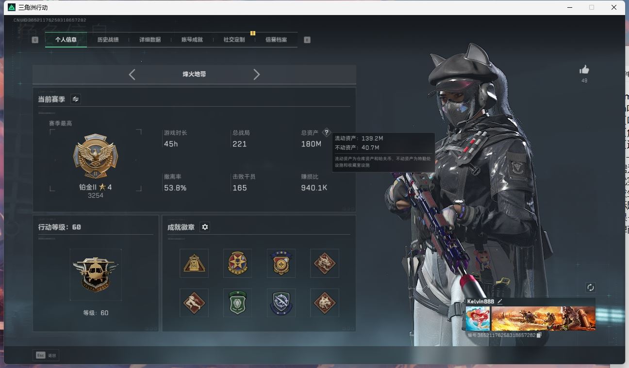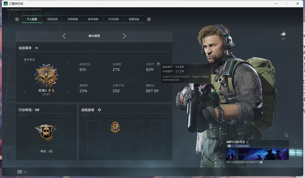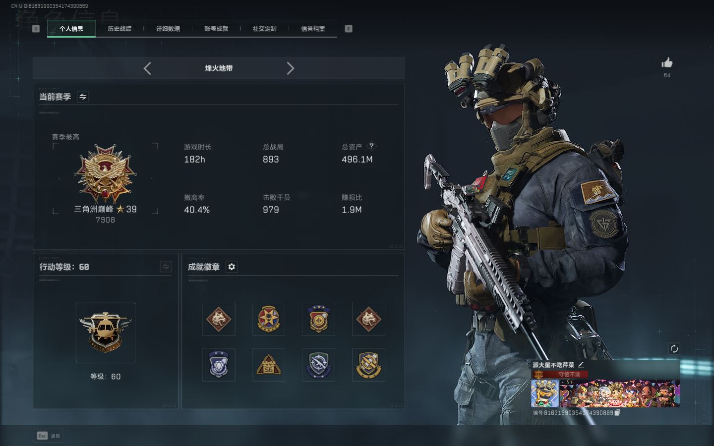 【账号佳】 ljh AK026079 包人脸 行动等级60巅峰 总资产496.1m 仓库满级 潜水差一级满级【3*3保险】【毁灭之源】【ASh-12战斗步枪-鹅鸭杀QCQ171冲锋枪-鹅鸭养QJB201轻机枪-期鸭杀SCAR-H战斗步枪-启航M250通用机枪-骑士之心联动 M4A1突击步枪-阿米娅K416突击步枪-StoryBoard腾龙突击步枪-捞点薯条 腾龙突击步枪-捞点薯条AWM狙击步枪-捞点薯条93R-捞点薯条K437突击步枪-北极星0C0171冲锋枪-北极星联动 勇士冲锋枪-能天使-午夜邮差联动 复合弓-黑-天际线 K416突击步枪-幻想曲G3战斗步枪-幻想曲S12K疲弹枪-幻想曲K437突击步枪-猩红乐队AK-12突击步枪-夜鹰SCAR-H战斗步枪-铁艺燕穹K437突击步枪-守护者】【近战 北极星 黑鹰】【角色皮肤 威龙-壮志凌云 无名-夜鹰 深蓝-不破誓约 露娜-黑天际线】----安全箱等时效性道具请以游戏内数据为准:详情请看图----截图展示段位不代实际段位,赛季更新等不可抗拒因素发生变化、时限道具不保证所剩时间、标题未写送三角币默认不送】【主播担保+安全至上+性价比 买号卖号只选金牌商家一左友】