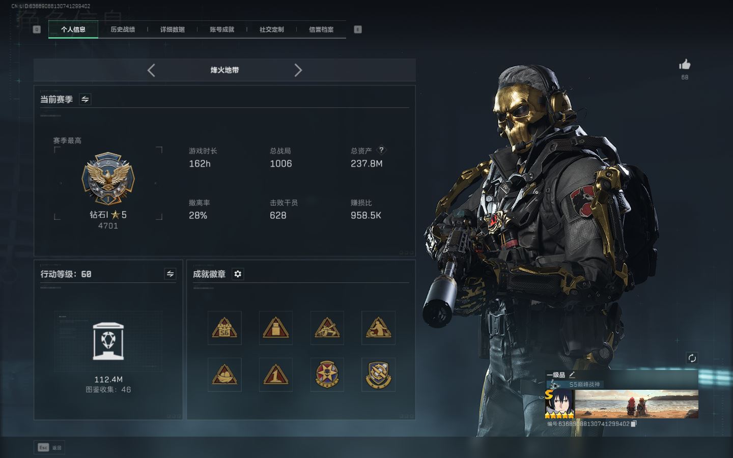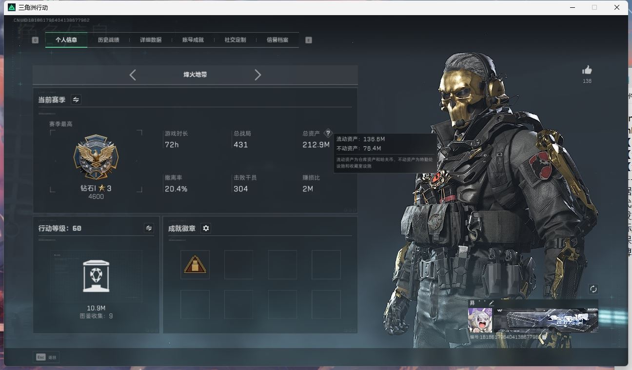 【账号佳】 ljh AK026079 包人脸 行动等级60巅峰 总资产496.1m 仓库满级 潜水差一级满级【3*3保险】【毁灭之源】【ASh-12战斗步枪-鹅鸭杀QCQ171冲锋枪-鹅鸭养QJB201轻机枪-期鸭杀SCAR-H战斗步枪-启航M250通用机枪-骑士之心联动 M4A1突击步枪-阿米娅K416突击步枪-StoryBoard腾龙突击步枪-捞点薯条 腾龙突击步枪-捞点薯条AWM狙击步枪-捞点薯条93R-捞点薯条K437突击步枪-北极星0C0171冲锋枪-北极星联动 勇士冲锋枪-能天使-午夜邮差联动 复合弓-黑-天际线 K416突击步枪-幻想曲G3战斗步枪-幻想曲S12K疲弹枪-幻想曲K437突击步枪-猩红乐队AK-12突击步枪-夜鹰SCAR-H战斗步枪-铁艺燕穹K437突击步枪-守护者】【近战 北极星 黑鹰】【角色皮肤 威龙-壮志凌云 无名-夜鹰 深蓝-不破誓约 露娜-黑天际线】----安全箱等时效性道具请以游戏内数据为准:详情请看图----截图展示段位不代实际段位,赛季更新等不可抗拒因素发生变化、时限道具不保证所剩时间、标题未写送三角币默认不送】【主播担保+安全至上+性价比 买号卖号只选金牌商家一左友】