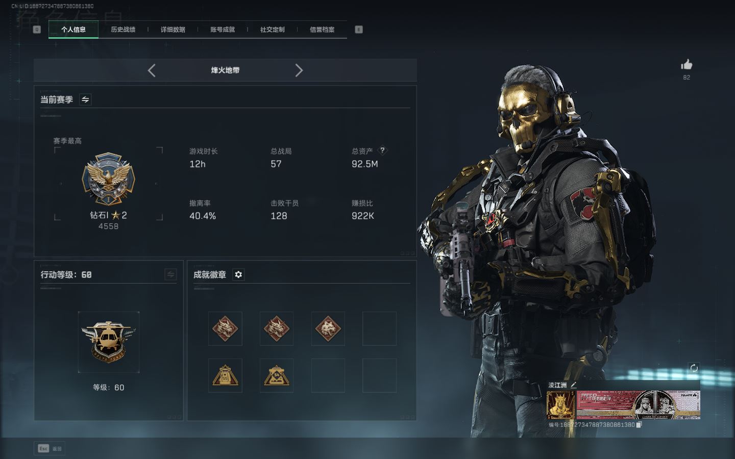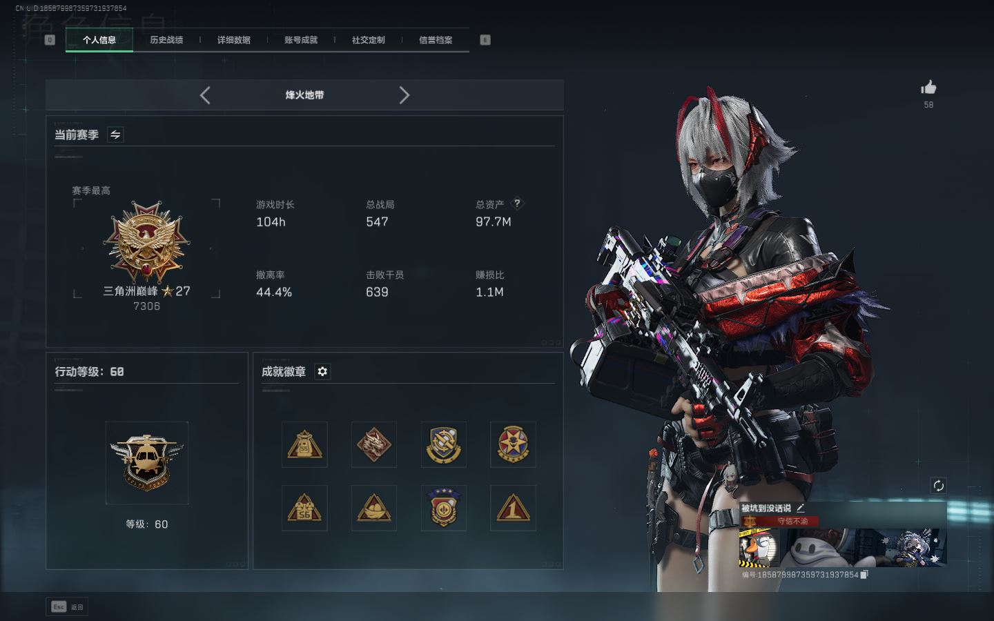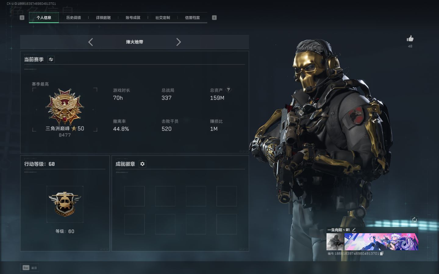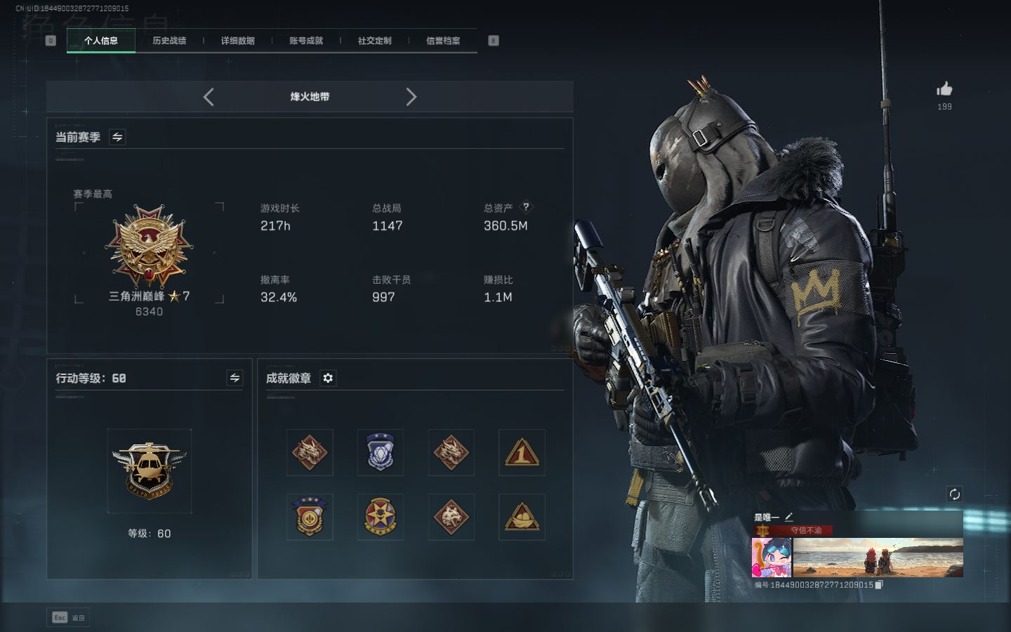 【账号佳】 ljh AK026213 有二次 行动等级60巅峰 总资产360.5m 满体【M250通用机枪-骑士之心M250通用机枪-几何解构SCAR-H战斗步枪-启航M16A4突击步枪-狩猎时刻G3战斗步枪-狩猎时刻Vector冲锋枪-狩猎时刻,联动 M4A1突击步枪-阿米娅联动 勇士冲锋枪-能天使-午夜邮差 腾龙突击步枪-捞点薯条AWM狙击步枪-捞点薯条93R-捞点薯条联动 725双管弹枪-送葬人-无题密令联动 复合弓-黑-天际线AUG突击步枪-游乐场SMG-45冲锋枪-骑士 】【近战 北极星 黑鹰】【角色皮肤 红狼-电锯惊魂 威龙-壮志凌云 无名-夜鹰 蜂医-无题密令 牧羊人-街头之王 深蓝-不破誓约 】----安全箱等时效性道具请以游戏内数据为准:详情请看图----截图展示段位不代实际段位,赛季更新等不可抗拒因素发生变化、时限道具不保证所剩时间、标题未写送三角币默认不送】【主播担保+安全至上+性价比 买号卖号只选金牌商家一左友】
