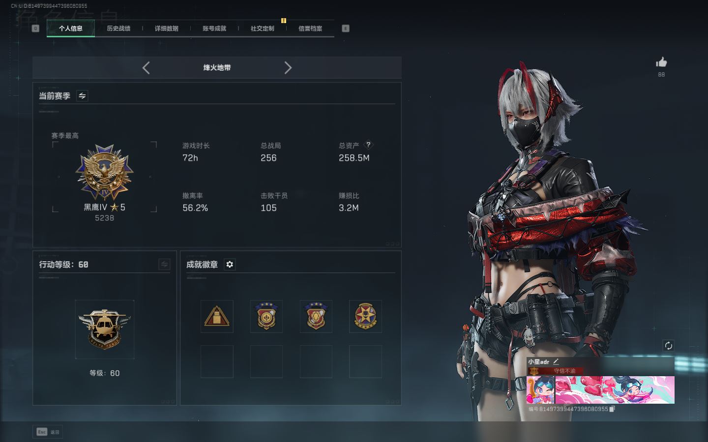 【账号佳】 ljh AK026063 包人脸 行动等级60黑鹰 总资产258.5m 特勤处满级【典藏K416突击步枪-命运 极品c 渐变 毁灭之源2s】【ASh-12战斗步枪-鹅鸭杀QCQ171冲锋枪-鹅鸭杀0JB201轻机枪-鹅鸭杀M250通用机枪-骑士联动 R93狙击步枪-维什戴尔SCAR-H战斗步枪-启航AK-12突击步枪-特斯拉线圈UZI冲锋枪-特斯拉线圈 SR-3M紧凑突击步枪-特斯拉线园联动 勇士冲锋枪-能天使-午夜邮差腾龙突击步枪-捞点薯条AWM狙击步枪-捞点薯条93R-捞点薯条联动 复合弓-黑-天际线G18-飞虎】【近战 北极星 黑海 黑鹰】【近战皮肤 威龙-壮志凌云 威龙-飞虎 无名-夜鹰 蜂医-无题密令 露娜-黑天际线 骇爪-维什戴尔 】----安全箱等时效性道具请以游戏内数据为准:详情请看图----截图展示段位不代实际段位,赛季更新等不可抗拒因素发生变化、时限道具不保证所剩时间、标题未写送三角币默认不送】【主播担保+安全至上+性价比 买号卖号只选金牌商家一左友】