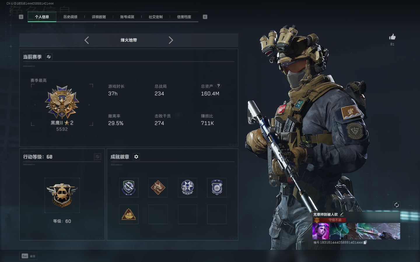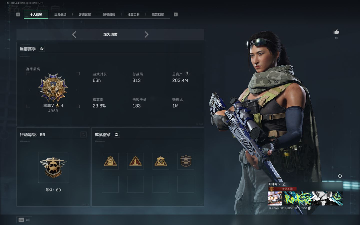 【账号佳】 ljh AK026228 包人脸 行动等级60黑鹰 总资产203.4m【G3战斗步枪-骑士联动 M4A1突击步枪-阿米娅M250通用机枪-骑士SCAR-H战斗步枪-启航K437突击步枪-北极星0CQ171冲锋枪-北极星联动 复合弓-黑-天际线 联动 CAR-15突击步枪-阿米娅联动 725双管弹枪-送葬人-无题密令M4A1突击步枪-蚀金玫瑰AK-12突击步枪-夜唐SCAR-H战斗步枪-铁艺签穹AS Val突击步枪-蛇年祥瑞SR-25射手步枪-水墨云图 】【近战 北极星 黑鹰】【角色皮肤 红狼-蚀金玫瑰 威龙-壮志凌云 无名-夜鹰 露娜-黑天际线】----安全箱等时效性道具请以游戏内数据为准:详情请看图----截图展示段位不代实际段位,赛季更新等不可抗拒因素发生变化、时限道具不保证所剩时间、标题未写送三角币默认不送】【主播担保+安全至上+性价比 买号卖号只选金牌商家一左友】