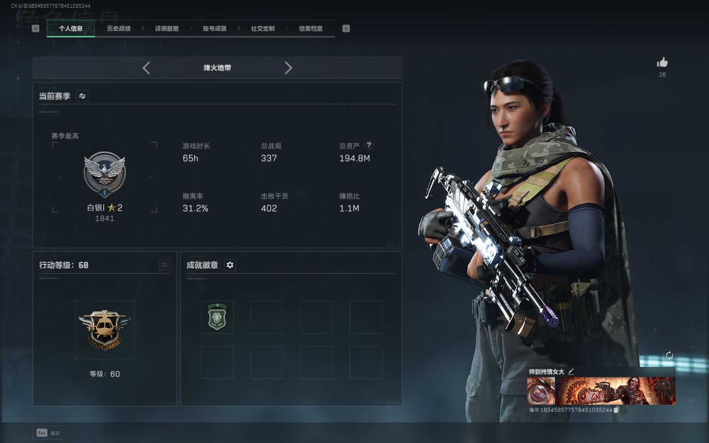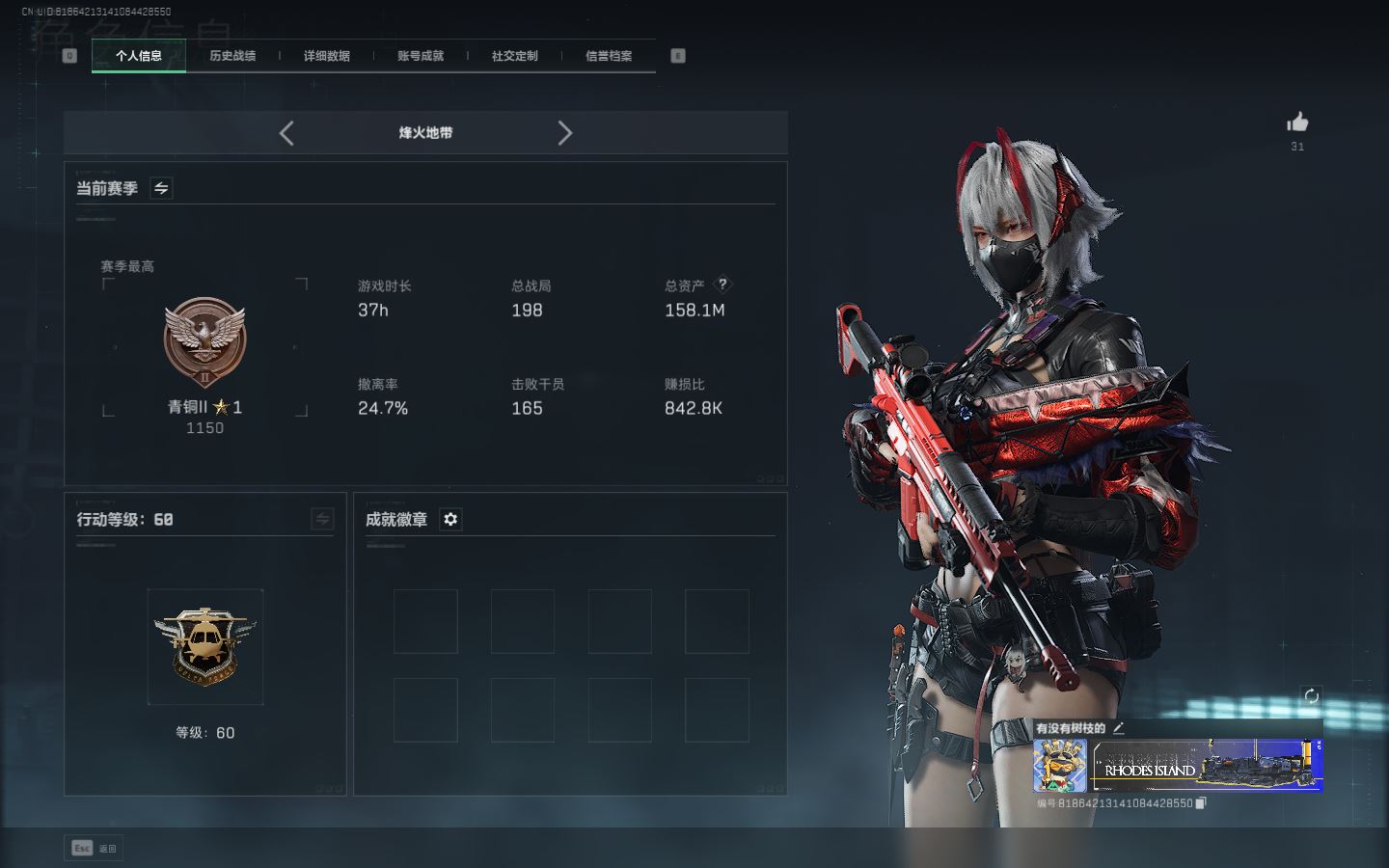 【账号佳】 ljh AK026158 包人脸 行动等级60白银 总资产194.8m【S12K藏弹枪-电锯惊魂M14射手步枪-电锯惊魂ASh-12战斗步枪-鹅鸭杀QCQ171冲锋枪-鹅鸭杀0J日201轻机枪-鹅鸭杀SCAR-H战斗步枪-启航M250通用机枪-骑士之心M16A4突击步枪-狩猎时刻 G3战斗步枪-狩猎时刻Vector冲锋枪-狩猎时刻.联动 M4A1突击步枪-阿米娅腾龙突击步枪-捞点薯AWM狙击步枪-捞点薯条93R-捞点薯条 】【近战 电锯 黑鹰】【角色皮肤 蜂医-送葬人无题密令 深蓝-不破誓约】----安全箱等时效性道具请以游戏内数据为准:详情请看图----截图展示段位不代实际段位,赛季更新等不可抗拒因素发生变化、时限道具不保证所剩时间、标题未写送三角币默认不送】【主播担保+安全至上+性价比 买号卖号只选金牌商家一左友】