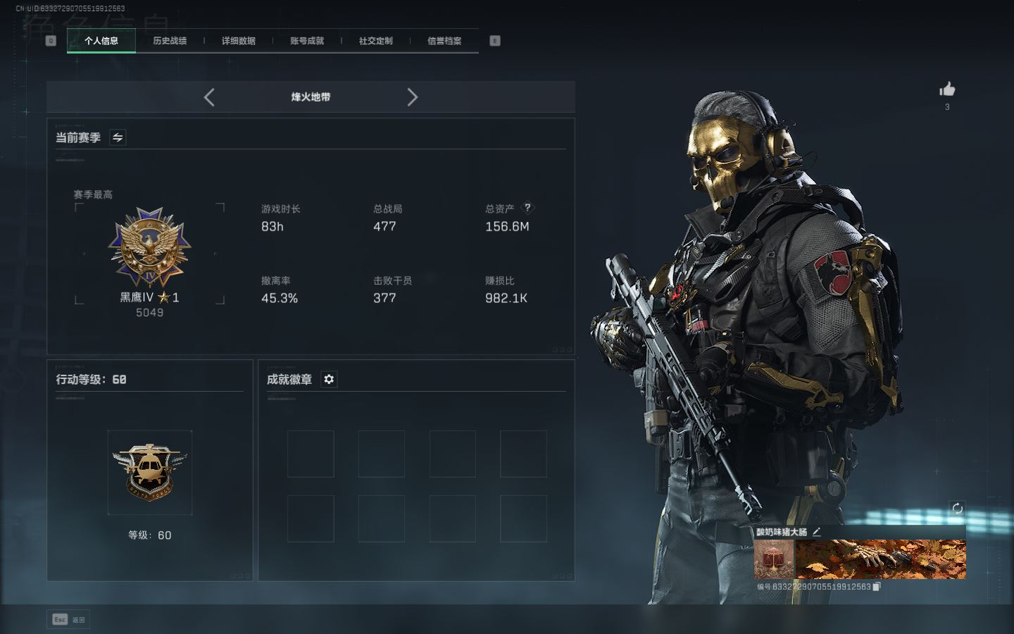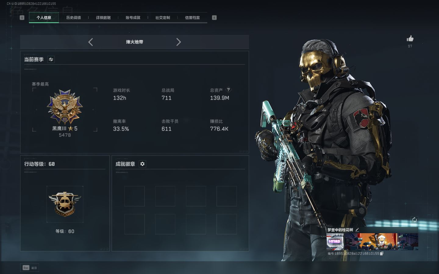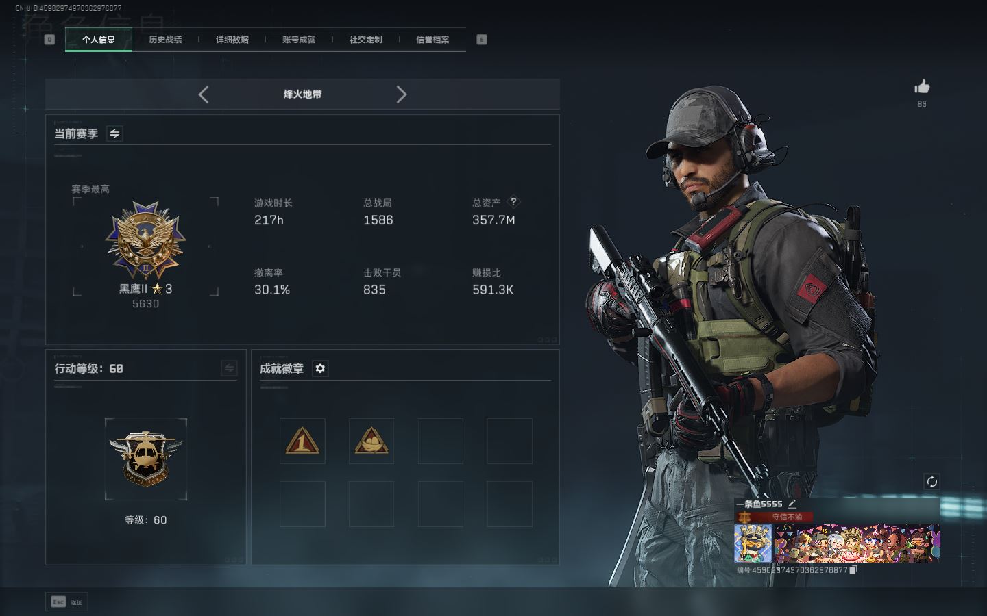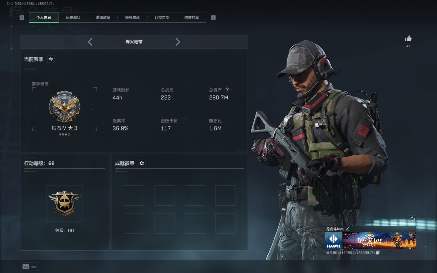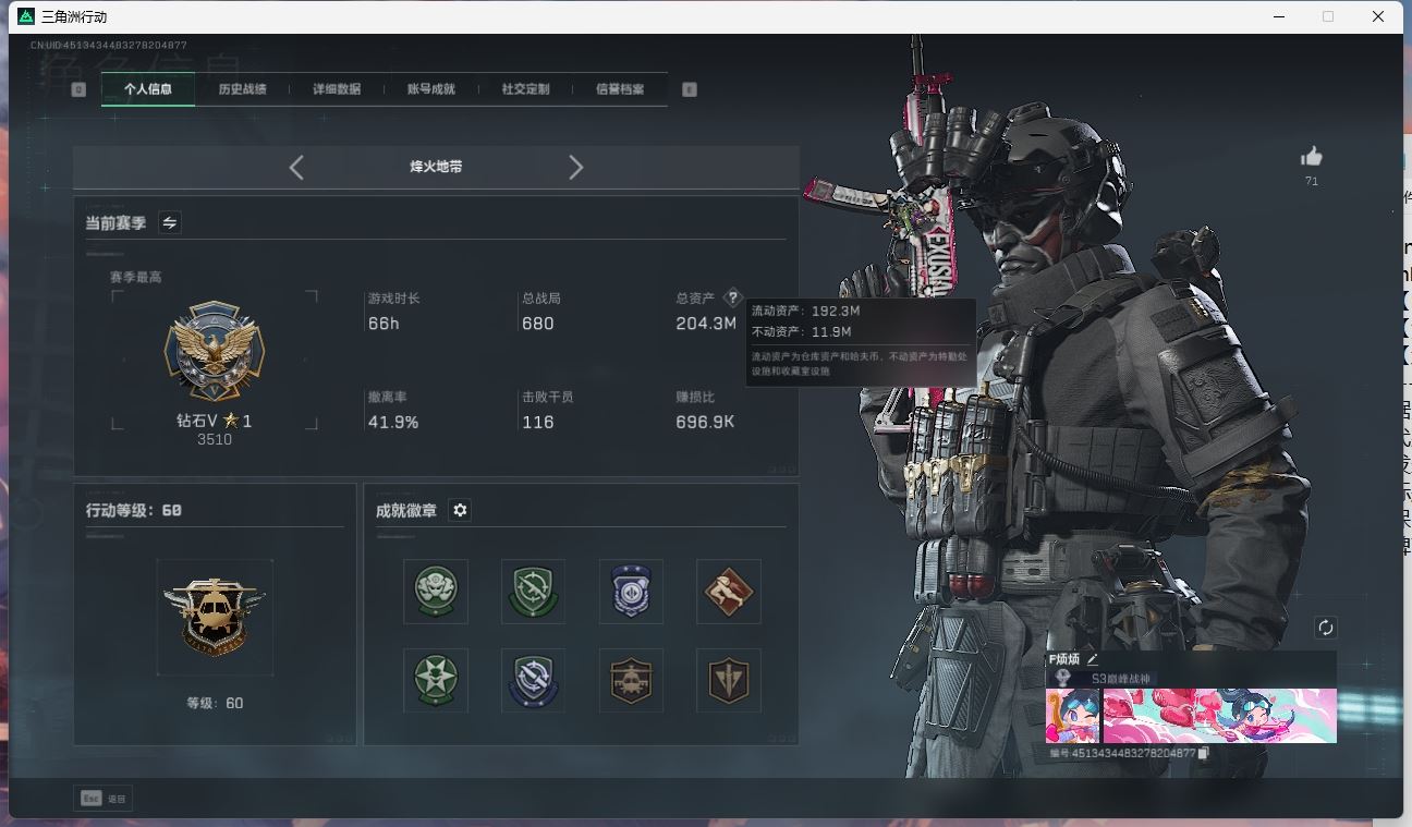 【账号佳】 hmc AK026692 行动等级:60,总资产204.3m哈夫币 【呛皮:ASh-12战斗步枪-鹅鸥杀0CQ171冲锋枪-鹅鸭杀0JB201轻机枪-鹅鸭杀M250通用机枪-骑士之SCAR-H战斗步枪-启航联动 M4A1突击步枪-阿米娅腾龙突击步枪-捞点警条 AWM狙击步枪-捞点薯条93R-捞点警条联动 勇士冲锋枪-能天使-午夜邮差联动复合弓-黑-天际线G18-飞虎SMG-45冲锋枪-骑士 AK-12突击步枪-夜鹰MP5冲锋抢-黑海QJB201轻机枪-黑海SCAR-H战斗步枪-铁艺苍穹AWM狙击步枪-影锋SR-25射手步枪-水墨 M1014假弹枪-影锋M700狙击步枪-零度协议AKM突击步枪-零度协M7战斗步枪-维京M7战斗步枪-怜悯P90冲锋枪:神秘艺 AKM突击步枪-赤枭M700狙击步枪-尖峰行动SG552突击步枪-白鹰军团0BZ95-1突击步枪-破军】【角色皮肤:威龙-铁面判官 无名-夜鹰 牧羊人-街头之王 深蓝-不破誓约 】【近战:近战-黑海 近战-影锋 黑鹰 】----安全箱等时效性道具请以游戏内数据为准:详情请看图----截图展示段位不代实际段位,赛季更新等不可抗拒因素发生变化、时限道具不保证所剩时间、标题未写送三角币默认不送】【主播担保+安全至上+性价比 买号卖号只选金牌商家一左友】