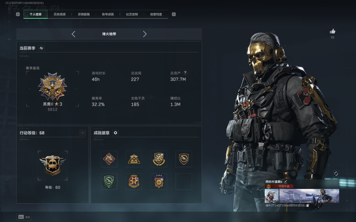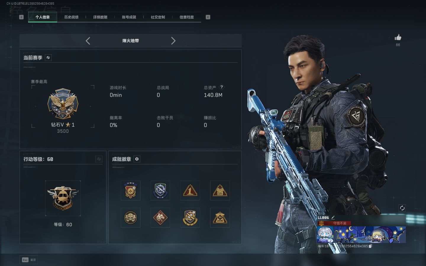 【账号佳】 ljh AK026785 包人脸 行动等级60铂金 总资产43.9m【典藏 M7战斗步枪-棱镜攻势S2极品b 毁灭之源4s】【KC17突击步枪-电锯惊魂联动CAR-15突击步枪-阿米娅G3战斗步枪-骑士M250通用机枪-骑士之心9 3R-捞点薯条联动 M4A1突击步枪-阿米娅AK-12突击步枪-特斯拉线圈UZ1冲锋枪-特斯拉线圈SR-3M紧凑突击步枪-特斯拉线圈联动 勇士冲锋枪-能天使-午夜邮差联动 复合弓-黑-天际线 】【近战 影锋 黑鹰】【角色皮肤 红狼-蚀金玫瑰 威龙-壮志凌云 无名-夜鹰 蜂医-送葬人无题密令 深蓝-不破誓约 露娜-黑天际线 】----安全箱等时效性道具请以游戏内数据为准:详情请看图截图展示段位不代实际段位,赛季更新等不可抗拒因素发生变化、时限道具不保证所剩时间、标题未写送三角币默认不送】【主播担保+安全至上+性价比 买号卖号只选金牌商家一左友】