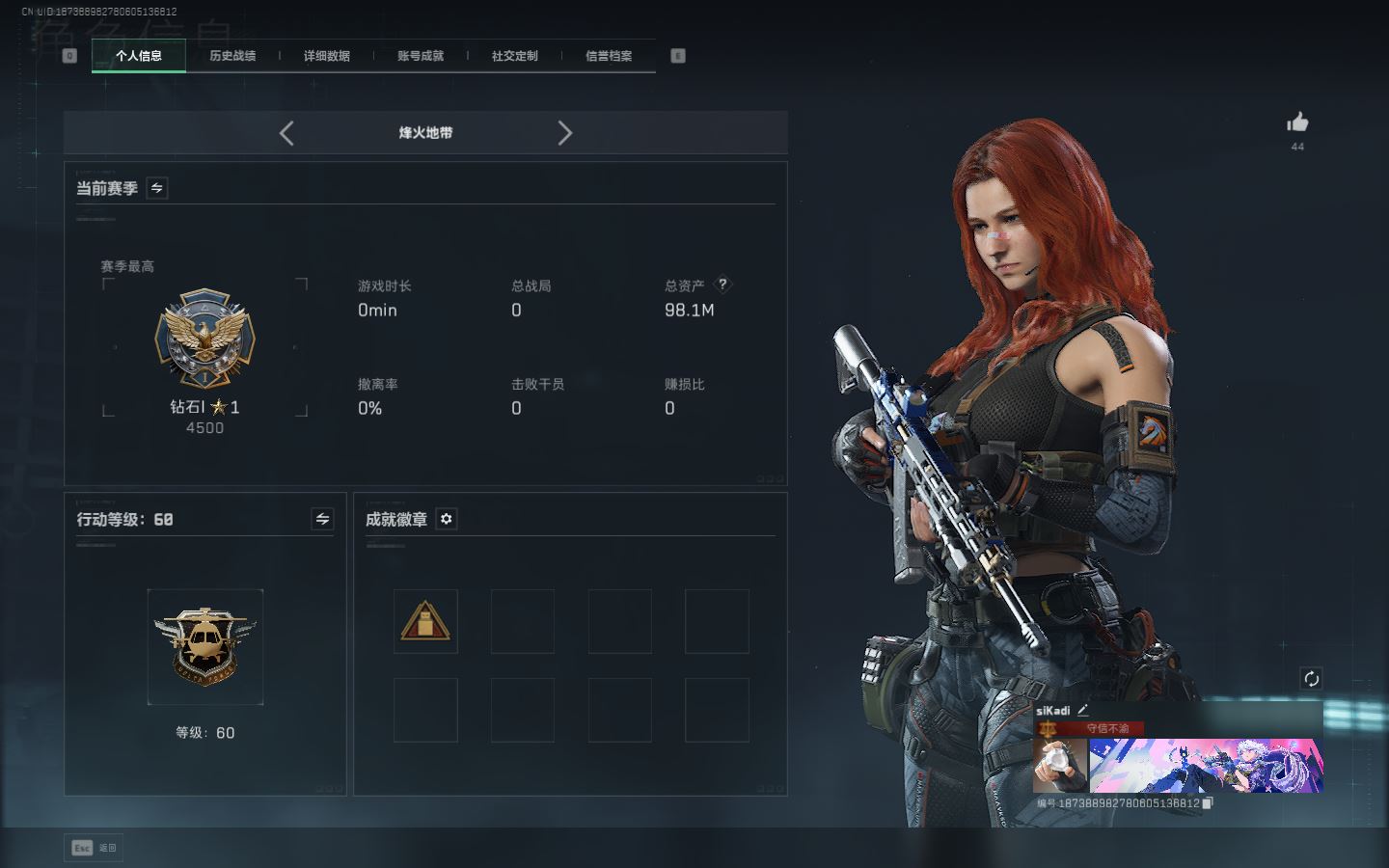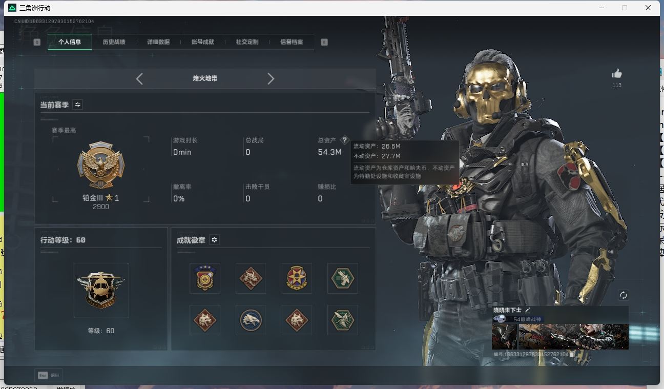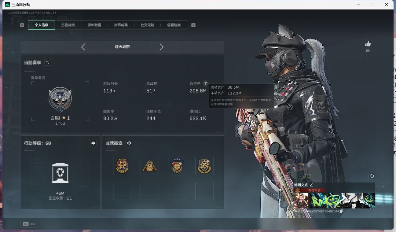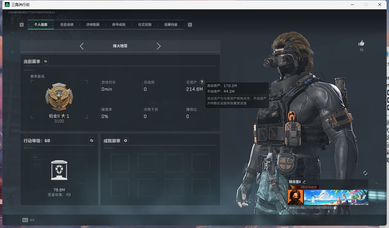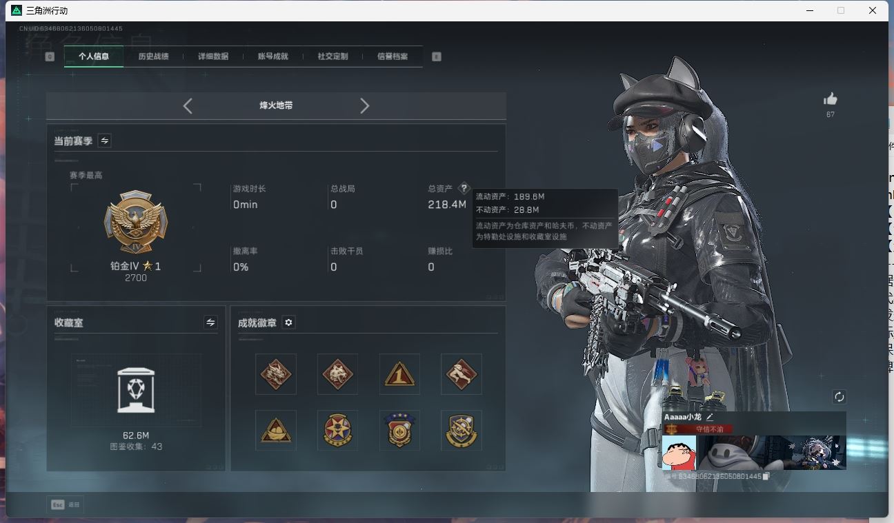 【账号佳】 ljh AK027045 包人脸 行动等级49铂金 总资产85.7m 三千三角币【KC17突击步枪-电锯惊魂SCAR-H战斗步枪-启航联动 M4A1突击步枪-阿米娅腾龙突击步枪-捞点薯条AWM狙击步枪-捞点薯条93R-捞点薯条联动 Vector冲锋枪-能天使 】【近战 北极星 黑鹰】----【安全箱等时效性道具请以游戏内数据为准:详情请看图截图展示段位不代实际段位,赛季更新等不可抗拒因素发生变化、时限道具不保证所剩时间、标题未写送三角币默认不送】【主播担保+安全至上+性价比 买号卖号只选金牌商家一左友】