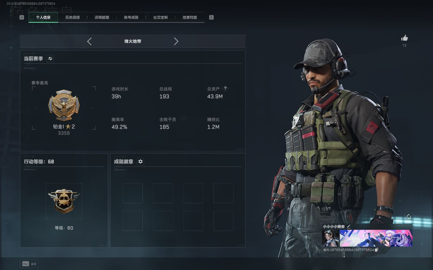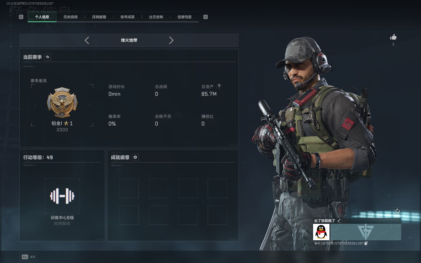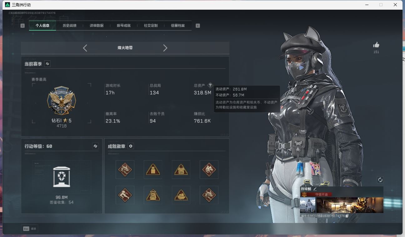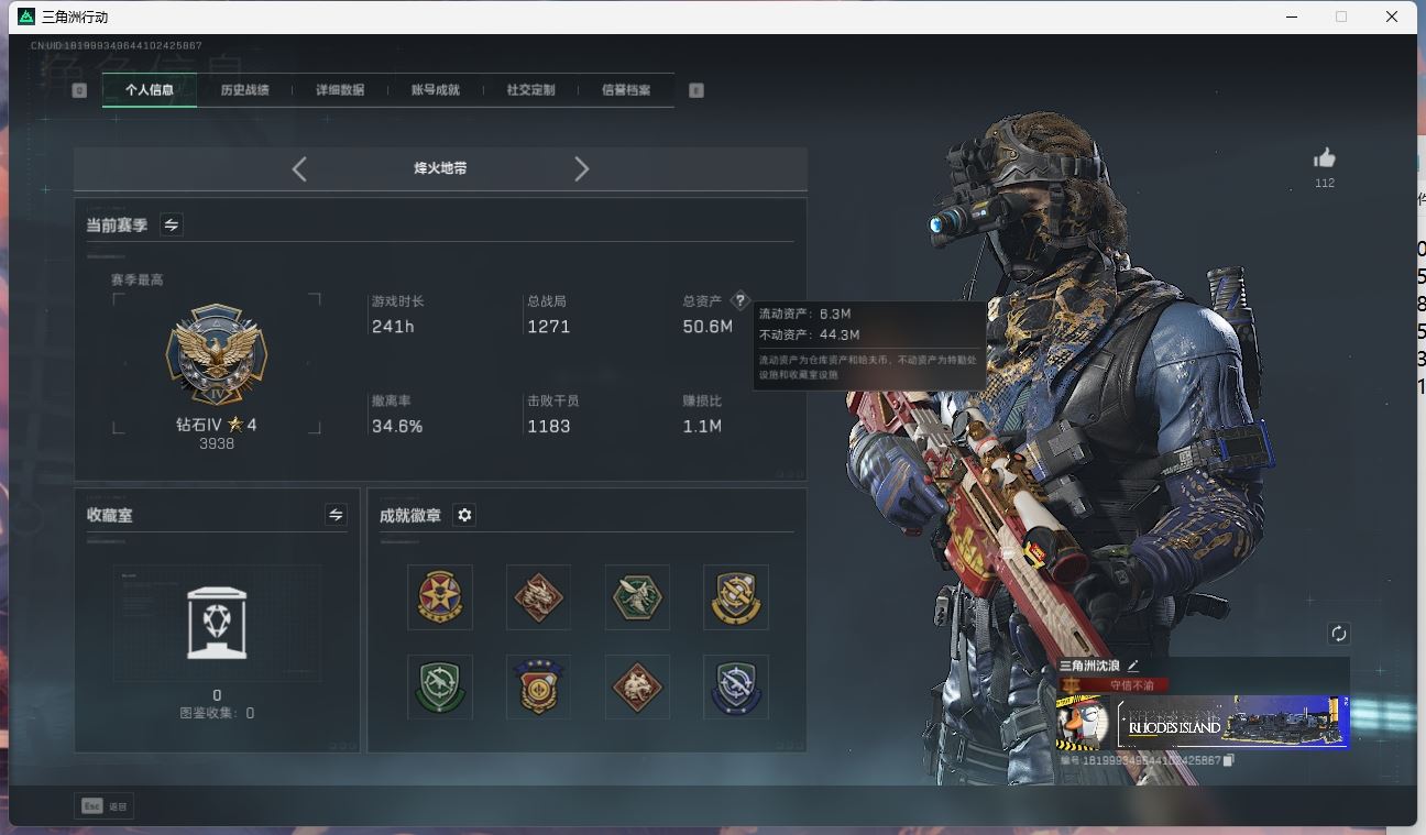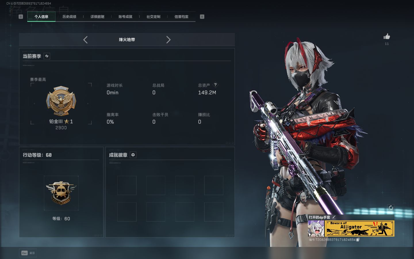 【账号佳】 ljh AK027045 包人脸 行动等级49铂金 总资产85.7m 三千三角币【KC17突击步枪-电锯惊魂SCAR-H战斗步枪-启航联动 M4A1突击步枪-阿米娅腾龙突击步枪-捞点薯条AWM狙击步枪-捞点薯条93R-捞点薯条联动 Vector冲锋枪-能天使 】【近战 北极星 黑鹰】----【安全箱等时效性道具请以游戏内数据为准:详情请看图截图展示段位不代实际段位,赛季更新等不可抗拒因素发生变化、时限道具不保证所剩时间、标题未写送三角币默认不送】【主播担保+安全至上+性价比 买号卖号只选金牌商家一左友】