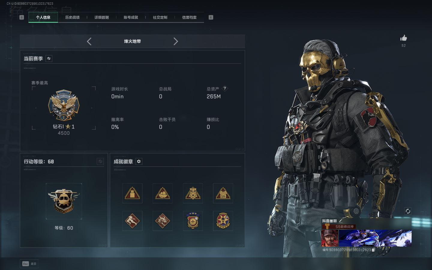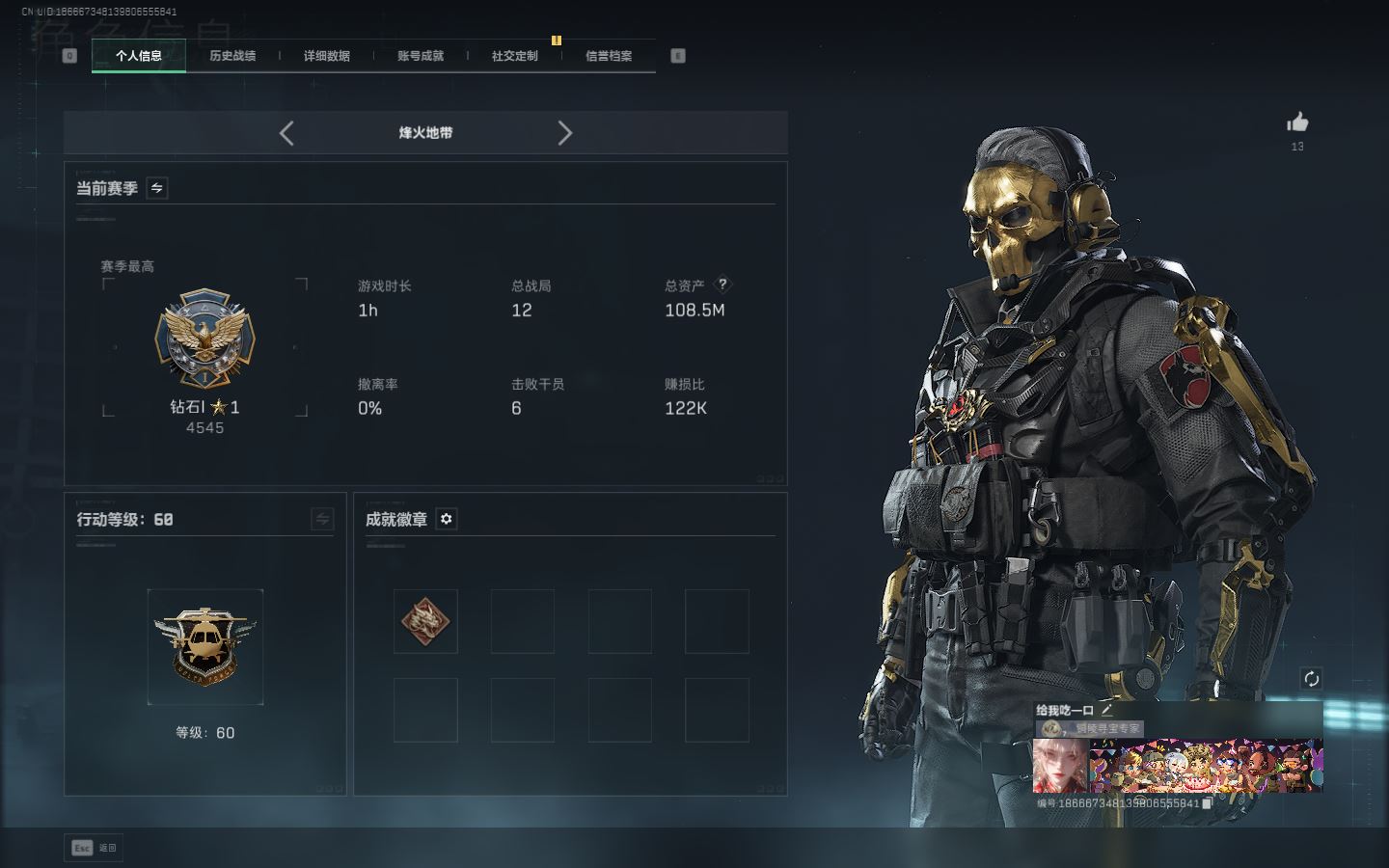 【账号佳】 ljh AK026979 包人脸 行动等级60钻石 总资产108.5m 满体【M4A1突击步枪-蚀金玫瑰ASh-12战斗步枪-鹅鸭杀0CQ171冲锋枪-鹅鸭杀0J日201轻机枪-鹅鸭杀SCAR-H战斗步枪-启航G3战斗步枪-骑士M250通用机枪-骑士之心腾龙突击步枪-捞点薯条 AWM狙击步枪-捞点薯条93R-捞点薯条AK-12突击步枪-特斯拉线圈UZ1冲锋枪-特斯拉线圆SR-3M紧凑突击步枪-特斯拉线圈联动 M4A1突击步枪-阿米娅联动 勇士冲锋枪-能天使-午夜邮差】【近战 黑鹰】【角色皮肤 红狼-蚀金玫瑰 蜂医-送葬人无题密令 深蓝-不破誓约 】----【安全箱等时效性道具请以游戏内数据为准:详情请看图截图展示段位不代实际段位,赛季更新等不可抗拒因素发生变化、时限道具不保证所剩时间、标题未写送三角币默认不送】【主播担保+安全至上+性价比 买号卖号只选金牌商家一左友】