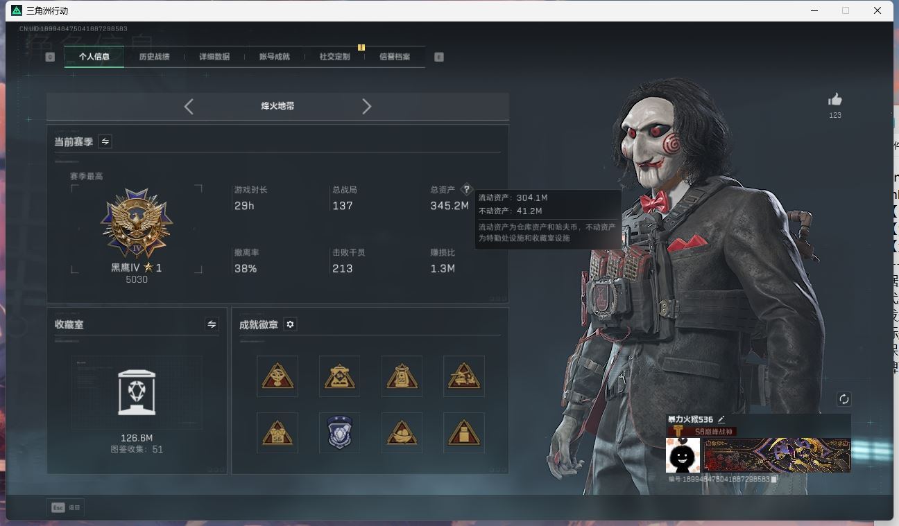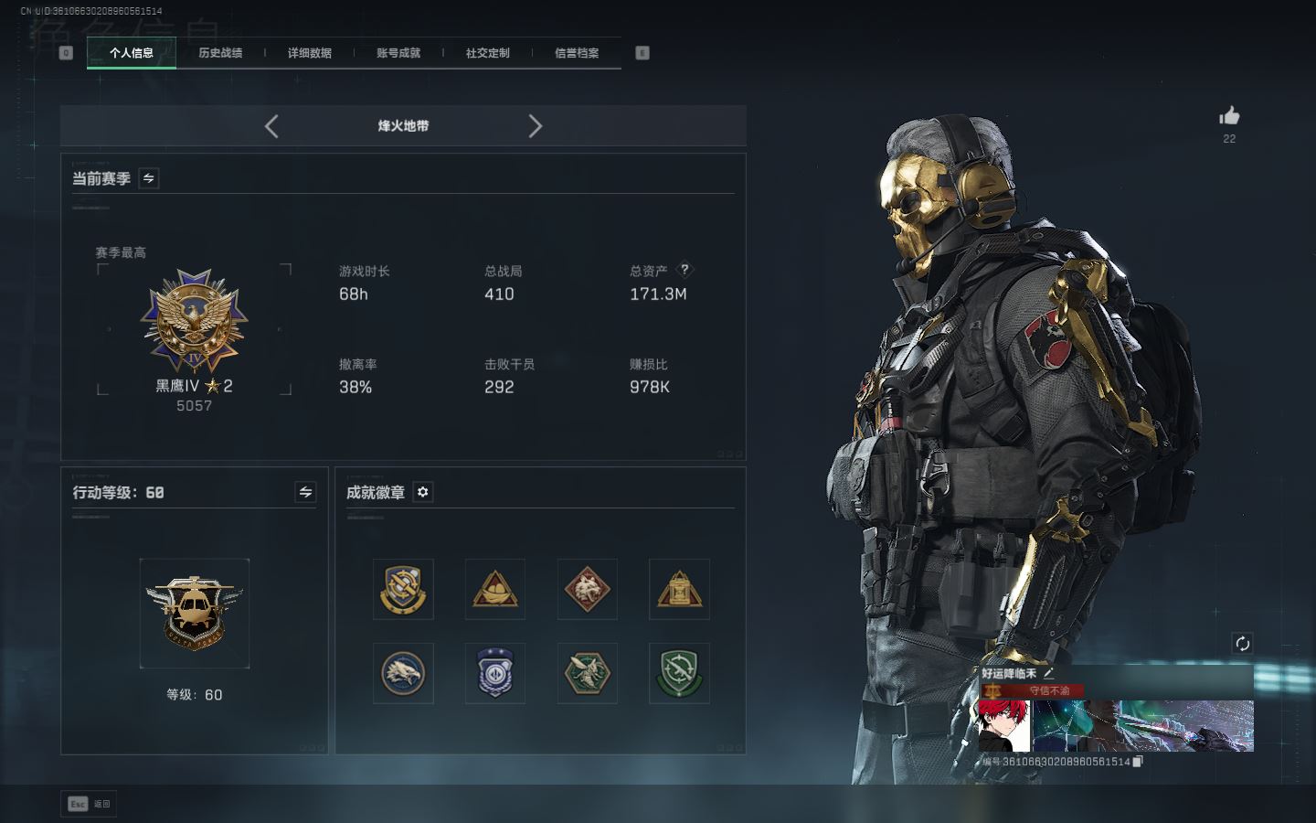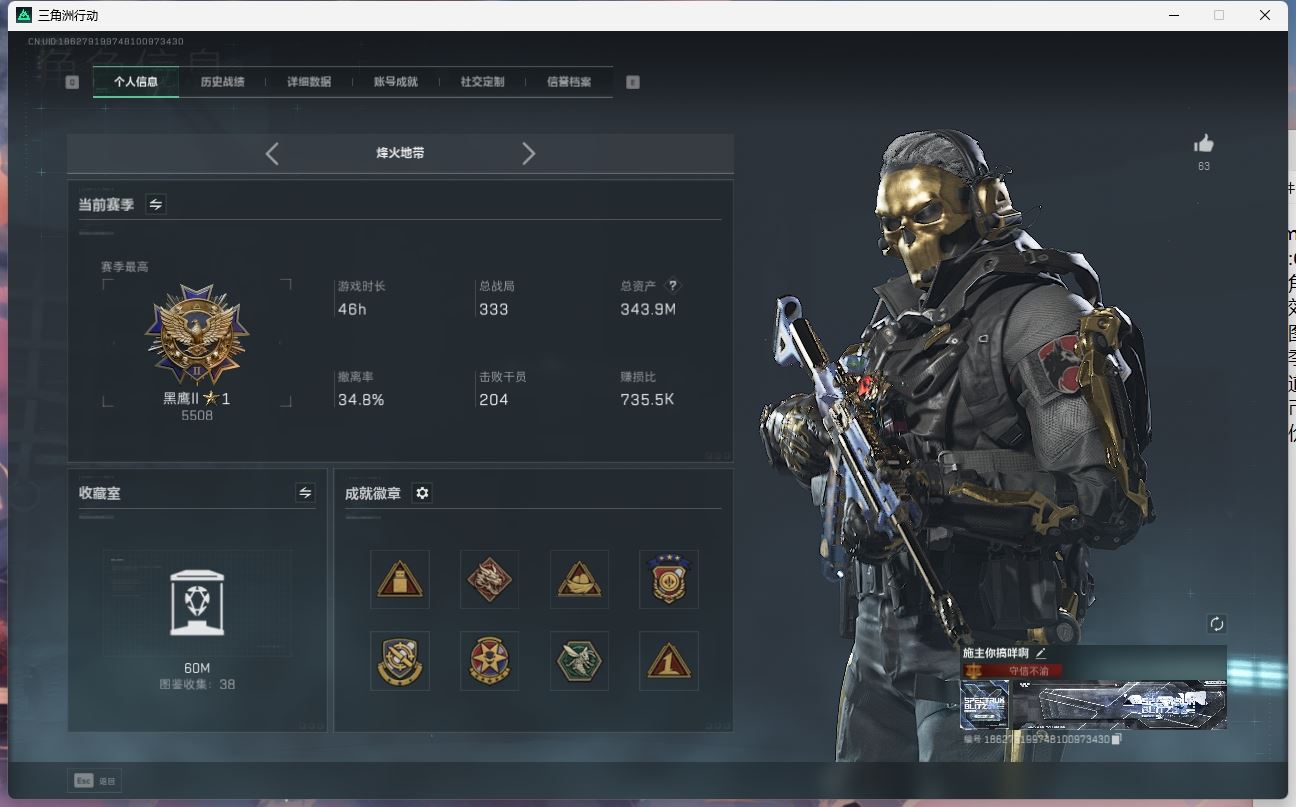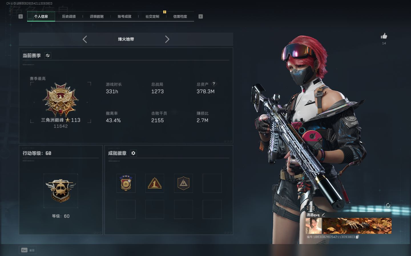 【账号佳】 ljh AK027599 包人脸 行动等级60黑鹰 总资产171.3m 满体s7赛季3*3【KC17突击步枪-电锯惊魂G3战斗步枪-骑士M250通用机枪-骑士之心M4A1突击步枪-蚀金玫瑰ASh-12战斗步枪-鹅鸭杀0C0171冲锋枪-鹅鸭杀0JB201轻机枪-鹅鸭杀 联动M4A1突击步枪-阿米娅联动勇士冲锋枪-能无使-午夜邮差5M19N腾龙突击步枪-捞点薯条AWM狙击步枪-捞点薯条 K437突击步枪-北极星QCQ171冲锋枪-北极星联动CAR-15突击步枪-阿米娅联动 复合弓-黑-天际线 】【近战 北极星 黑鹰】【角色皮肤 红狼-蚀金玫瑰 红狼-电锯惊魂 蜂医-送葬人无题密令 深蓝-不破誓约 露娜-黑天际线 】----安全箱等时效性道具请以游戏内数据为准:详情请看图----截图展示段位不代实际段位,赛季更新等不可抗拒因素发生变化、时限道具不保证所剩时间、标题未写送三角币默认不送】【主播担保+安全至上+性价比 买号卖号只选金牌商家一左友】